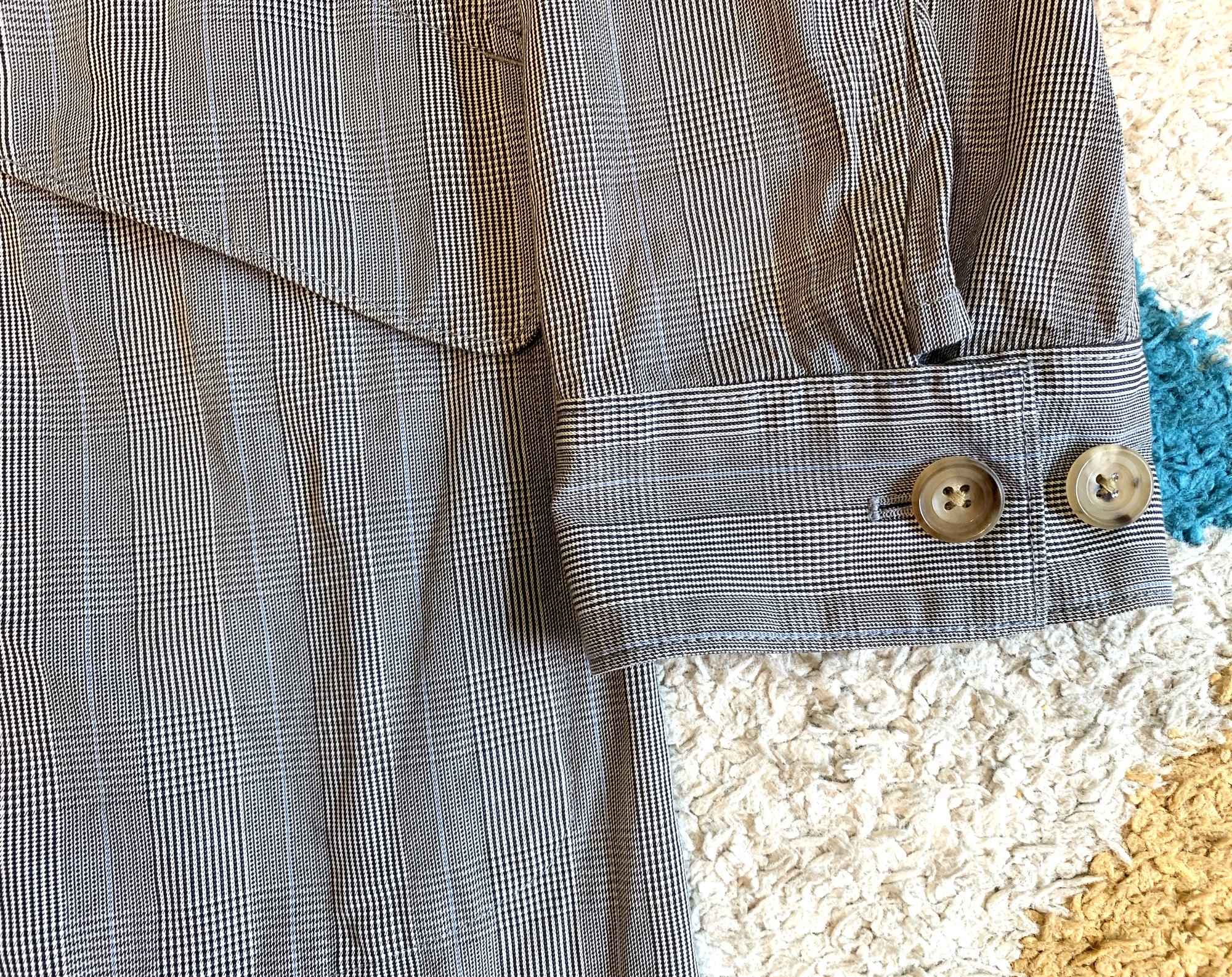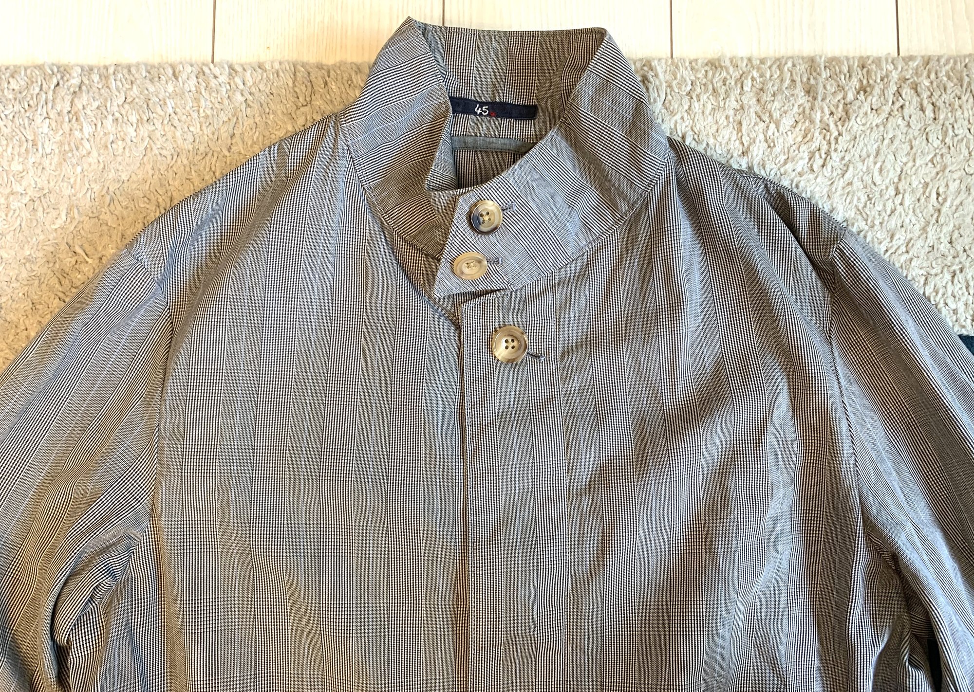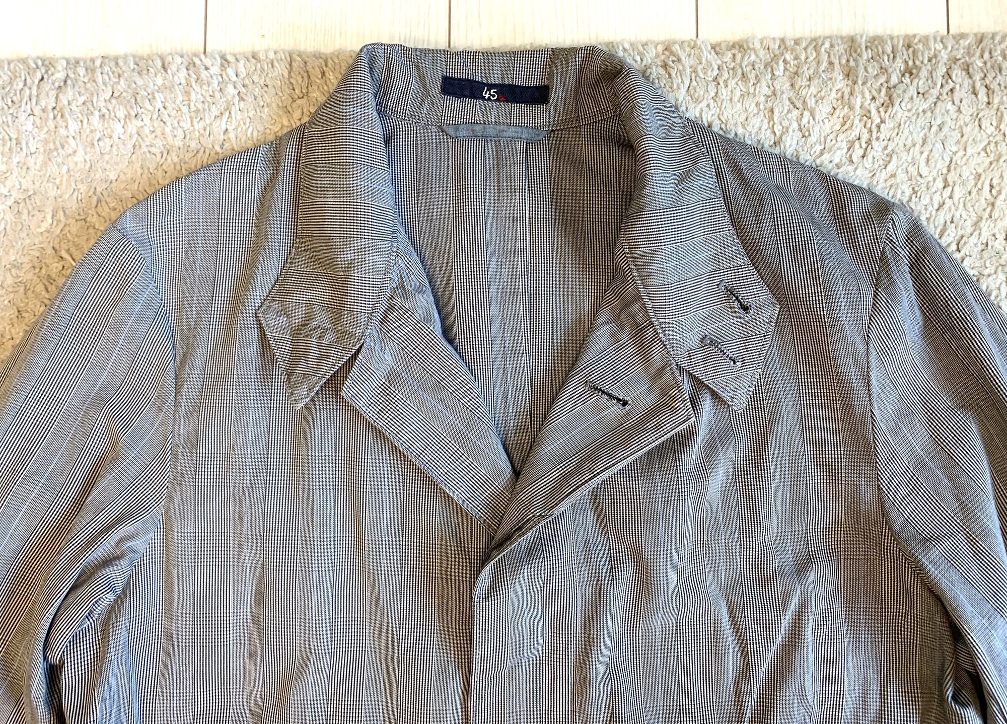 This jacket is very much in 45 rpm’s aesthetic, where they adopt a menswear staple and tweak most aspects of it. Silhouette is based on the classic over coat, but fit and materials are both updated quite a bit here. Fabric is 100% cotton, coming in a fairly light weight knit plaid design. There is a very nice texture to the fabric, where on close inspection you can see all of the individual fibers making up the knit. 45 rpm is not one to cut corners and their fabrics always take center stage.