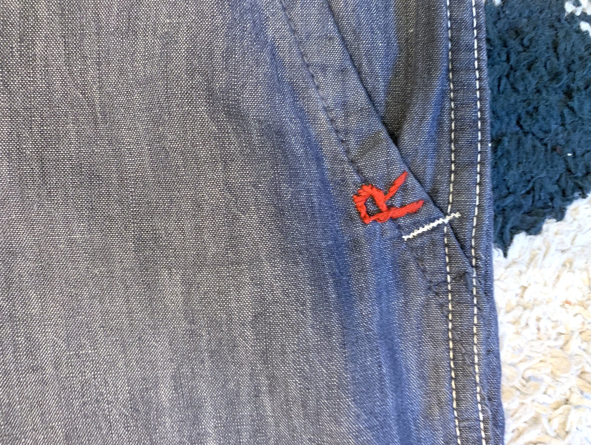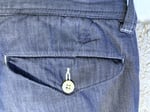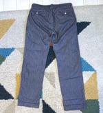 These are 45rpm’s lightweight summer cut, I would guess around an 8oz fabric or so. Material a 75% cotton / 25% linen blend in their characteristic uneven knit, likely done on an old-school shuttle loom. With wear the pants will gradually fade, developing patina totally unique to the wearer. That’s part of the fun with these kinds of pieces. 45 rpm also differentiates itself with the detailing. All kinds of details are added here, including contrasting red and white stitching throughout, a zip fly, custom buttons on the waistband and rear pockets, coin pocket and an embroidered “R” logo in red on the front and in blue near the rear right pocket.