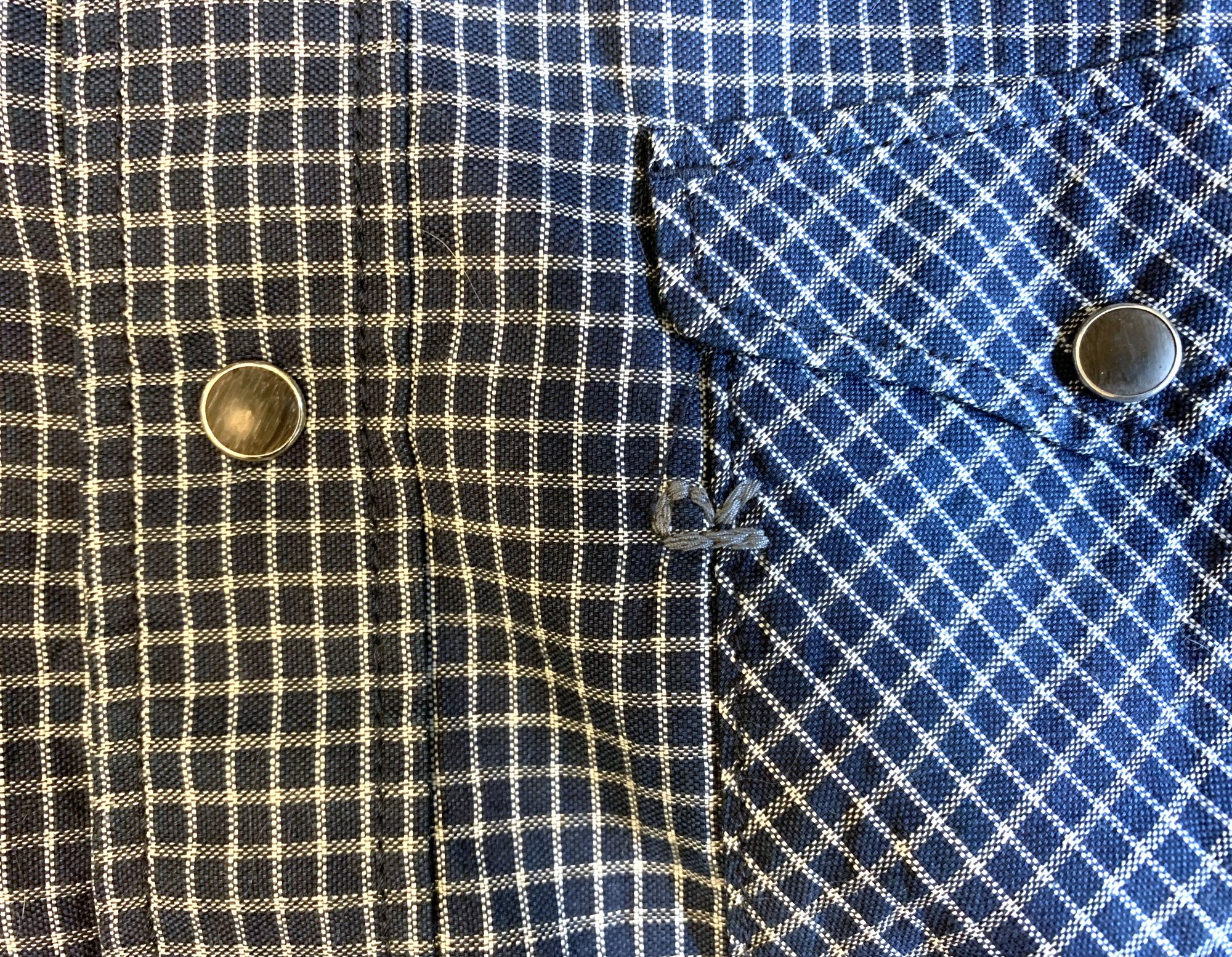 Dye aside, material is a very soft, fairly light weight cotton weave. The weave itself is nicely uneven, likely done on old-school shuttle looms as 45 rpm is known to use. Buttons are western-style snaps, with the buttons on the left cuff done in red, white and blue just for fun. The “R” logo is embroidered in blue on the left chest pocket. Interior shoulders are lined in a denim chambray fabric. Also features an indigo dyed, woven neck tag.