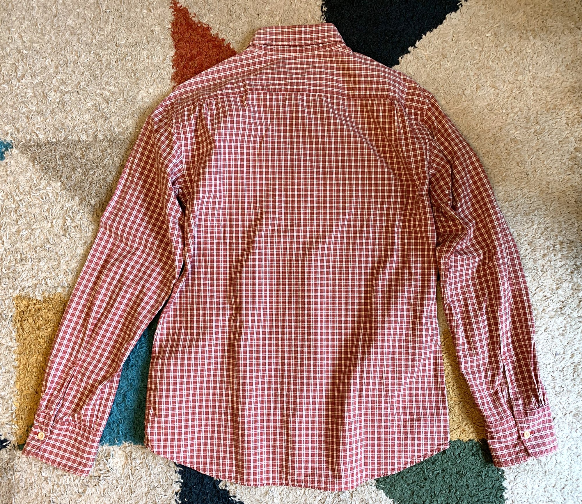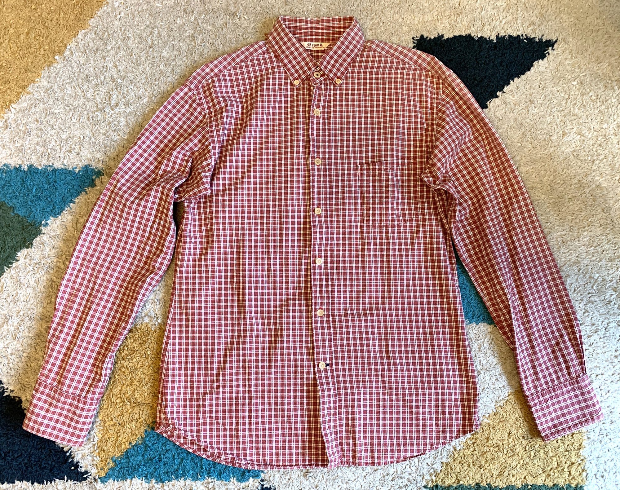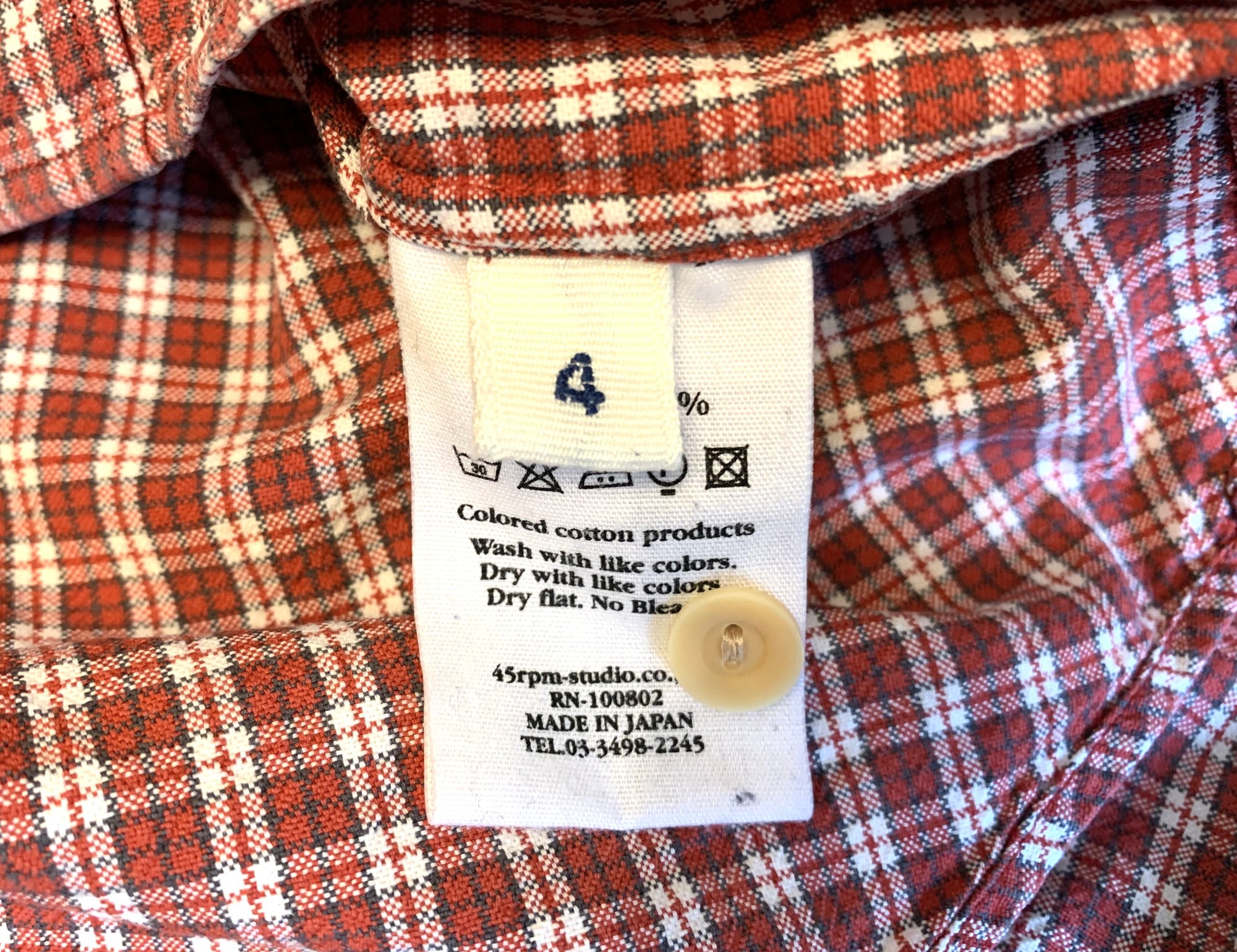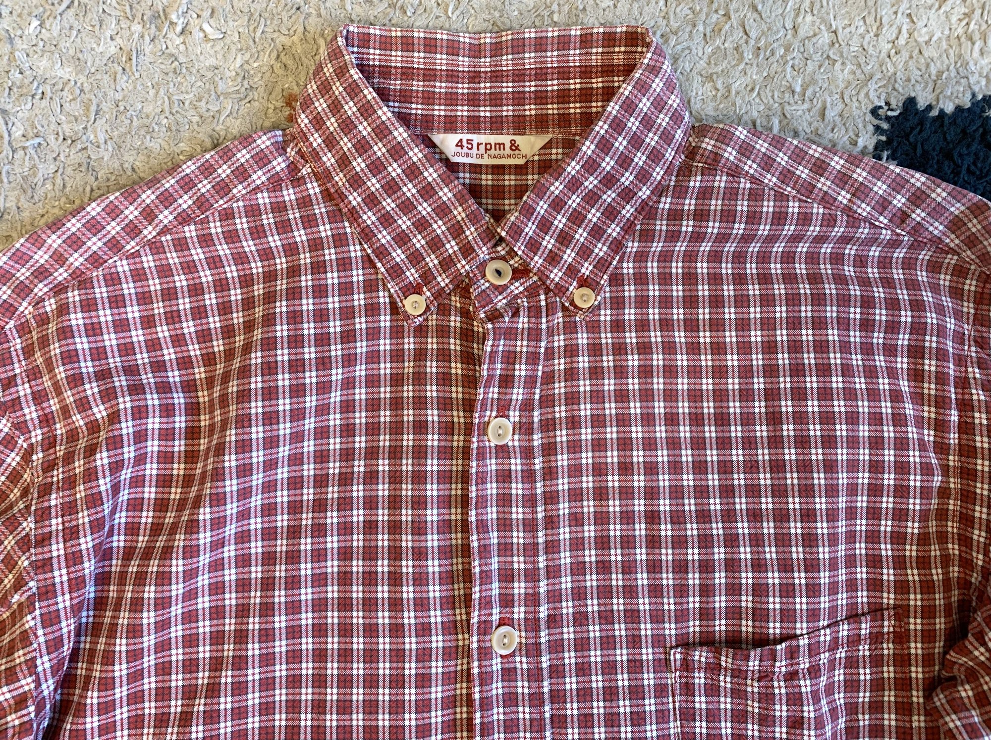Up for sale here is a button down shirt from 45 rpm. This is classic in the best sense, with a nice plaid design that’s unobtrusive and can go with pretty much everything. At the same time, the tailoring and quality are excellent, something 45 rpm excels at. 45 rpm always uses really interesting textiles, often with a unique texture. As with this shirt, these kinds of pieces are usually woven on vintage shuttle looms, making for a unique and really nice tactile experience. 45 rpm never comes cheap at retail, but you can be sure you are getting a top quality piece.
