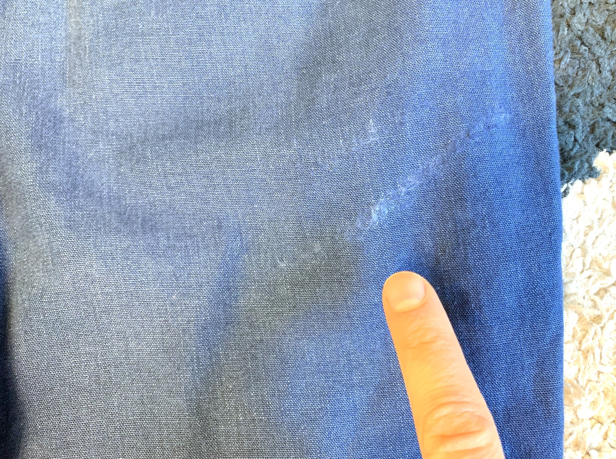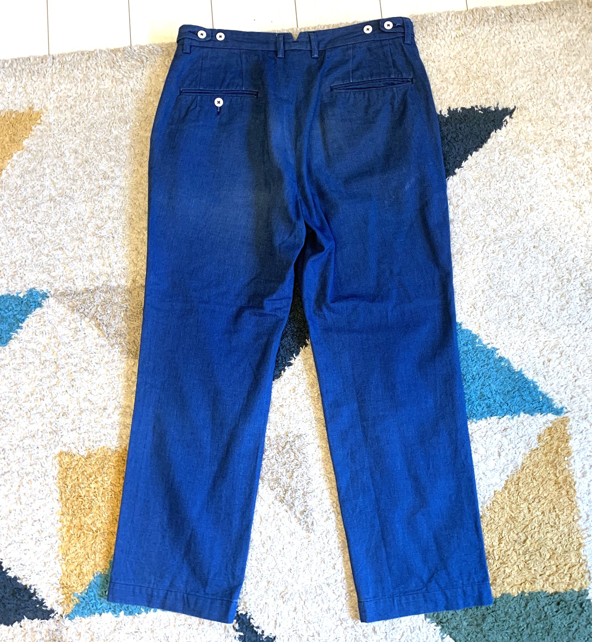 Size is labeled a medium and fits a 32 inch waist well. I measure the waist at 32” / 82cm, inseam at 26.5” / 67cm, rise at 11.5” / 29cm and leg opening at 8” / 2-cm. The pants come in lightly used, good shape. There is some minor fading and two points to note: the right thigh area has a small abrasion on the front and the rear right leg has some wear (both are pictured). Otherwise no issues. Made in Japan.