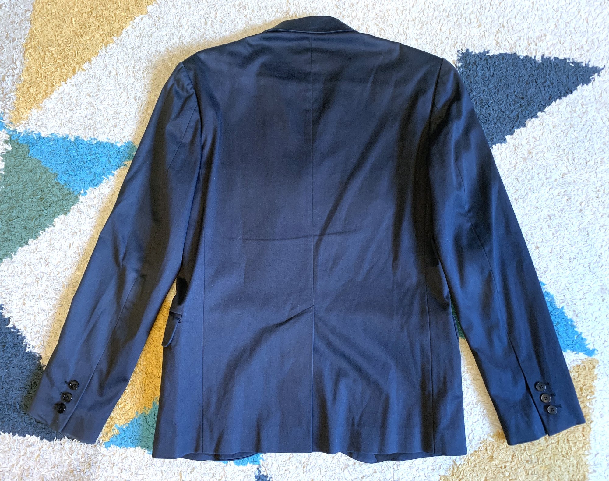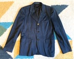 This is one of Agnes B’s many iterations of the classic blazer. It’s done here with a three button closure and a really nice dark blue fabric. Agnes B used to do their production almost entirely in France, sadly an increasingly rare thing these days. This is one of those higher quality made in France models. Exterior is a 70% cotton, 28% nylon, lycra fabric, while the interior is fully lined in a 96% viscose, 4% elastane blend. The nylon gives the exterior a bit more resiliency than your standard cotton, while there is a bit of stretch provided on the interior and exterior fabrics. Given the full lining, I would consider this a good year-round piece. It is maybe not great in the middle of summer but should otherwise cover you well on its own or layered under a coat in the winter.