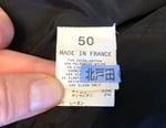 Size is labeled a 50 and fits like a standard medium. I measure the chest at 20” / 51cm, shoulders at 18” / 46cm, length at 30.5” / 77cm from the base of the neck, and sleeves at 26” / 66cm from the shoulder. The jacket comes in lightly used, very good shape with no holes, tears or stains. Made in France.