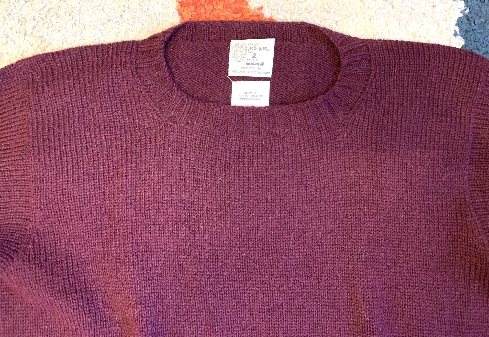 Bedwin are definitely able to take advantage of the high quality wool, and opt to keep things mostly traditional here. The big exception, perhaps, is the unique colorway. You probably won’t find too many traditional Scottish wools in this kind of a red. Other more subtle details include a custom “handmade in Scotland” tag at the bottom, crew neck, and Bedwin tags inside. Interior also has a tag noting that Wilma made this particular sweater.