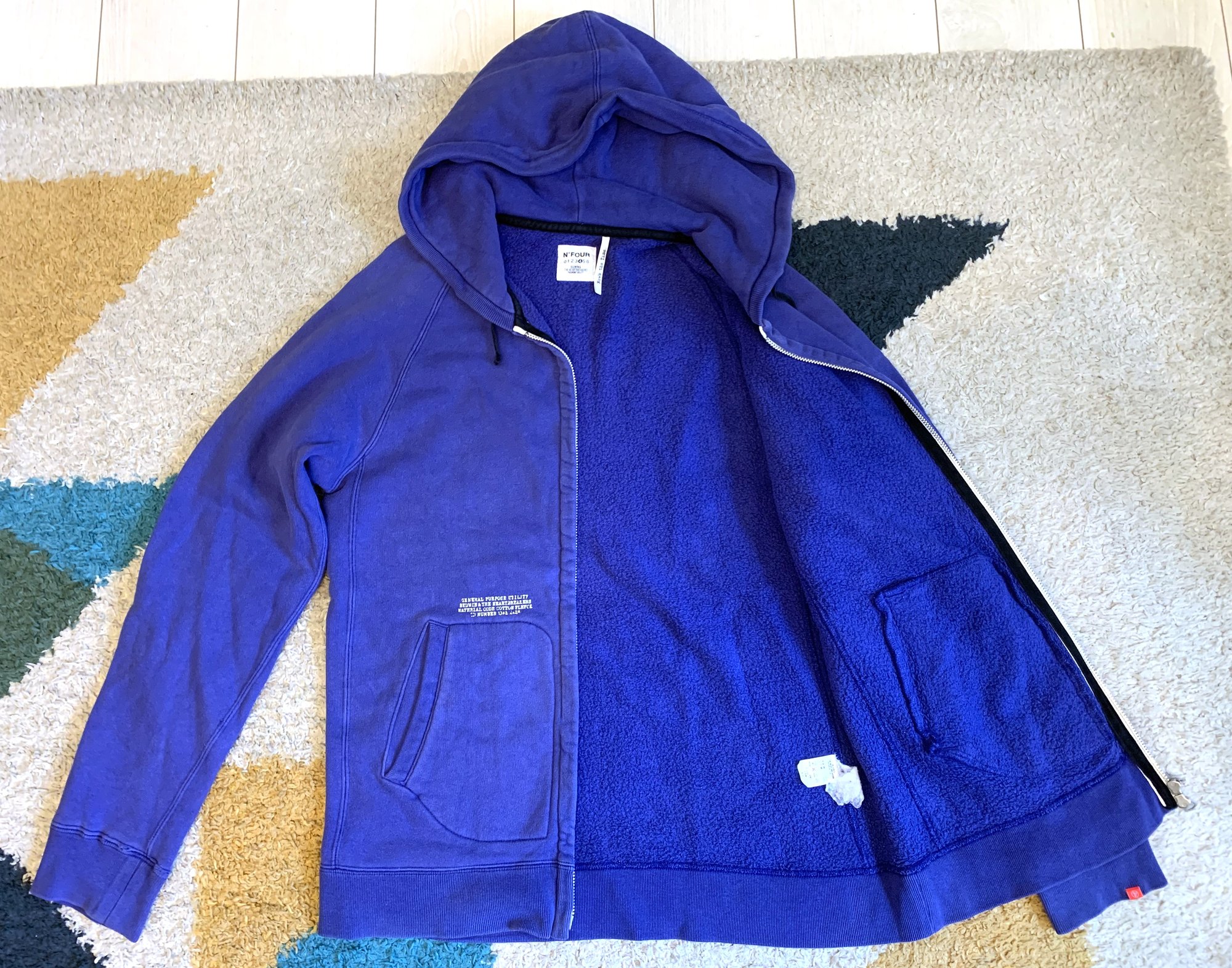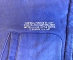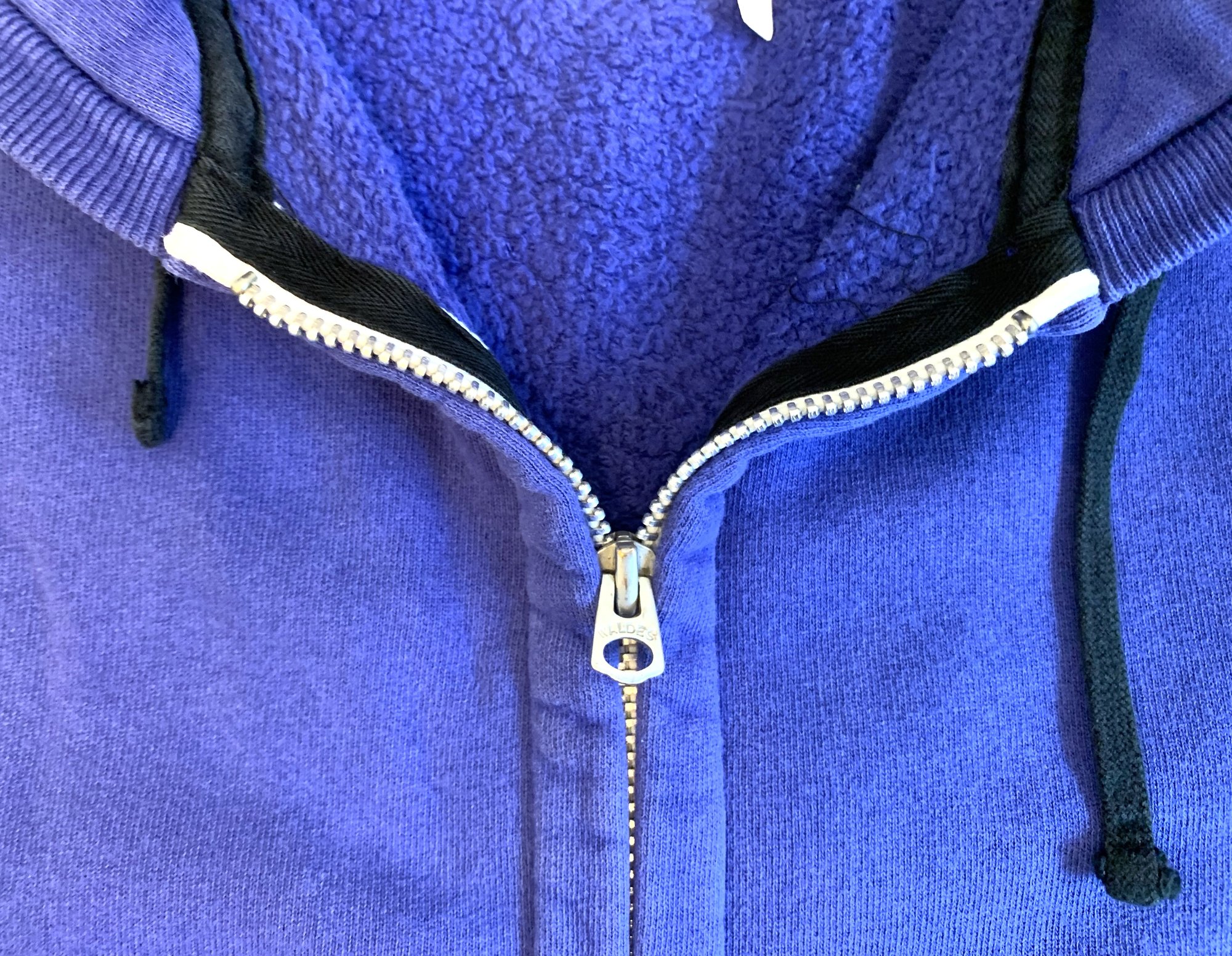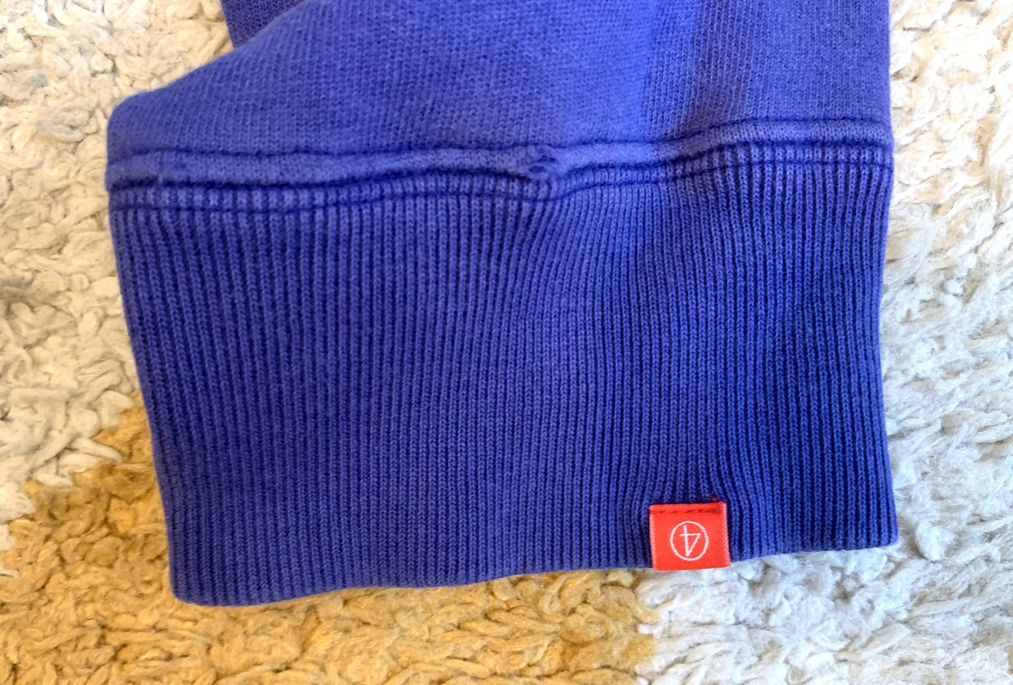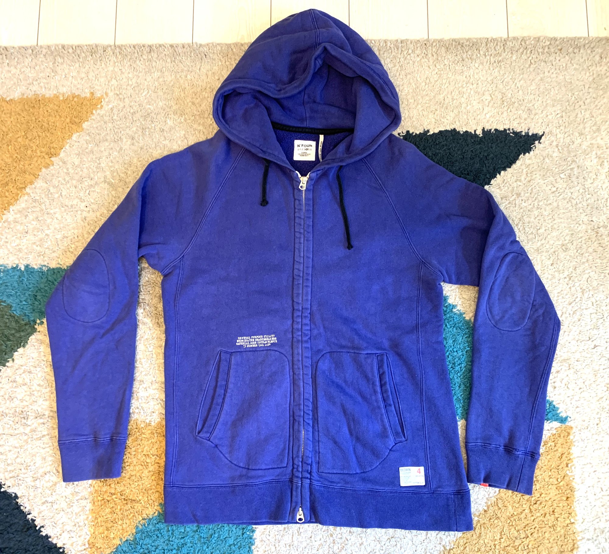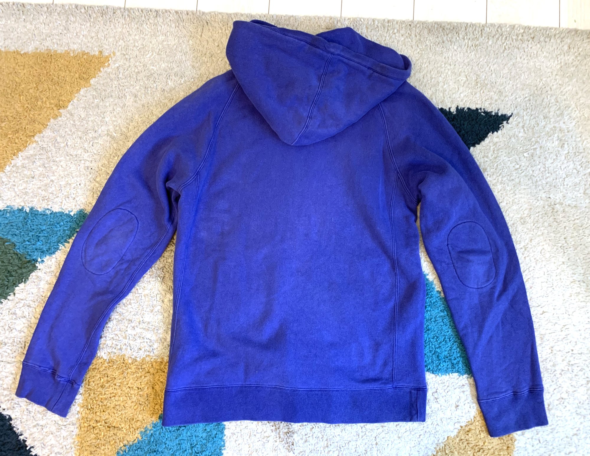 So in this case we have a medium-light weight blue hooded sweater, Bedwin’s take on the classic hoody design. This one is arguably in the higher tier of hoodies, where the quality is really excellent. Details are pretty classic, but there are a few little tweaks. Front has a double zip closure, black drawstring on the hood, small tag on the front, reinforced elbows, and logo stamped on the front. Neck tag has an additional “now’s the time” tag. For a while Bedwin was including these tags as musical references for their collections. This tag is a reference to the Charlie Parker song which seemingly inspired the collection.