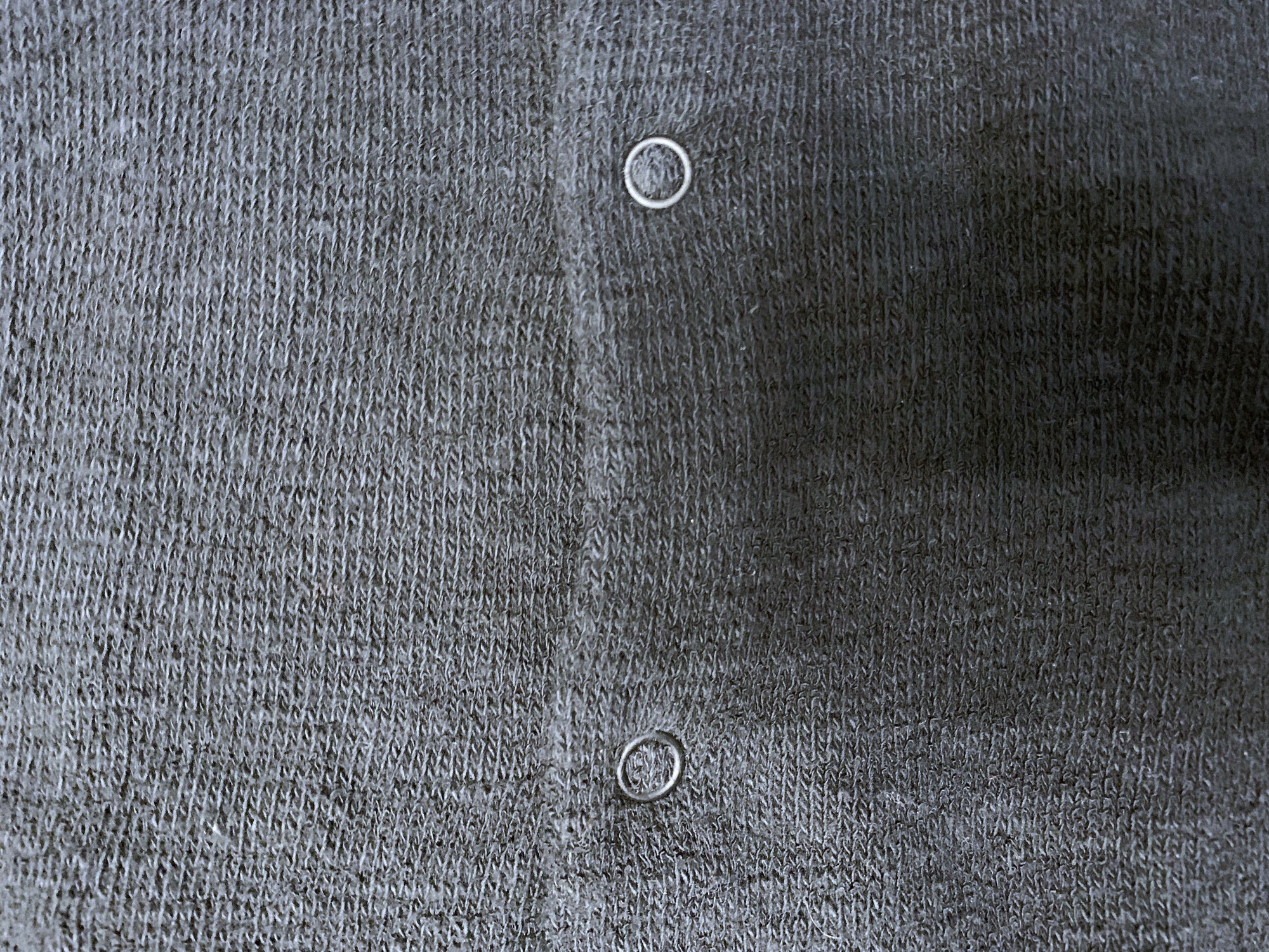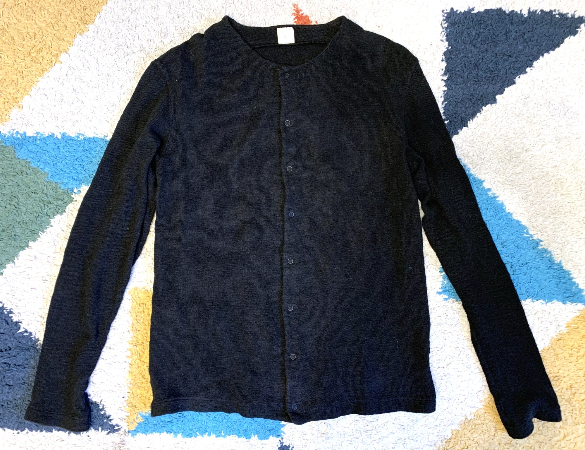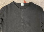 This is a snap button cardigan coming in a highly textured cotton fabric. As you can see in the pics, there is quite a bit of depth to the material, the sort of thing you see coming from low tension shuttle looms. Modern looms are simply incapable of making this kind of material and that really sets labels like Bru Na Boinne apart. Silhouette is somewhat longer than a more standard cardigan, with long sleeves that can be worn bunched up or rolled to your preference.