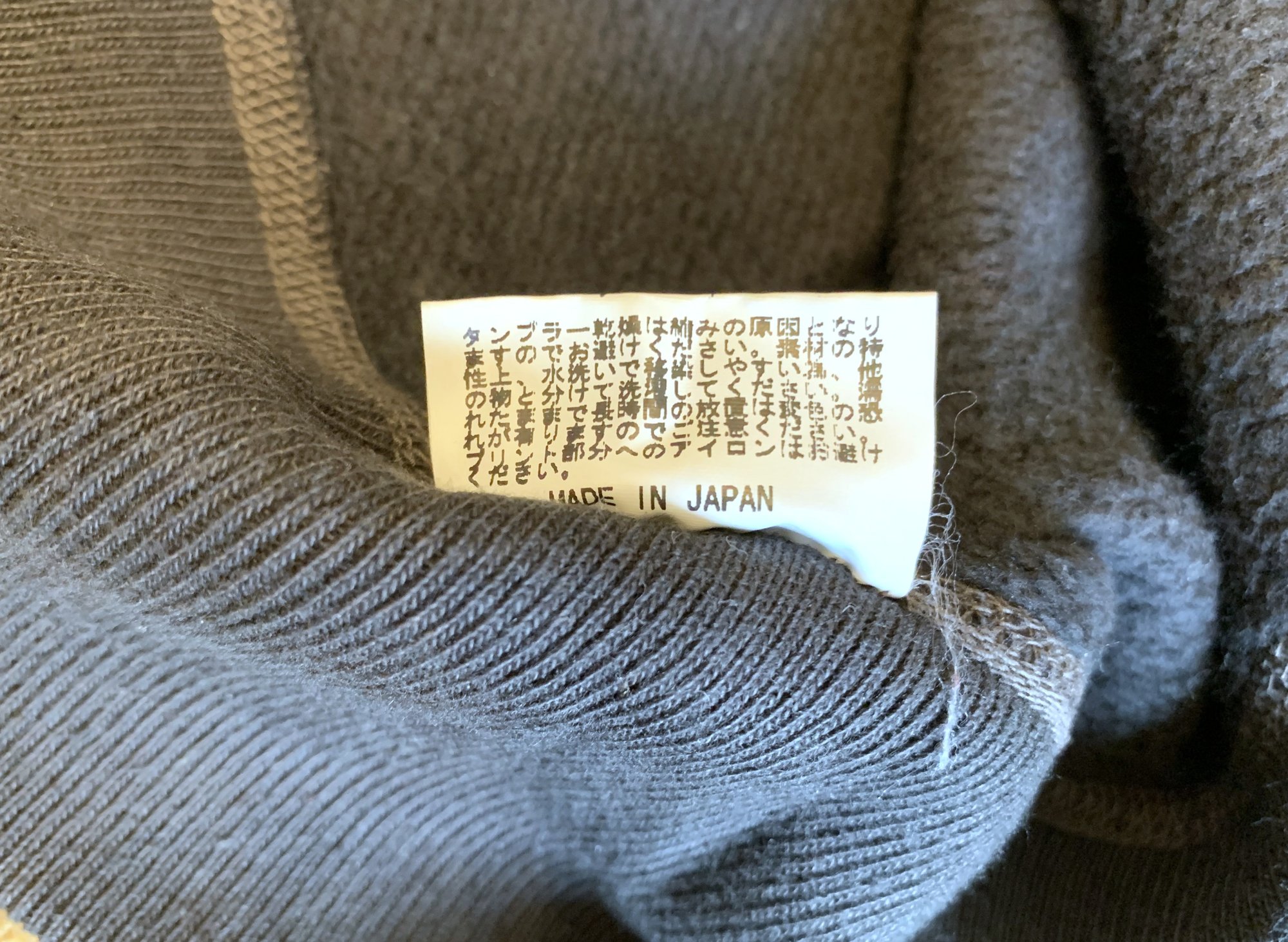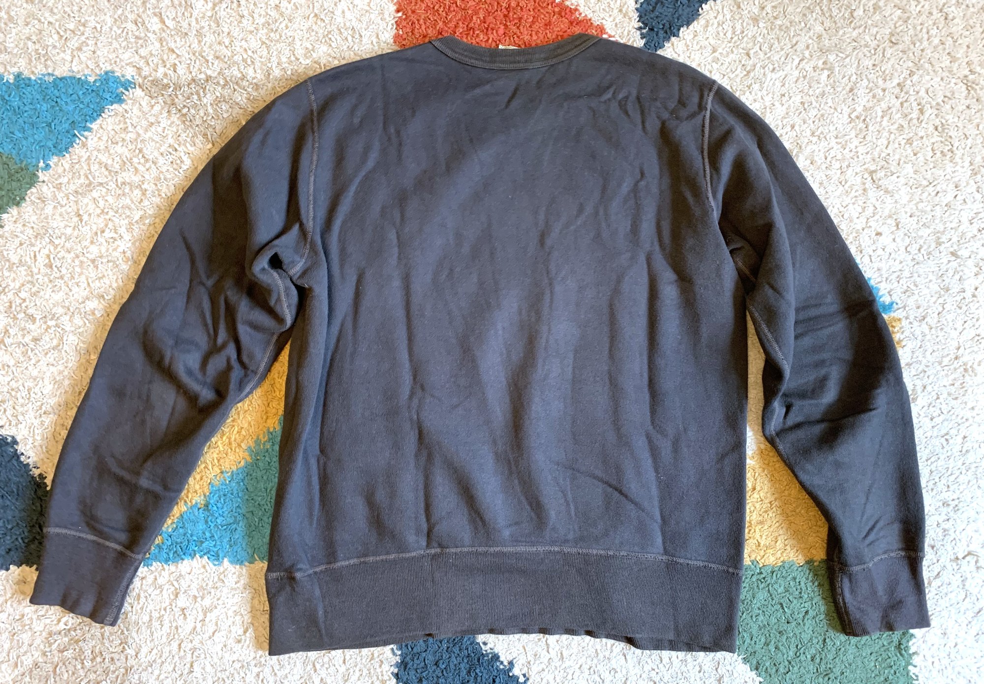 Size is labeled a medium and fits true. I measure the chest at 21” / 54cm, shoulders at 17” / 44cm, length at 25” / 62cm and sleeves at 25” / 63cm from the shoulder. The sweater comes in used, generally good shape. There is some fading to the fabric as you can see, visible on the body and neckline. This is actually an intended part of the design. These sweaters are produced with fading dyes, where like a good pair of denim this sweater will pleasantly fade and develop with wear. Aside from the fading there are no holes, tears or stains. Made in Japan.