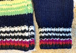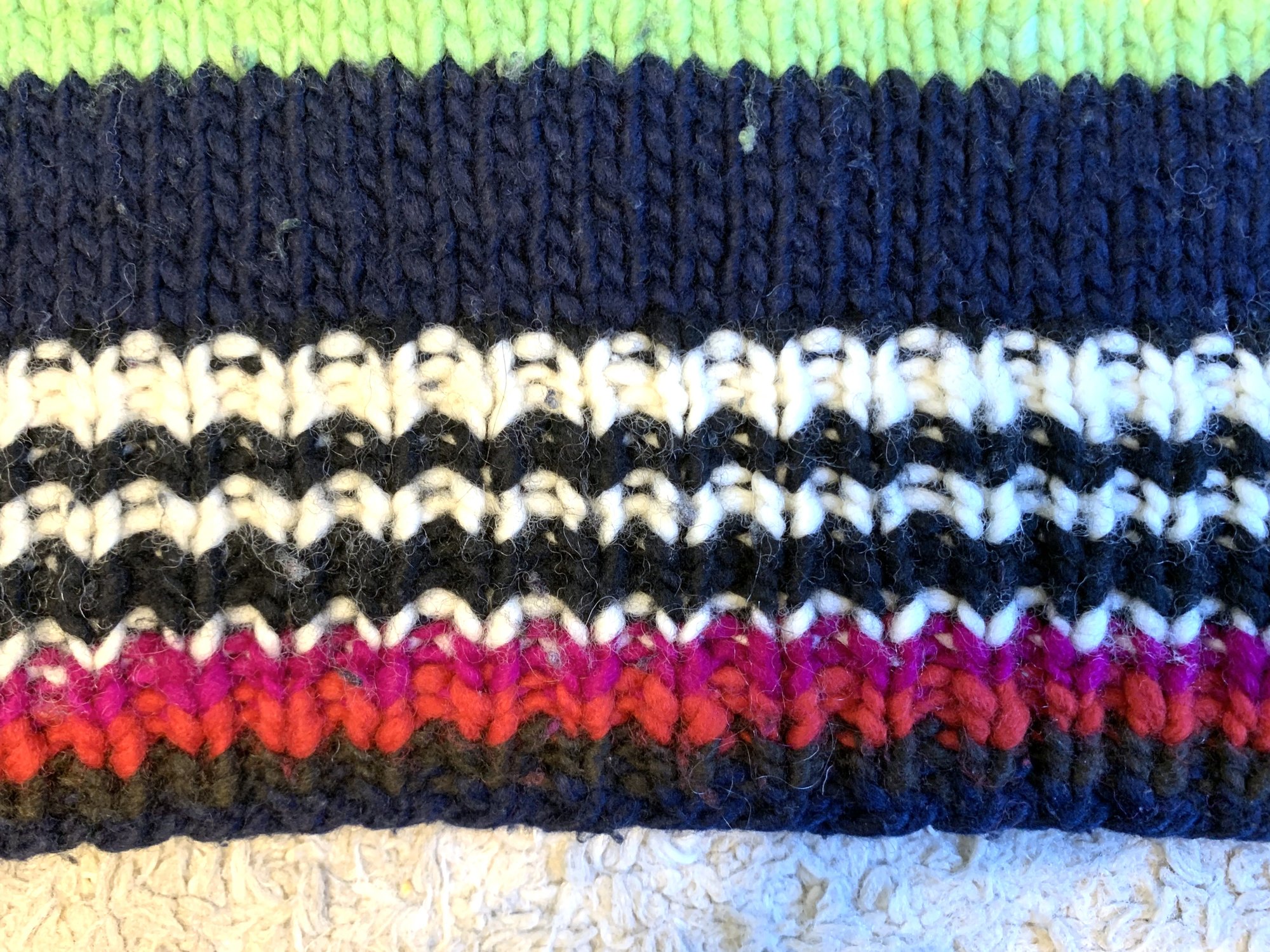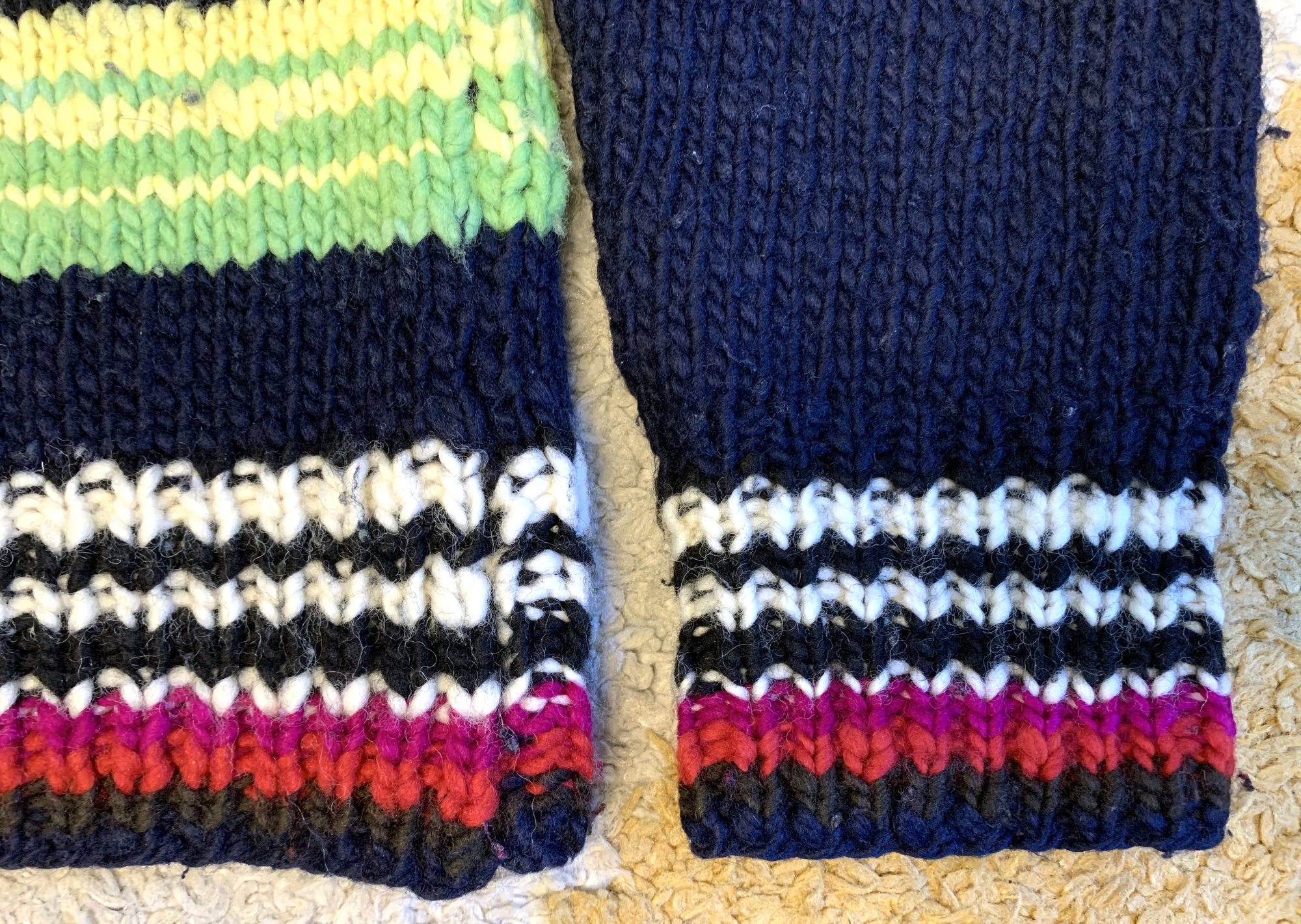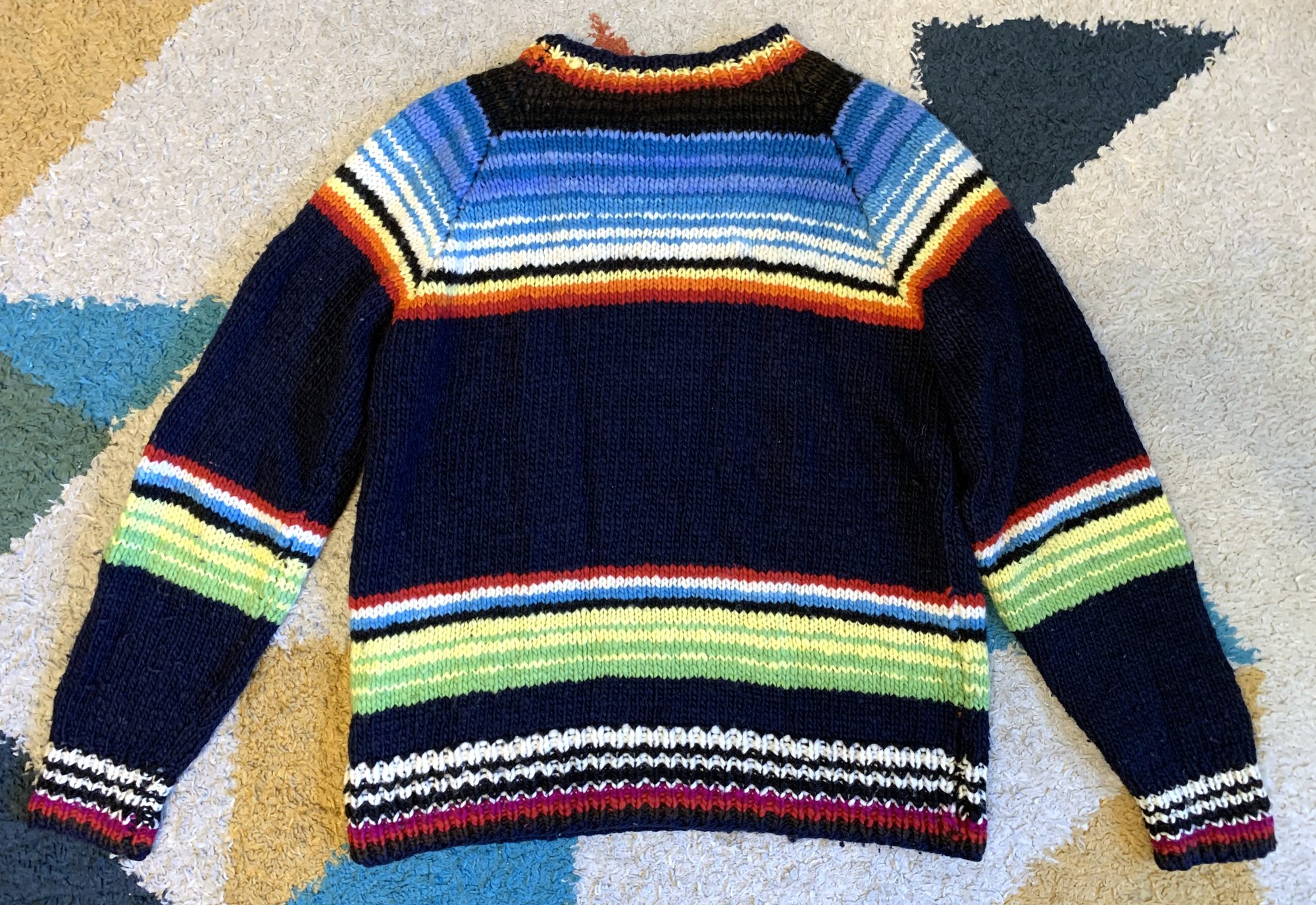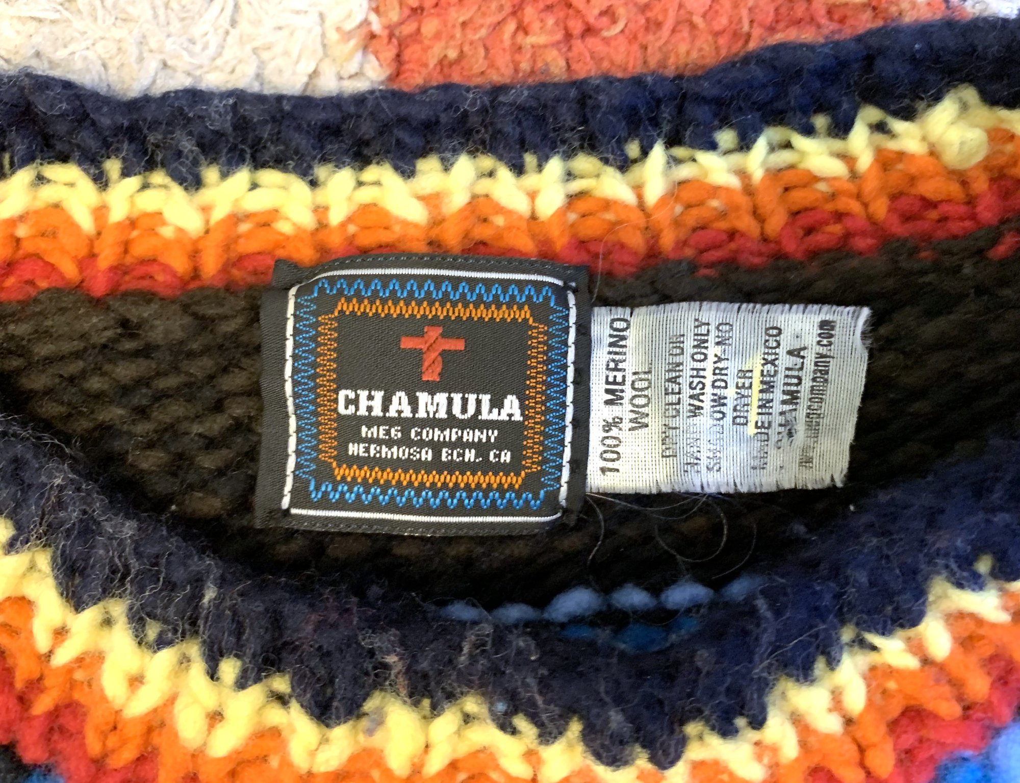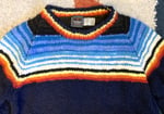This is Chamula’s “serape pullover” sweater. Body is black while there are bands of different colored stripes woven throughout. Material is 100% merino wool. Chamula reportedly only uses wool from sheep grazing in the Mexican mountains, using hand-spun merino yarns and hand dyeing them. Chamula knitwear is just about as close as you can get to a fully handmade garment.