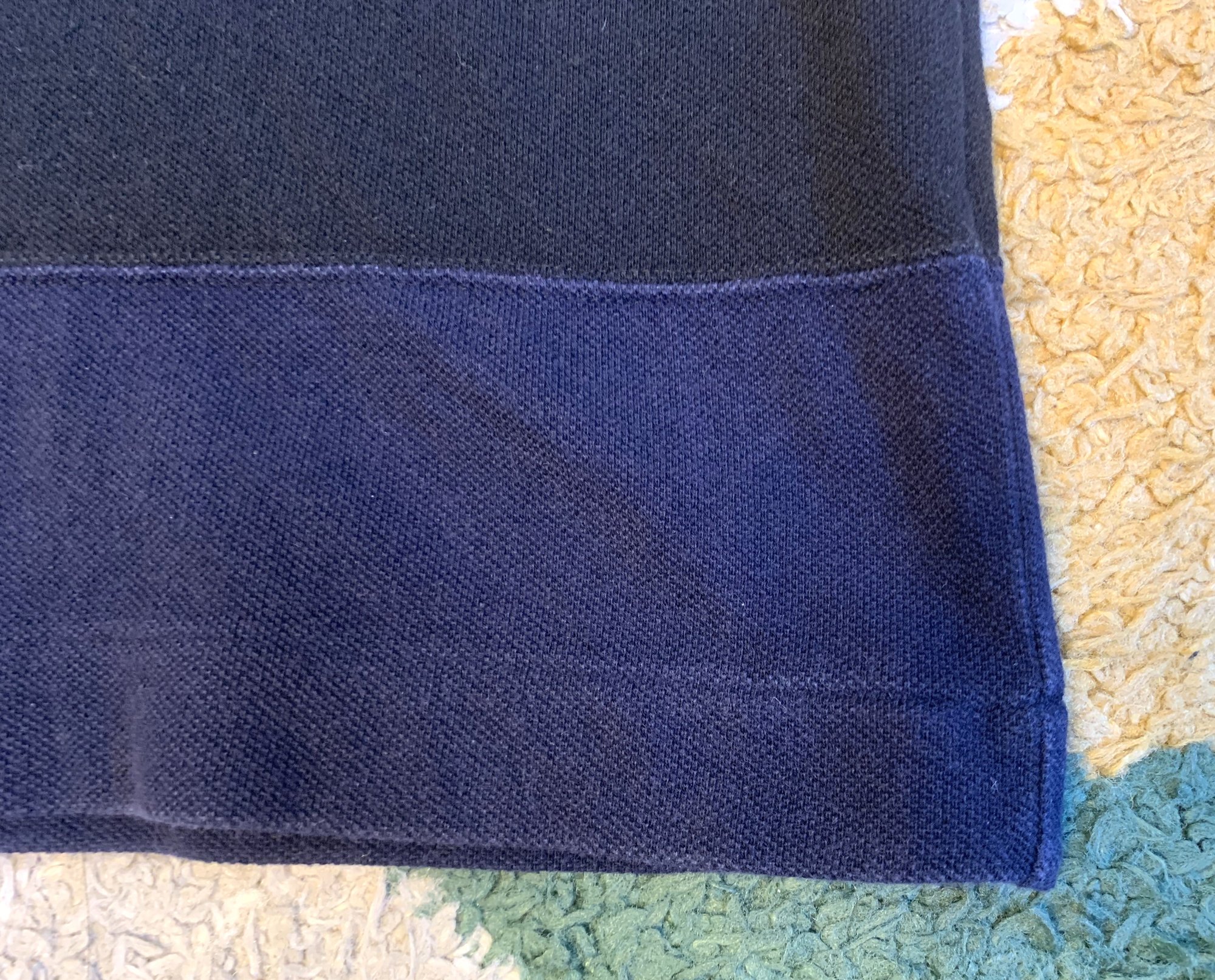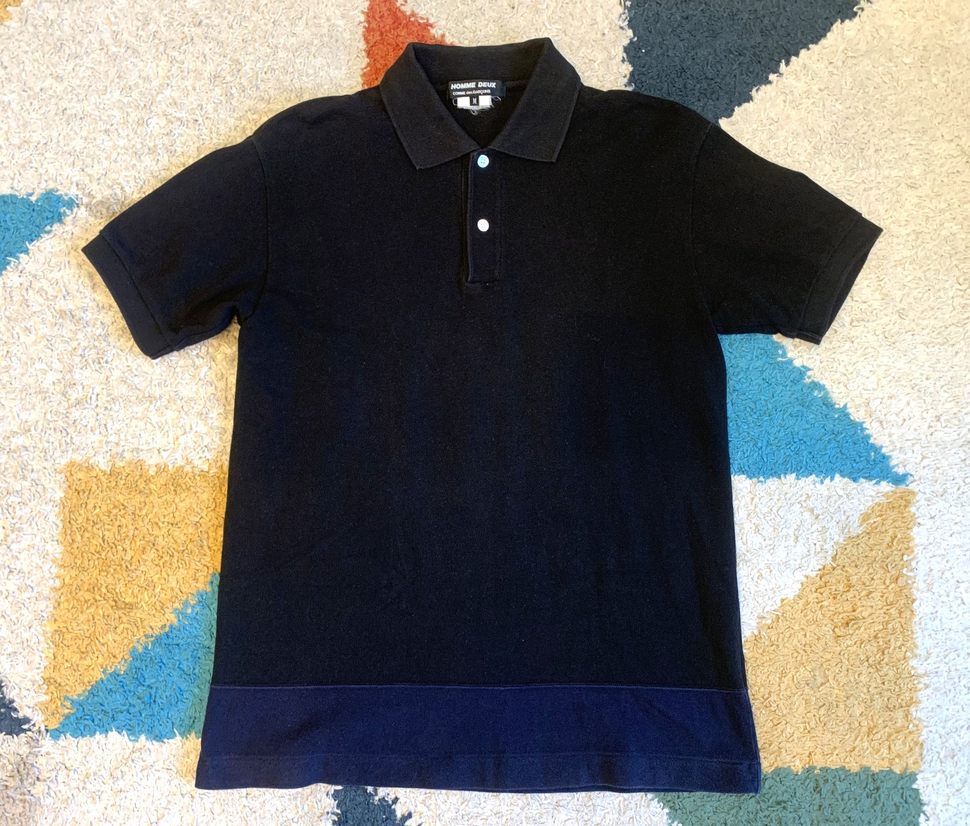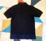 This shirt comes from 2013, I believe the spring-summer collection. Design is a classic polo shirt silhouette, where the main material is a knit cotton in black. The twist comes with the incorporation of a complimentary dark navy blue panel at the bottom of the shirt. It is enough of a pop of color to differentiate itself – it is smart but at the same time nothing that is going to be immediately shocking or polarizing. This should work equally well in a more formal or casual situation and can be easily integrated into a wide range of wardrobes.