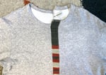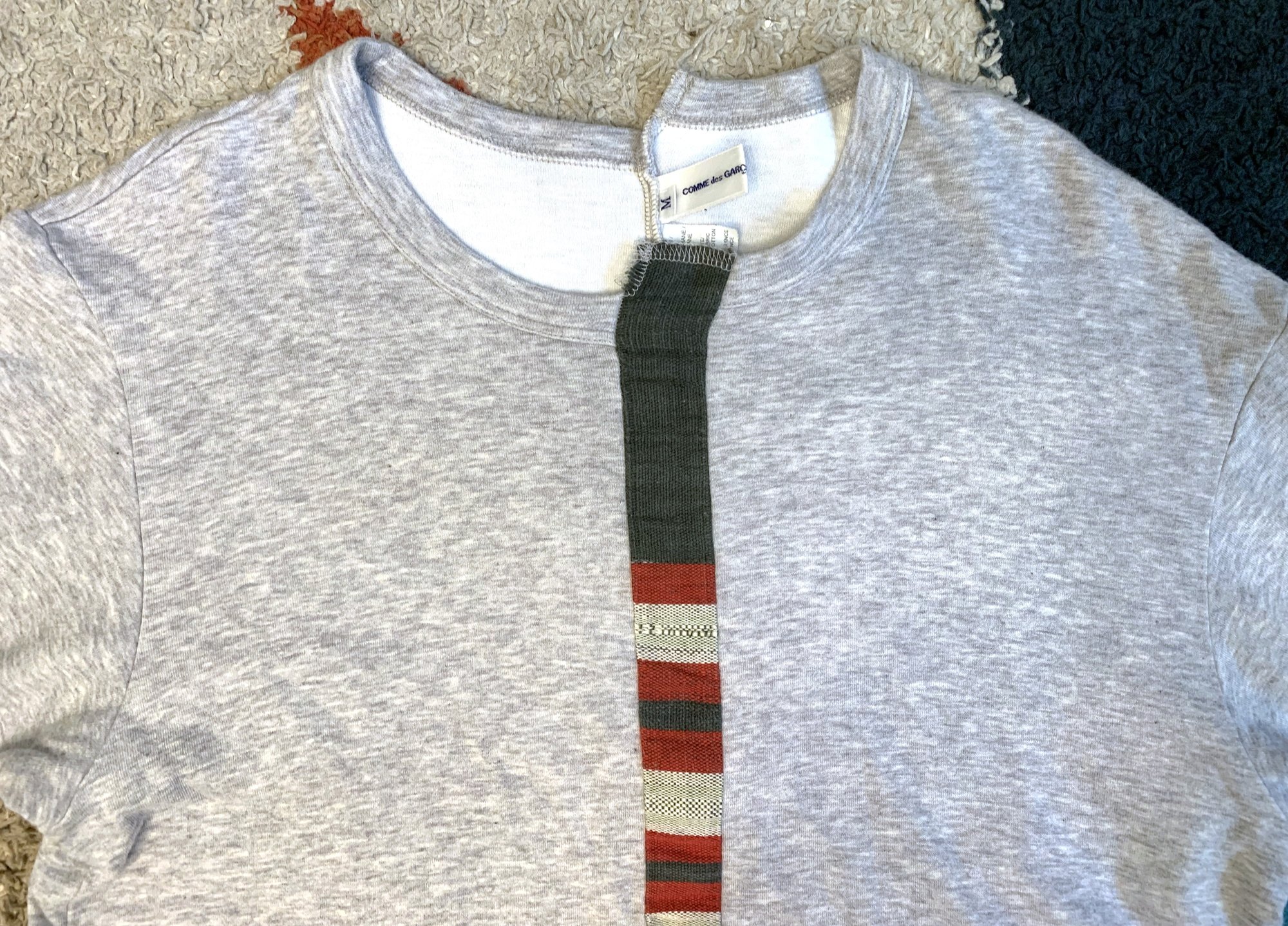 In this case we have a pretty unique iteration of the classic tee, given a somewhat skewed look. The body is a pretty straightforward gray tee, while the twist comes in the construction. Front has a patchwork style knit, while the body is asymmetrically constructed. If you notice on the center front and back seams they are slightly askew on the top and bottom. The gray fabric comes in a 98% cotton, 2% polyurethane blend, while the more colorful knit portion is 100% cotton.