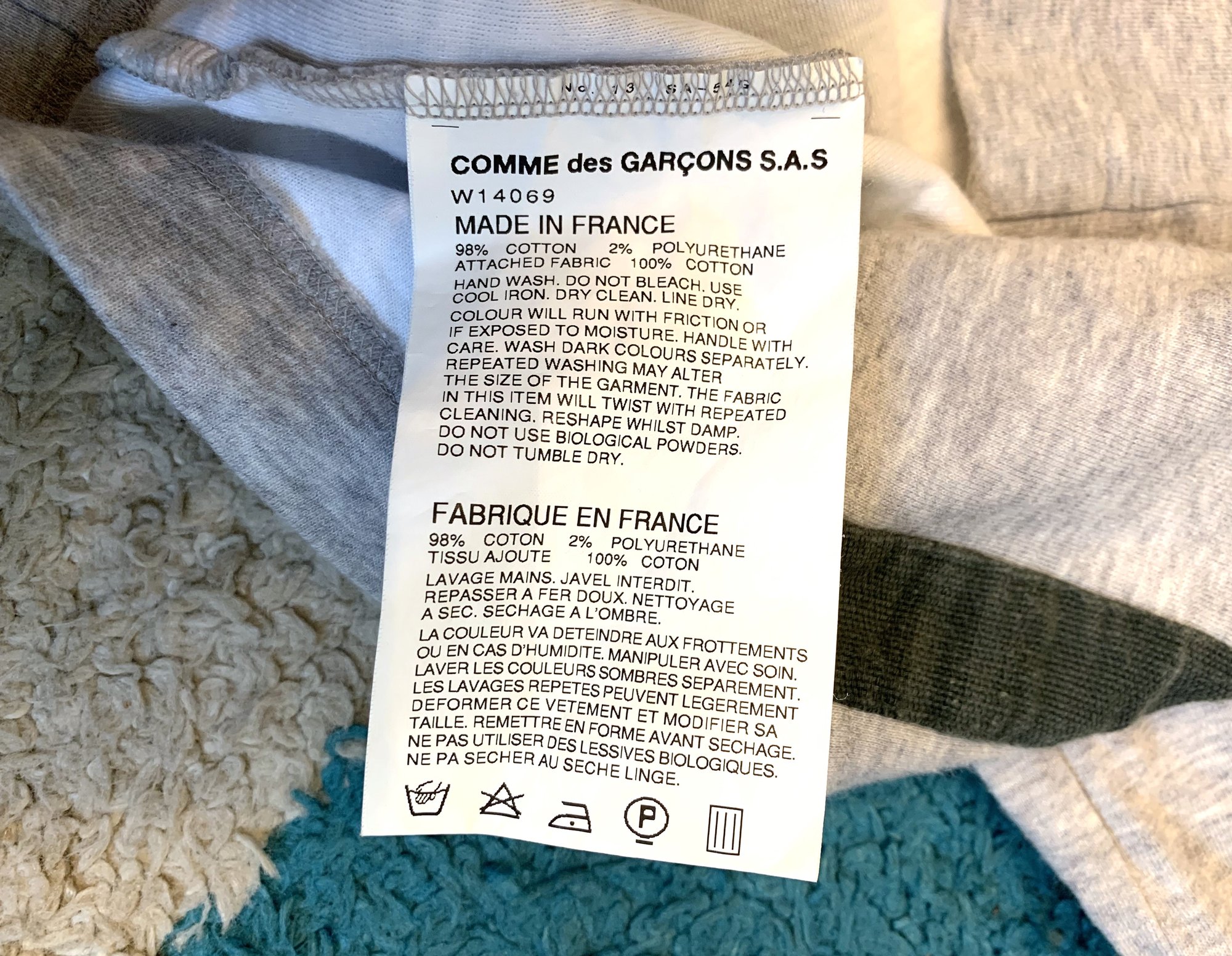 Size is labeled a medium and fits true if a bit slim. There is a bit of stretch to the fabric but unstretched I measure the chest at 19” / 48cm, shoulders at 18” / 46cm, and length at 25.5” / 65cm. The shirt comes in lightly used, very good shape with no holes, tears or stains. Made in France.