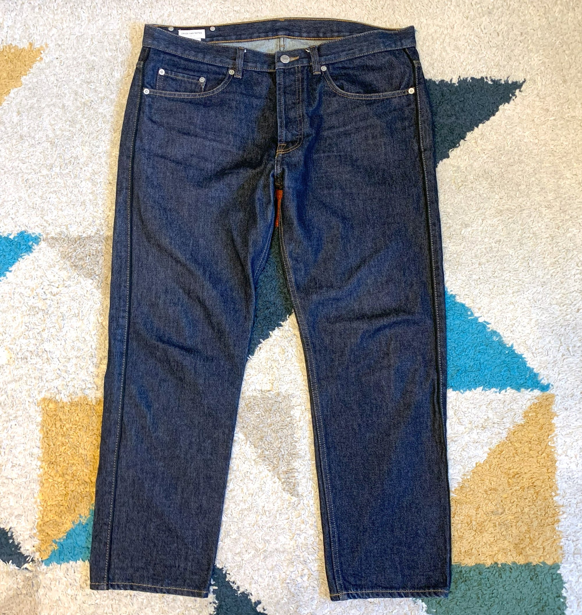 This is a pretty straight fit. There is a bit of a taper toward the ankle but otherwise nicely walks the line between slim and loose. Fit and tailoring are probably Dries’ strongest point and no expense was spared on the tailoring here. Other details include branded buttons on the waistband and fly, rivets throughout, and a branded leather tag on the rear waistband. Retail on DVN is never cheap. Current season pants run in the $400-$600 range. This is very likely the cheapest you will find one around.