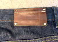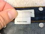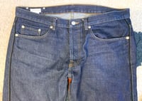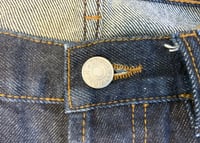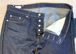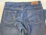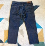 Size is labeled a 34 and fits a bit loose in the waist. I measure the waist at 36” / 94cm, inseam at 26” / 67cm, rise at 10.5” / 27cm and leg opening at 7.5” / 19cm. The pants come in lightly used, very good shape. There is some minor fading of the indigo but otherwise no holes, tears or stains.