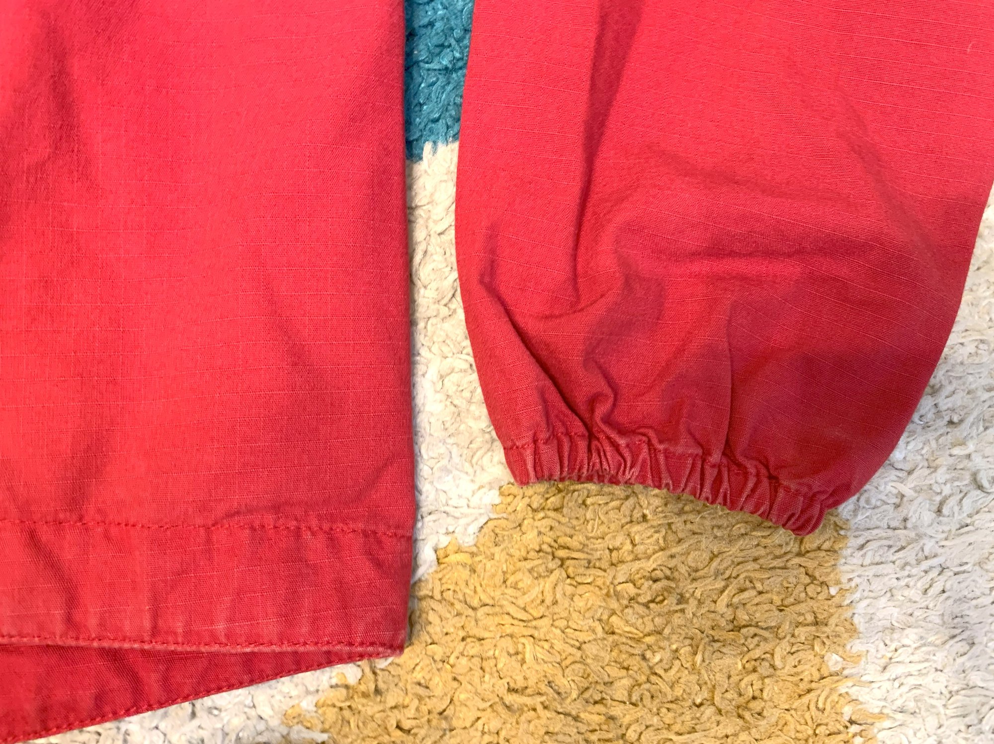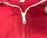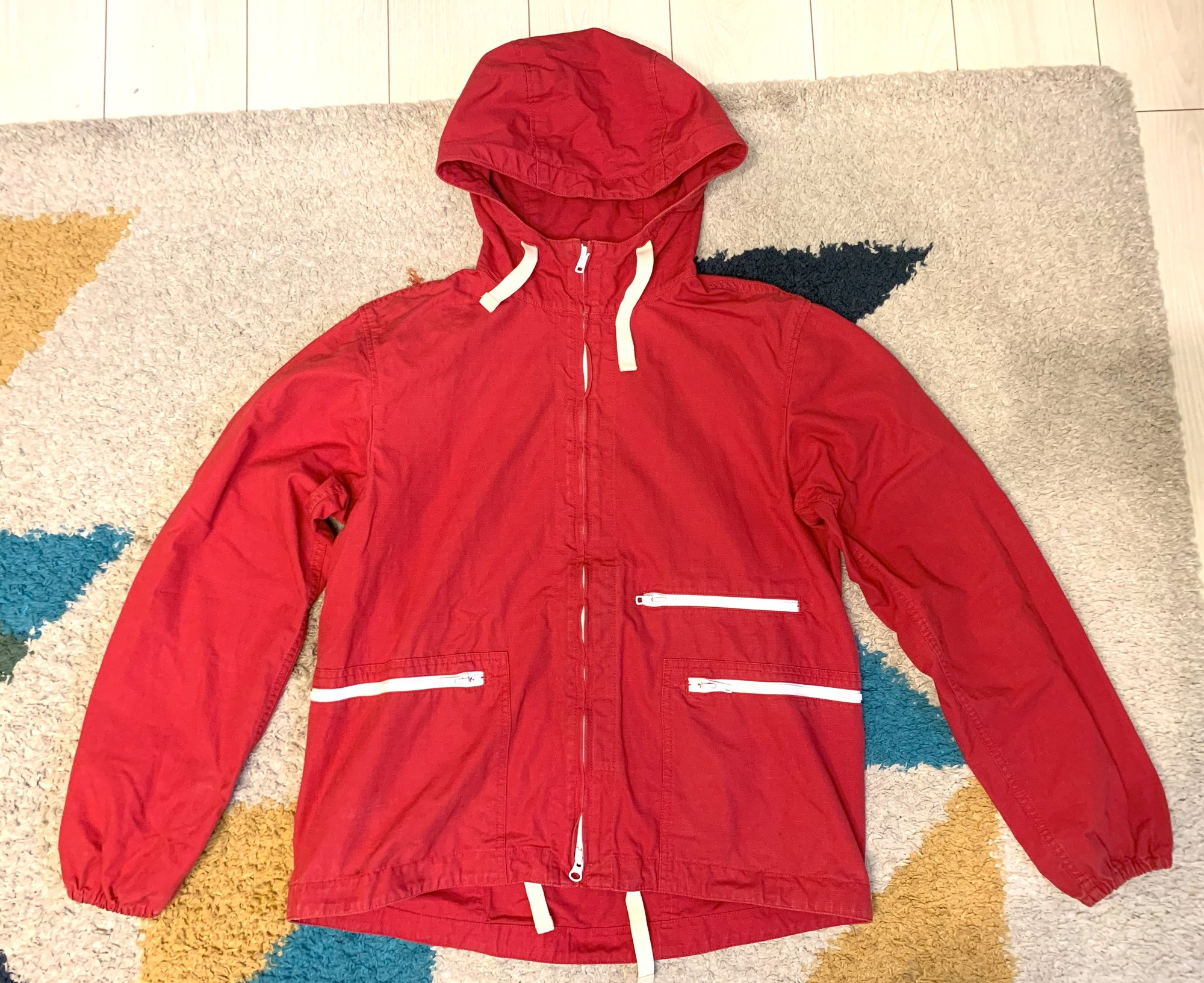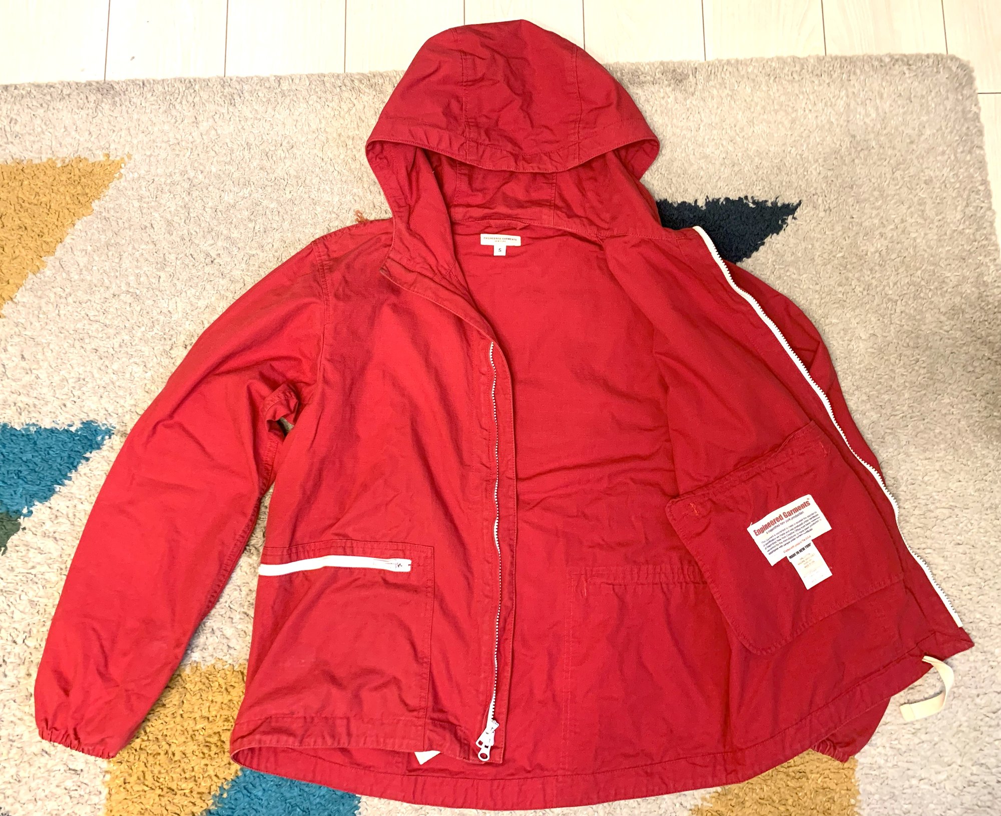 Fabric is a nice shade of red as you can see, with contrasting white zippers and pulls used throughout. Front has two large side zips that actually wrap around toward to the back. There are two pocket sections with these side pockets, one on the front and one on the back on each side. There is a third zipped section higher up as well. Everything is fully considered with nothing out of place. It’s an excellent, timeless design and features Engineered Garments’ newer neck tag.