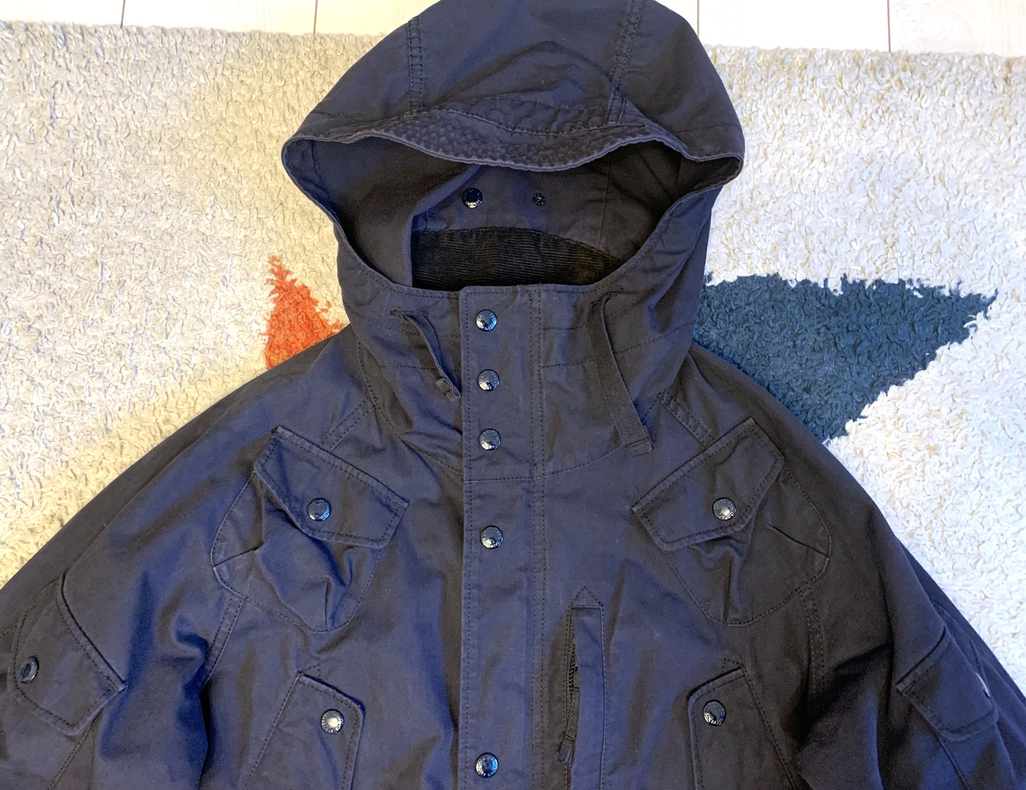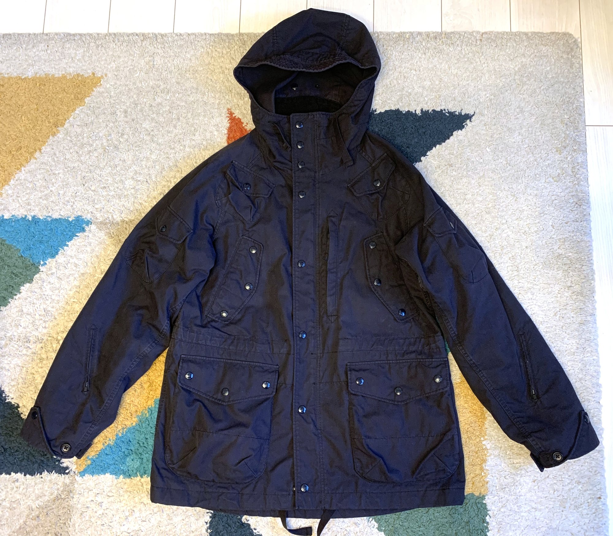 This is a very interesting, signature jacket here from EG, the sort of piece where they get their namesake. Design references the classic mountain parka, but they have flipped it on its head incorporating pockets. Many, many pockets. Depending on how you count them, I count a total of 15 pockets throughout the jacket, including on the arms, shoulders, front, back and interior. Storage space is ample here for sure. You should be able to hold pretty much all of what you need with this jacket.