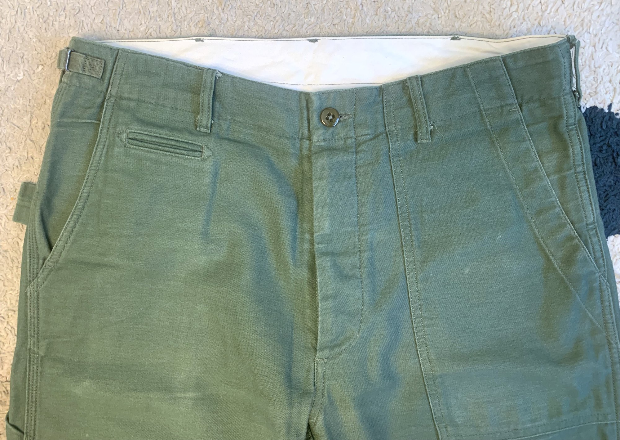 Size is labeled a 34 and fits true. I measure the waist at 34” / 86cm, inseam at 29” / 74cm (unaltered), rise at 10.5” / 27cm and leg opening at 7.5” / 19cm. This is a straight leg fit with just a bit of a taper toward the ankles. The pants come in lightly used, generally good shape. There is some minor wear including on the front left side pocket and on the right leg. Still, nothing too crazy and there is plenty of life left here. Made in the USA.