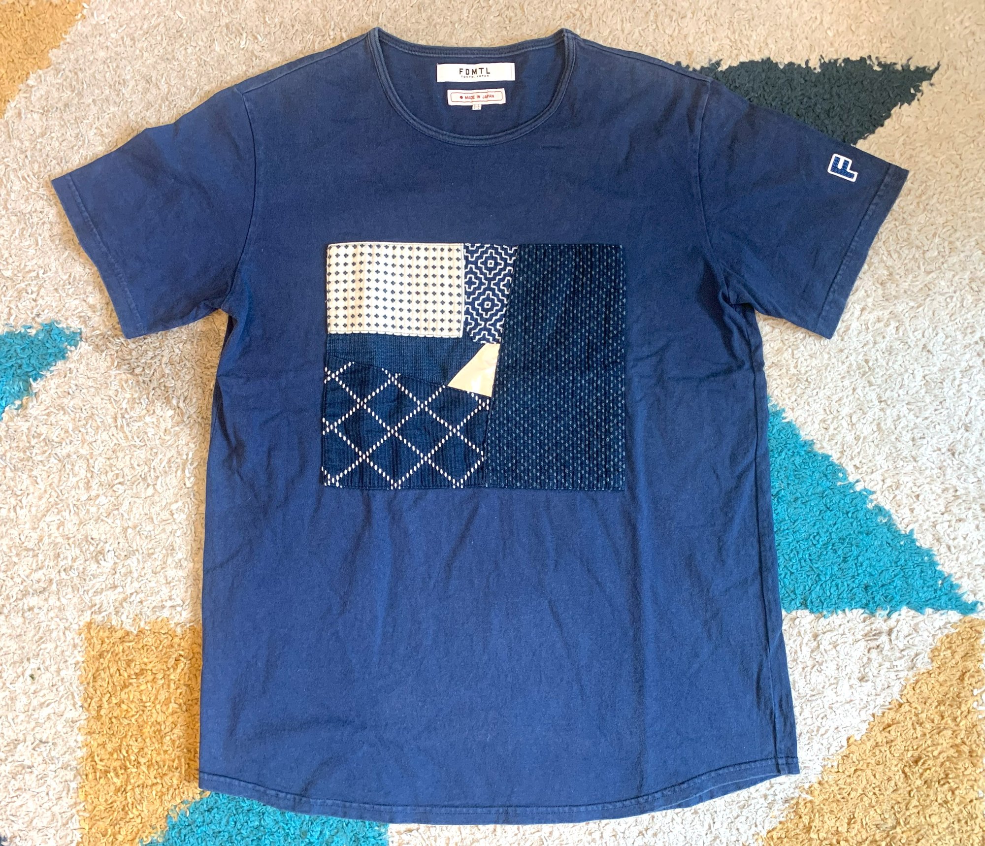In this case we have FDMTL’s take on the classic t-shirt. The main detail comes with the patchwork section on the front of the shirt. There are five different sections on the front, each in a different style of material. It is worth noting that these are actually knit fabrics stitched together, it is not a print or anything like that. These different fabrics incorporate a variety of traditional Japanese techniques including sashiko knits and indigo rope dyes. Other details include a crew neck, curved hem at the bottom, and an “F” patch on the left sleeve.
