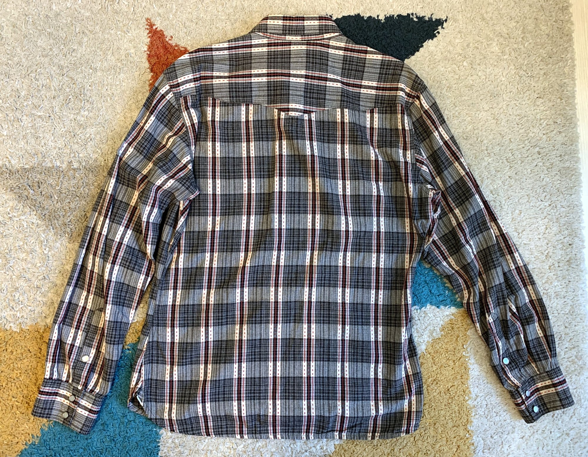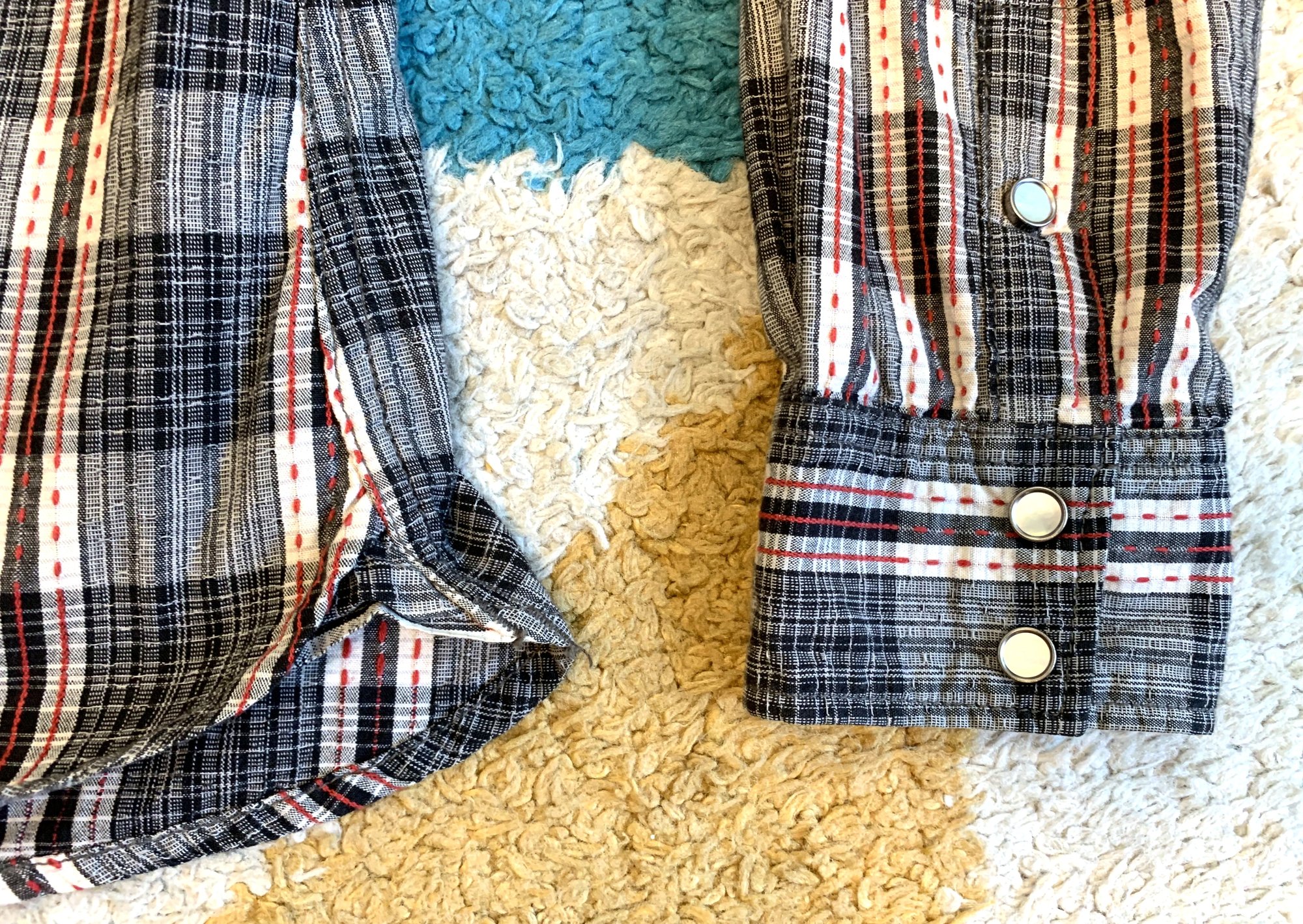 This shirt is one of Flat Head’s knit plaids. Material is a fairly light weight knit cotton. Flat Head is all about developing unique fabrics, using some of the highest quality materials available. Design in this case is based on the classic western shirt, but the fabric has quite a bit of texture to it, more texture than you would normally expect from lighter weight cotton to be sure. This is likely one of those loomed pieces done super old school. If you look at the detailed pics, you can see quite a bit going on with the color and weave. The base is made up of black and white threads, with a sort of elevated red thread that provides additional texture. However they pulled this off, it really brings the material to another level.