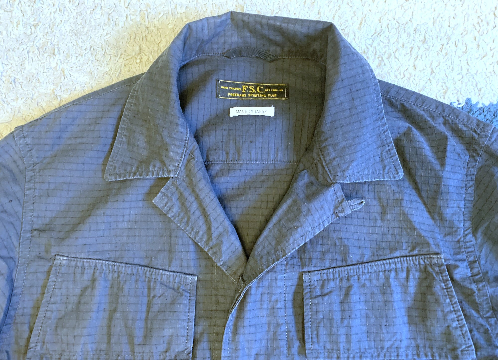 Up for sale here is a summer weight jacket from the Freemans Sporting Club label. Freemans Sporting Club is somewhere between a Japanese and an American label. They have bases in New York and Tokyo, and do manufacturing in both places. Design seems to skew more toward classic Americana, although it is often filtered through a uniquely Japanese aesthetic.