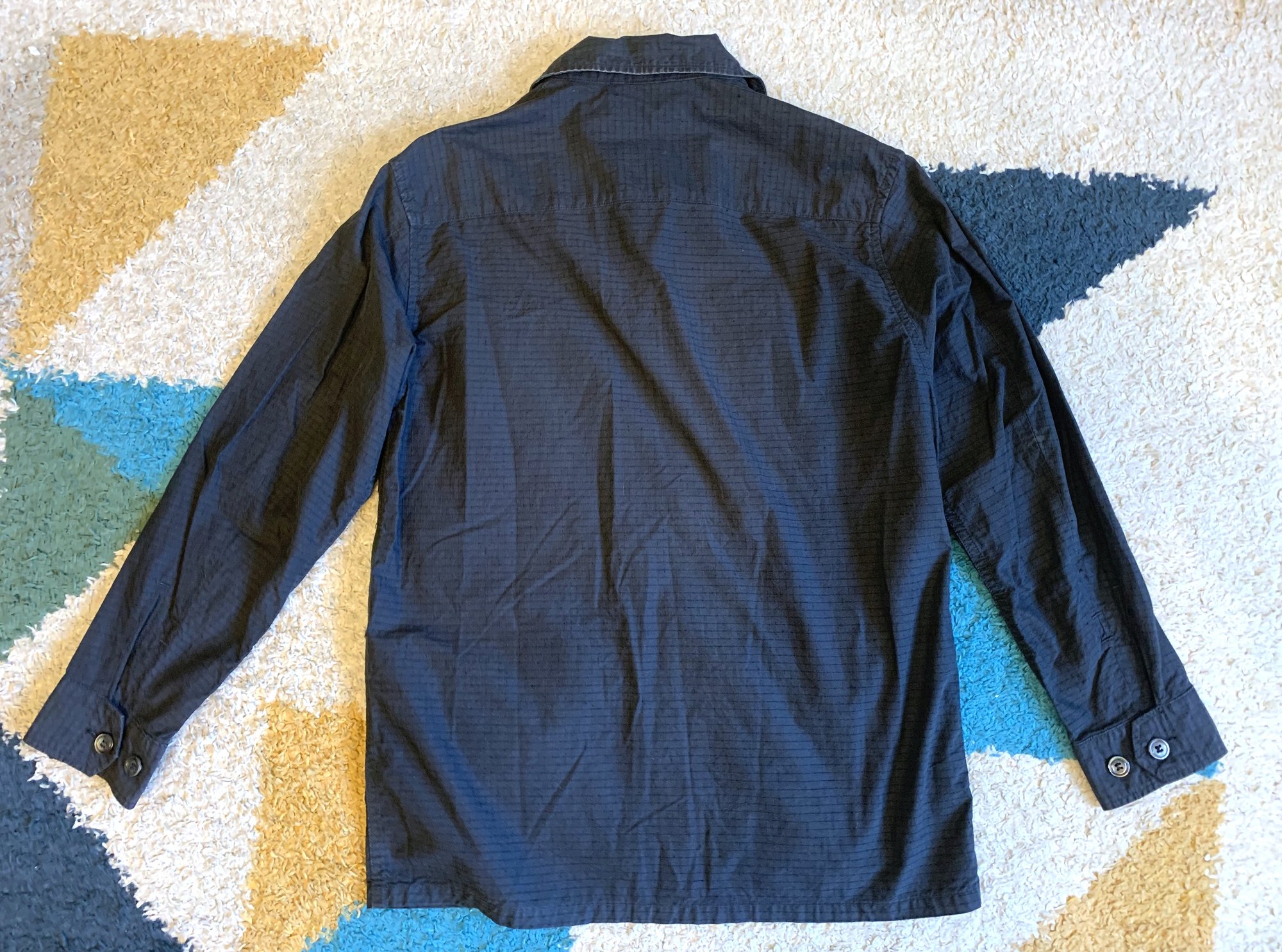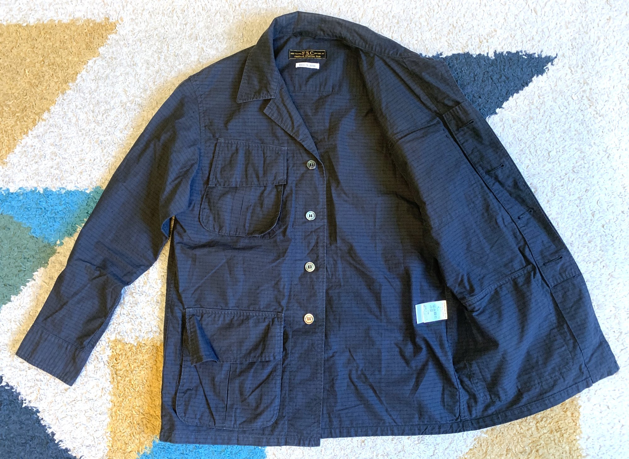 Other details here include shell buttons throughout, two chest pockets and two side pockets, all with expansion gussets, and adjustable cuffs. As noted on the tag (in Japanese), this particular model of jacket was produced for the Urban Research shop, a “select shop” that stocks a variety of international brands in addition to their own house label. As far as I know this jacket was unavailable elsewhere.