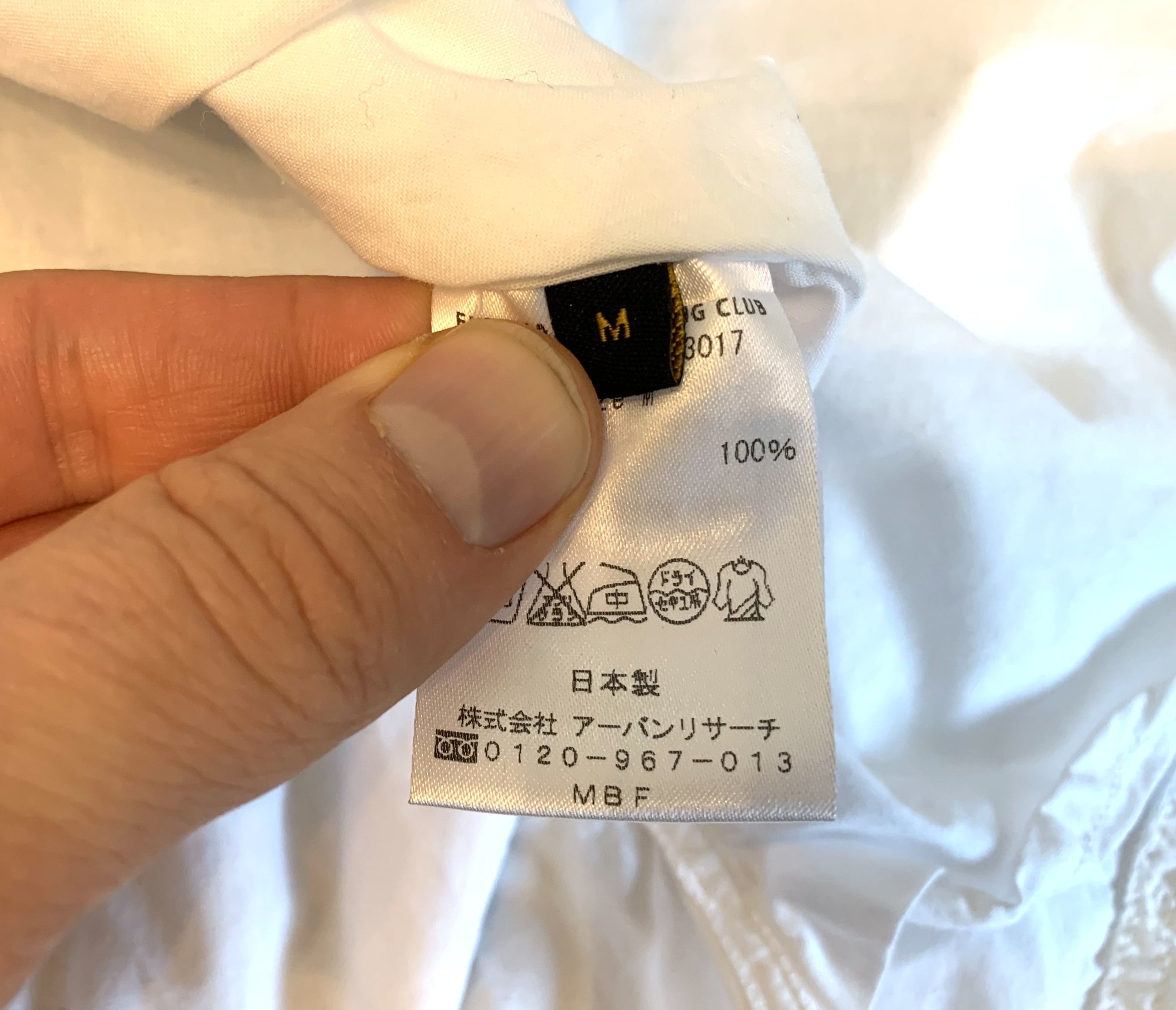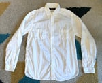 Size is labeled a medium, fit is a bit slim as noted. I measure the chest at 20” / 52cm, shoulders at 17” / 43cm, length at 27.5” / 70cm from the base of the neck, and sleeves at 24” / 61cm from the shoulder. The shirt comes in lightly used, very good shape with no holes, tears, stains or obvious signs of wear. Made in Japan.