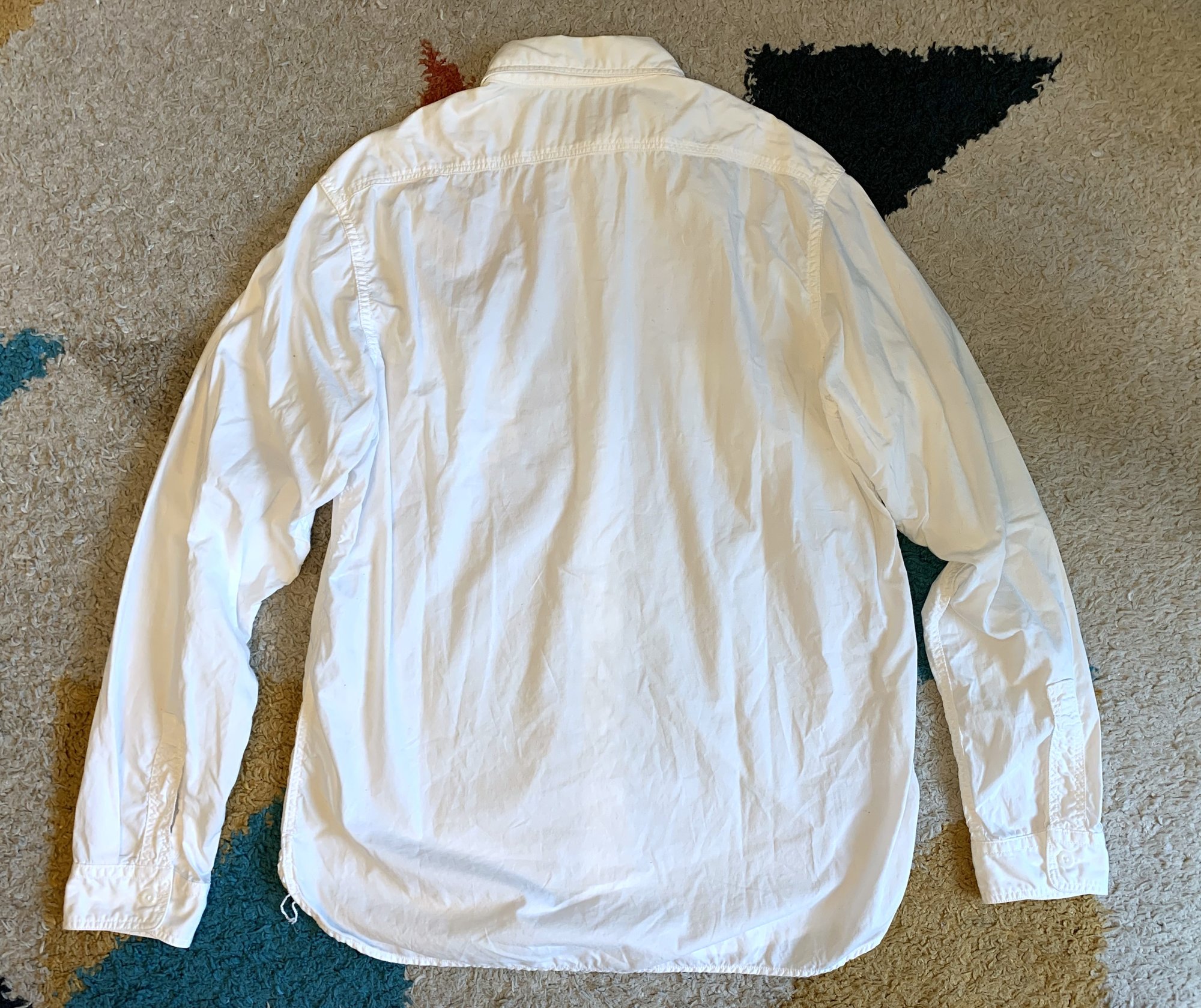 This shirt is an interesting one, going for the classic solid white button down, but at the same time incorporating a lot of interesting workwear detailing beyond what a lot of other labels do. One of the most interesting aspects to me is that pretty much every seam is chain stitched. You don’t usually see this kind of chunky stitching applied to shirts, and when you do it is usually done much more sparingly. You’ve got a double needle run used throughout basically, and of course the chain stitch runoff on the sides along with side gussets.