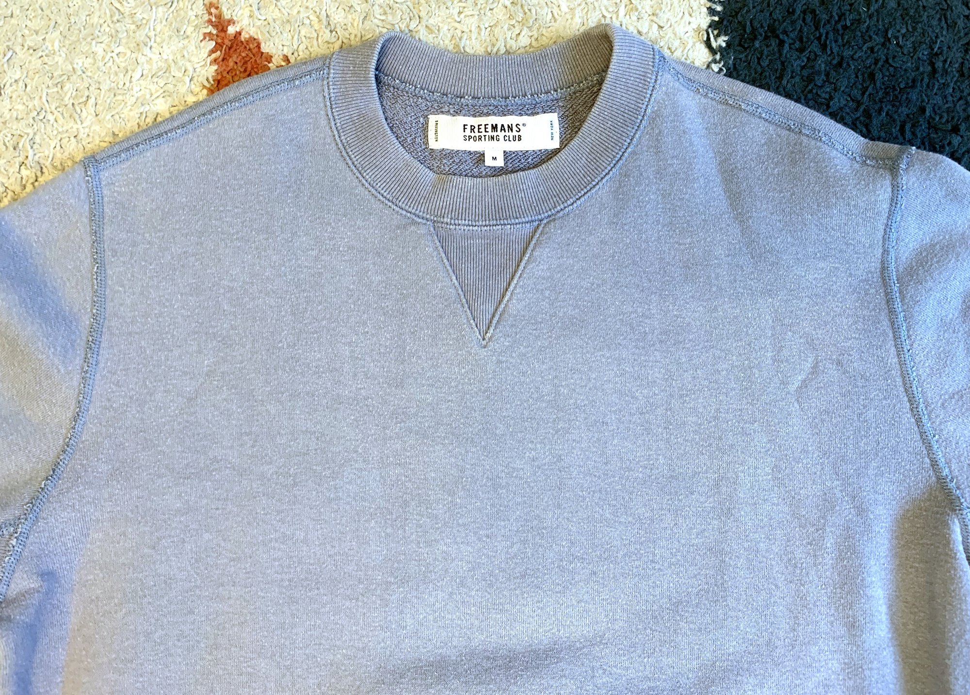 FSC often produces their knit sweats in collaboration with the Loopwheeler label, where you can only buy these pieces from Freemans Sporting Club. Design is very similar to Loopwheeler’s non-collab pieces, where this is basically their knit crewneck sweater, but the color and tags are different. Color is a unique and slightly washed out shade of blue. The label on the cuff is blue with blue text (rather than blue with white text for their own pieces), while the neck tag has the FSC logo and interior uses the Loopwheeler materials tag. This is one of those pieces that is built very tough, made to take a beating, and will only get better with age.