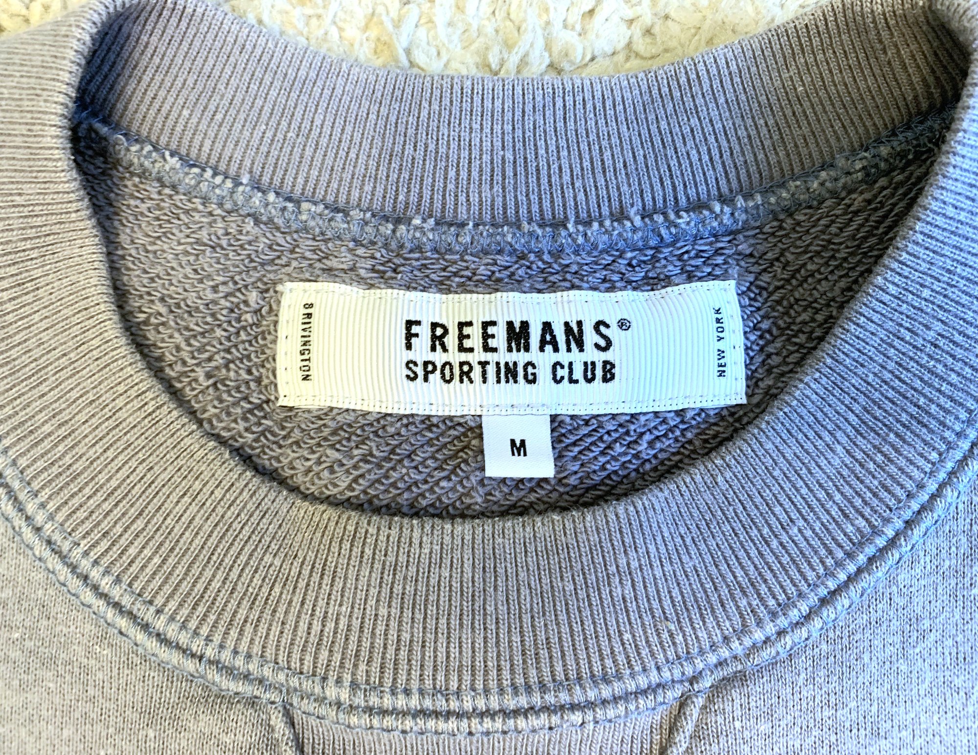 Up for sale here is a sweater from the Freemans Sporting Club label, done in collaboration with the Loopwheeler brand. Freemans Sporting Club is somewhere between a Japanese and an American label. They have bases in New York and Tokyo, and do manufacturing in both places. Design seems to skew more toward classic Americana, although it is often filtered through the uniquely Japanese aesthetic.
