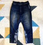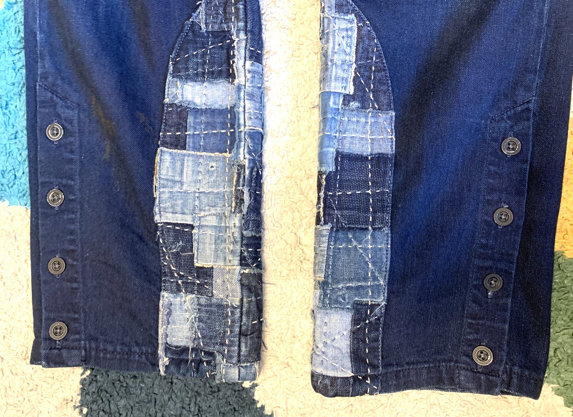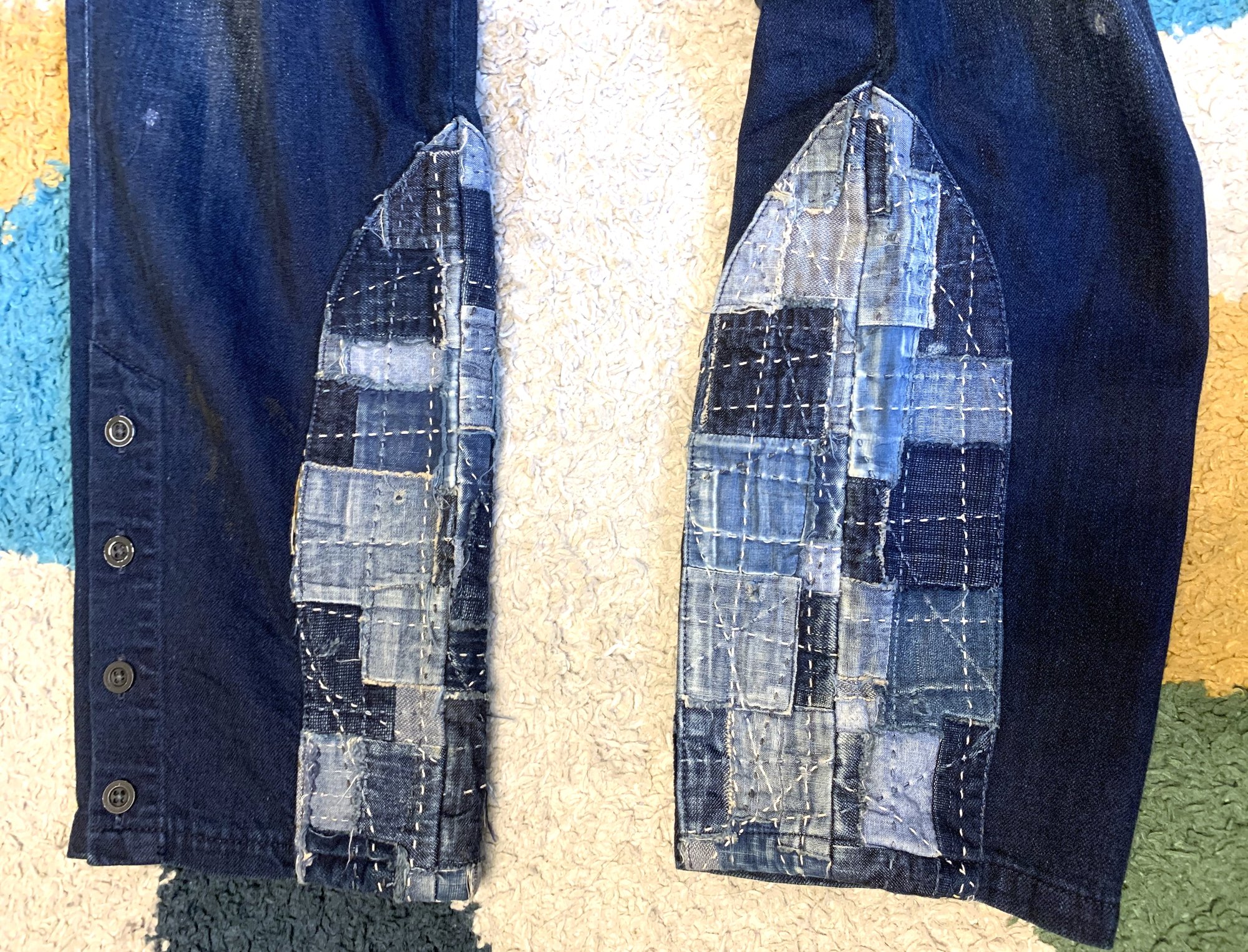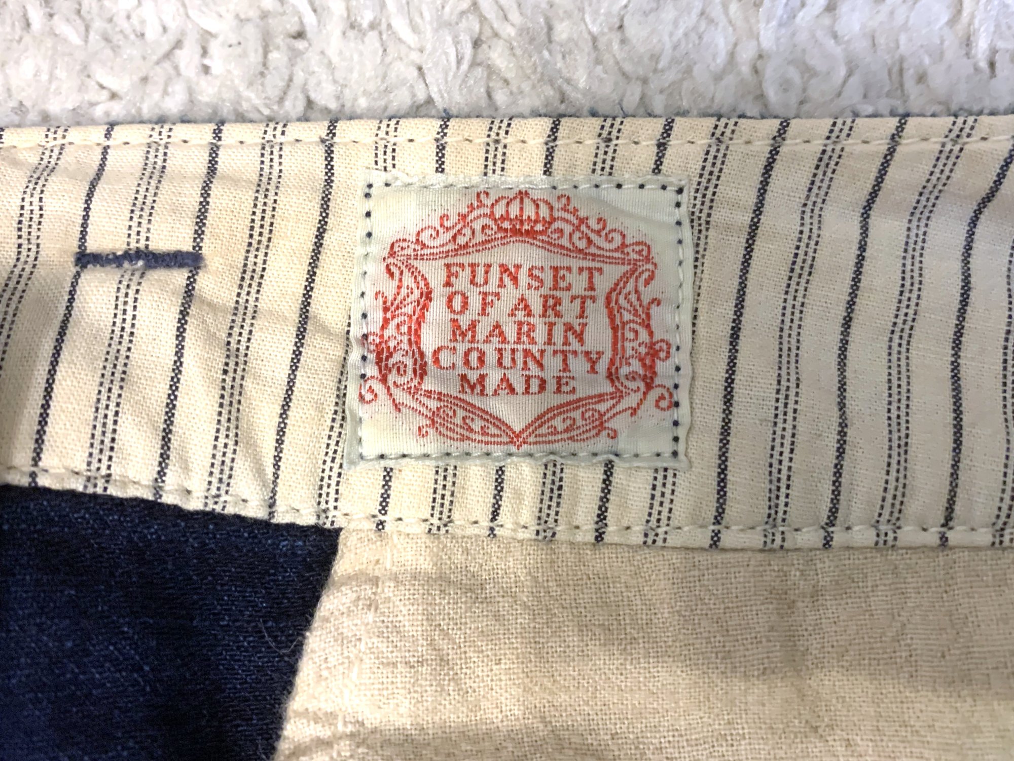 Up for sale here is a pair of pants from the Funset of Art label. Funset of Art is a smaller-scale Japanese label that focuses on re-purposing vintage fabrics using traditional Japanese techniques such as sashiko and boro to create patchworked garments. Many Funset pieces are indigo dyed, coming in various stages of distressing, and often incorporating a considerable amount of hand work.