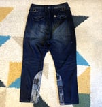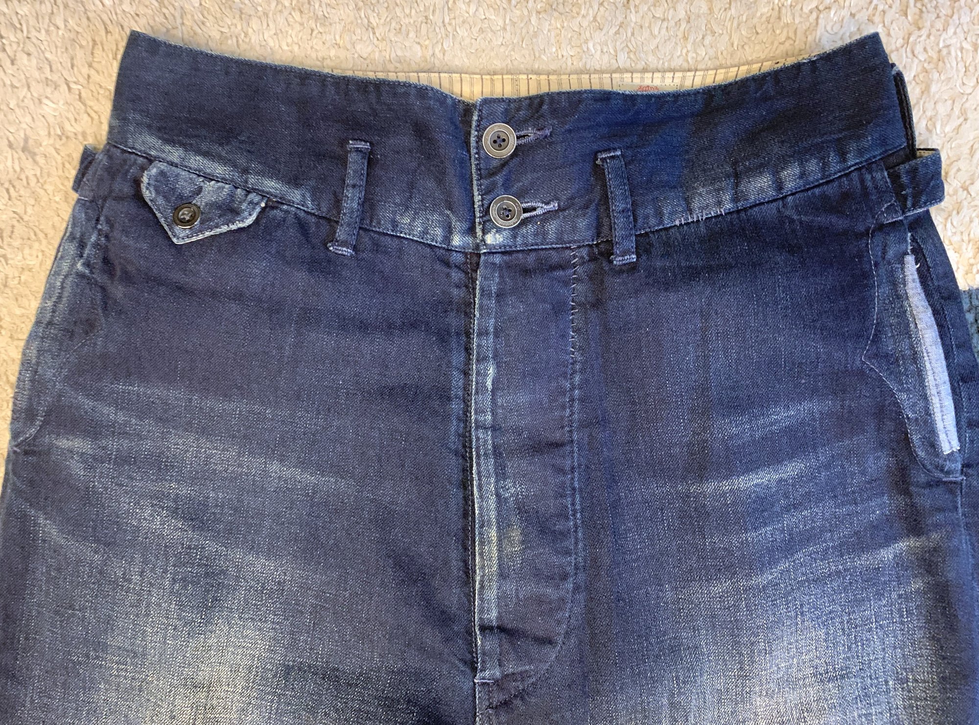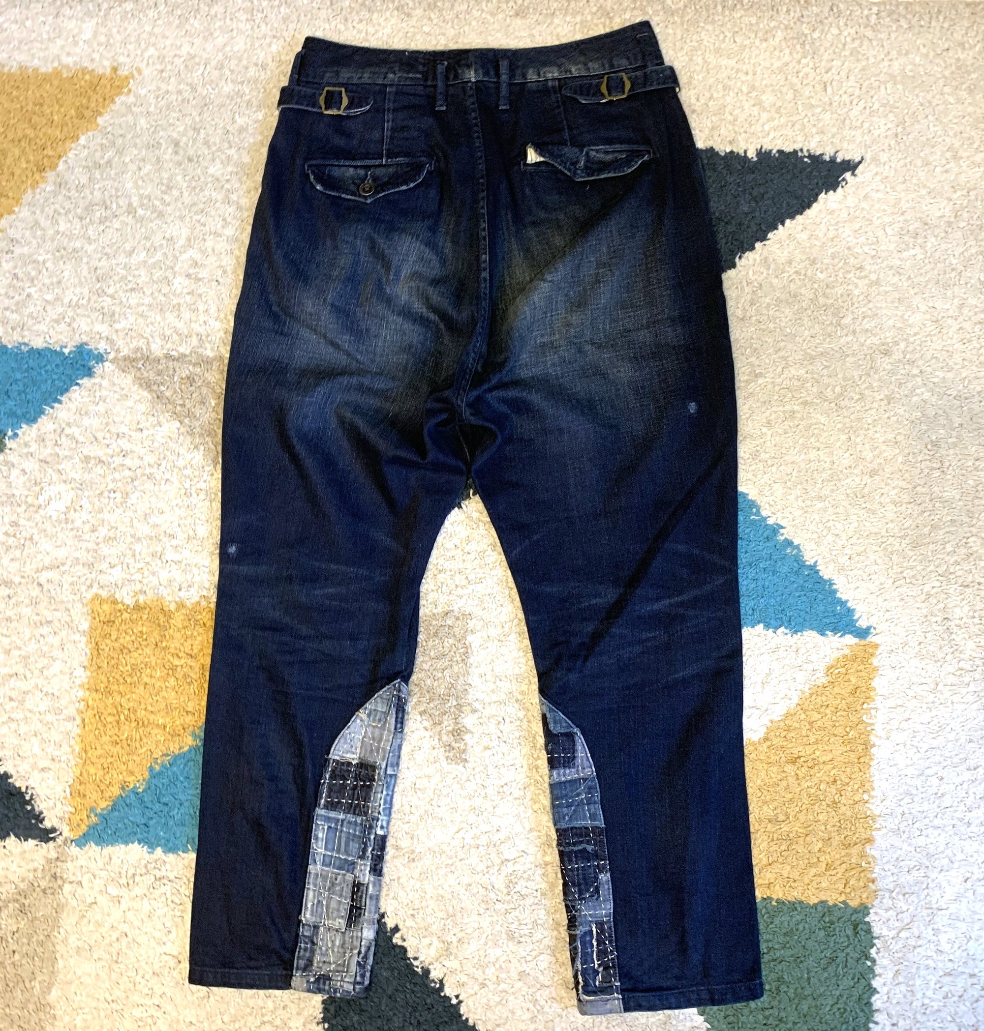 Size is labeled a large and fits a 32 inch waist well. I measure the waist at 32” / 82cm, inseam at 25” / 62cm, rise at 12.5” / 32cm, and leg opening at 7” / 16cm. As noted, being based on the Johdpur pant these pants have a longer rise and somewhat shorter inseam, where they should fall at about ankle length depending on your height. The pants come in lightly used, very good shape with no holes, tears or fading beyond their original condition. Made in Japan.
