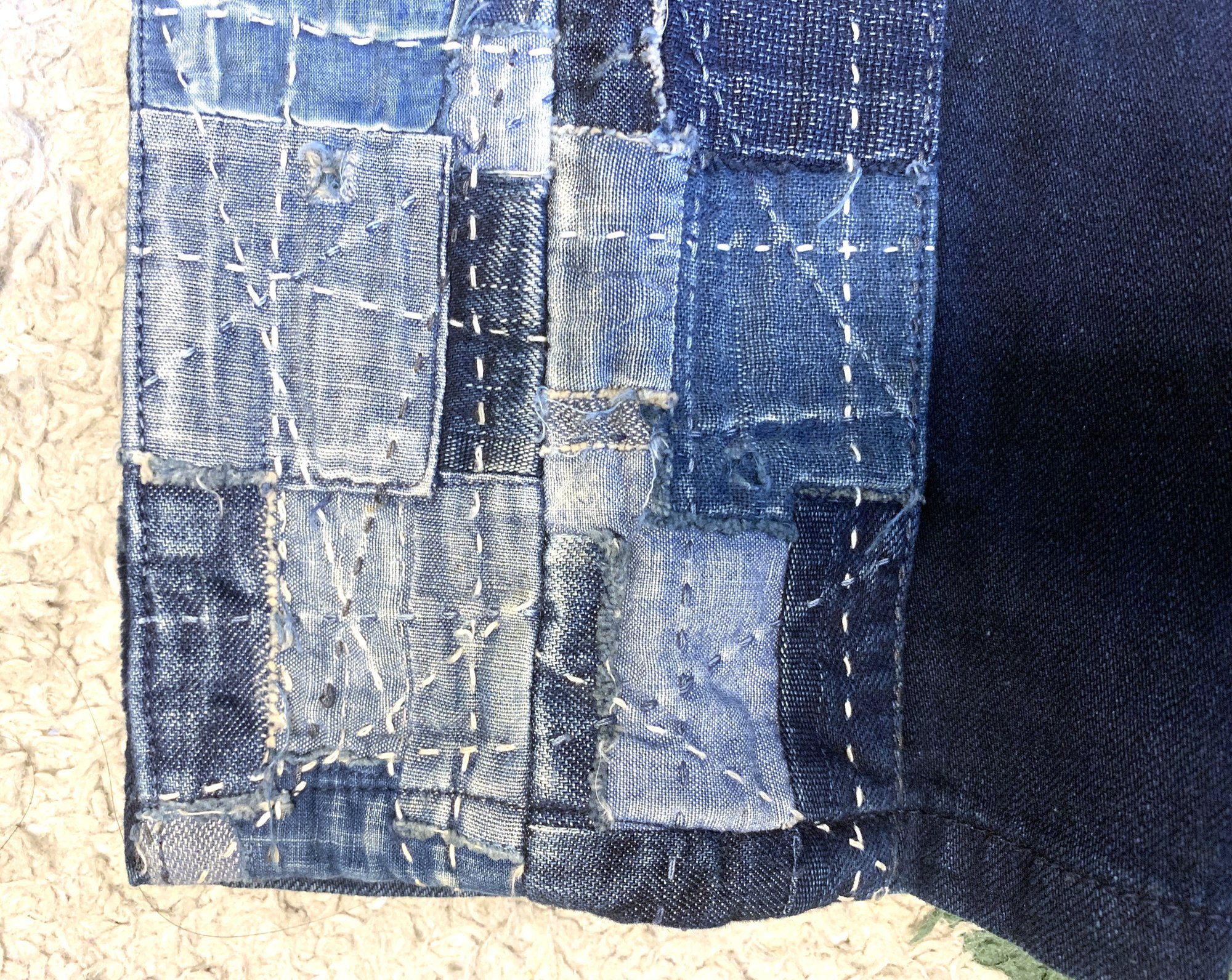 These pants are a great illustration of what Funset of Art does. The main body is an indigo dyed denim in 100% cotton. The denim is fairly light in weight, around 8oz or so I would guess, subject to some fading and distressing to give it a broken-in look. Silhouette is based on the Johdpur pant, with a somewhat looser thigh area that tapers down toward the ankles, with buttons coming up from the cuff allowing you to adjust the bottom portion of the leg to your liking. The big draw is on the leg interiors, where there is a really cool boro patchwork detail, using a variety of pieces of indigo dyed cotton in different shades, connected through sashiko stitching. This is a very traditional, labor-intensive design, one that looks beautiful as applied here.