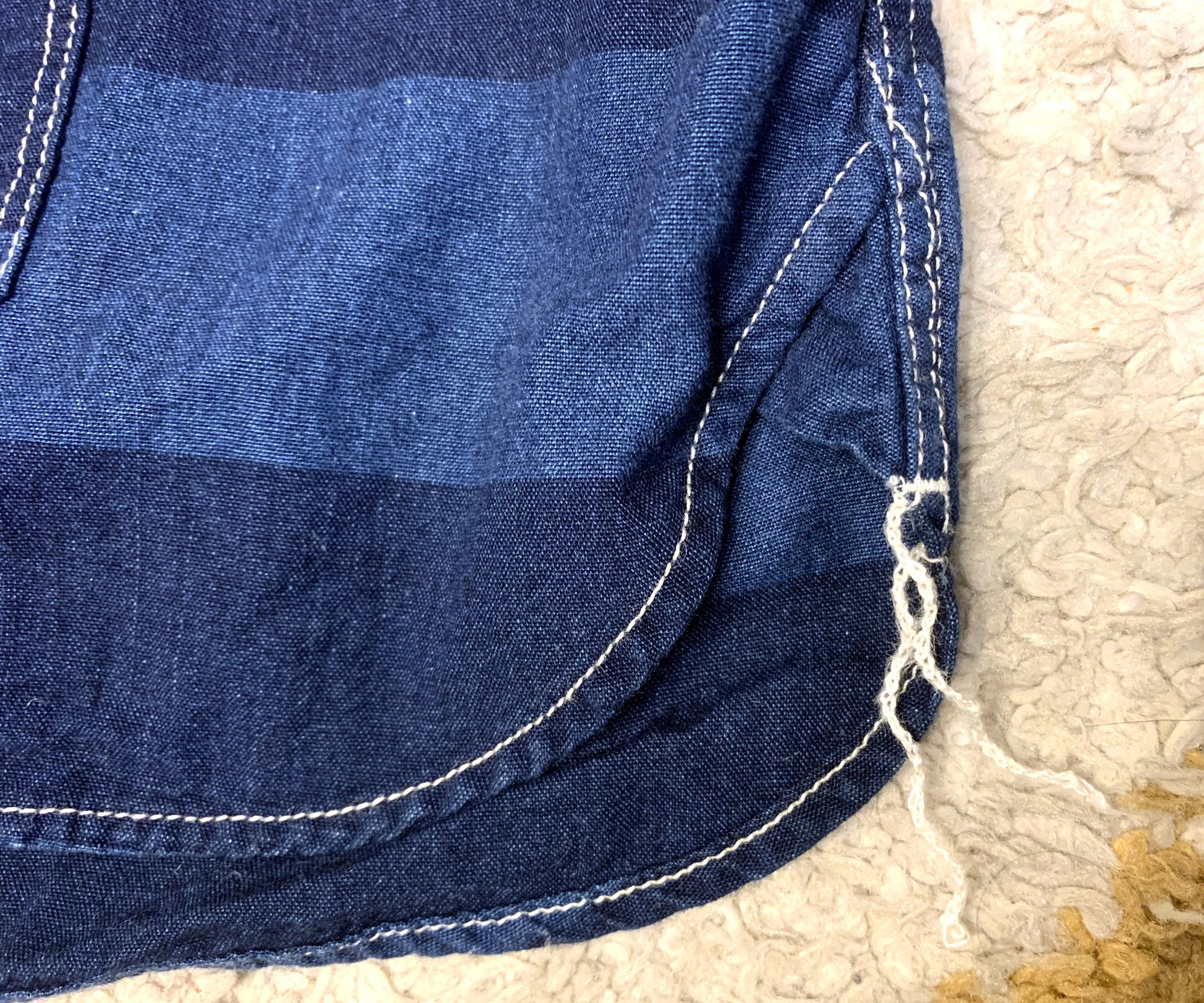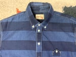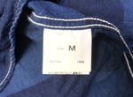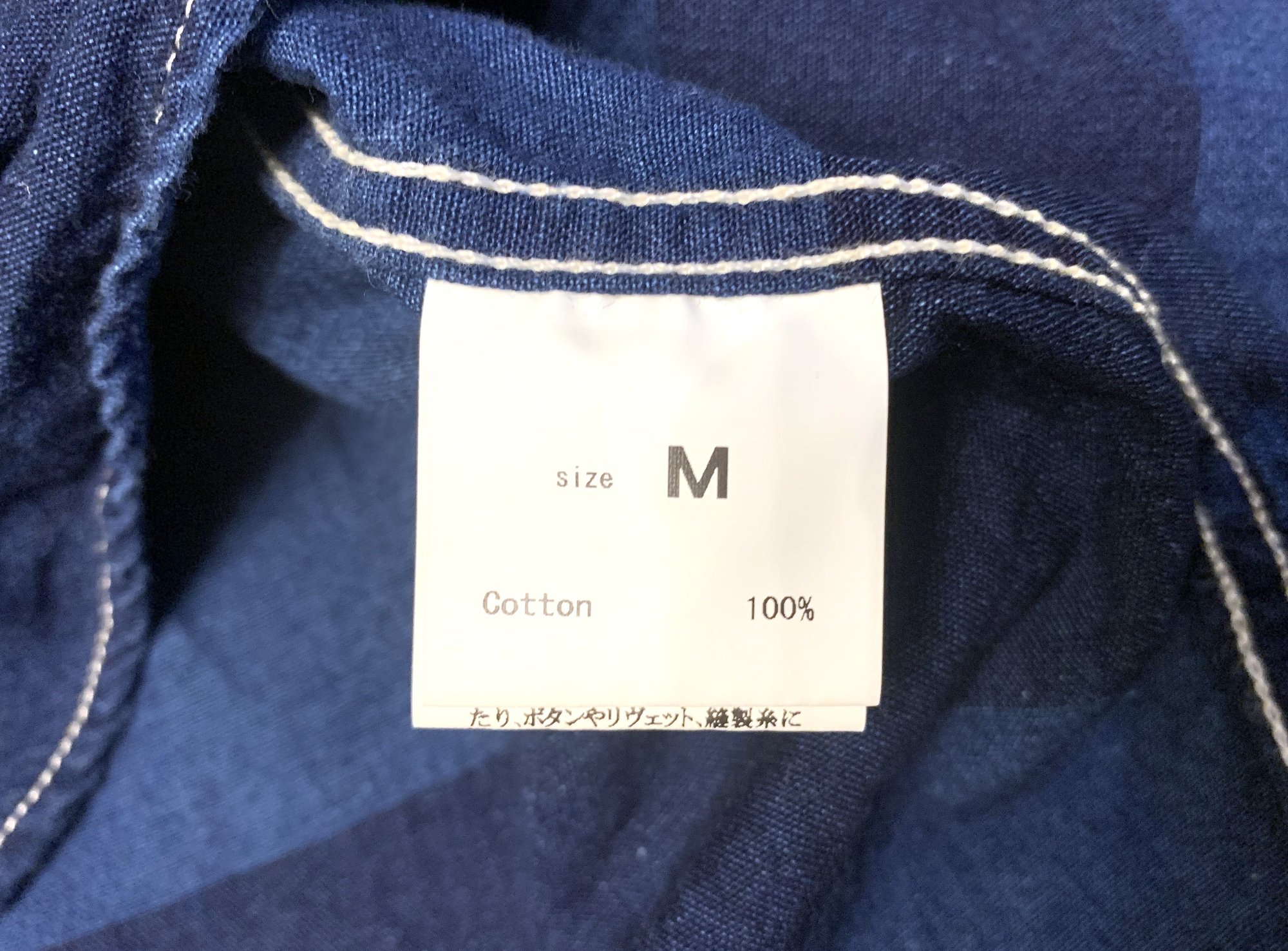 Size is labeled a medium and fits true if a bit slim. I measure the chest at 19.5” / 50cm, shoulders at 17” / 43cm and length at 25” / 64cm in front and 26” / 66cm in back. The shirt comes in lightly used, very good shape with no holes, tears, stains or visible fading of the indigo. Made in Japan.