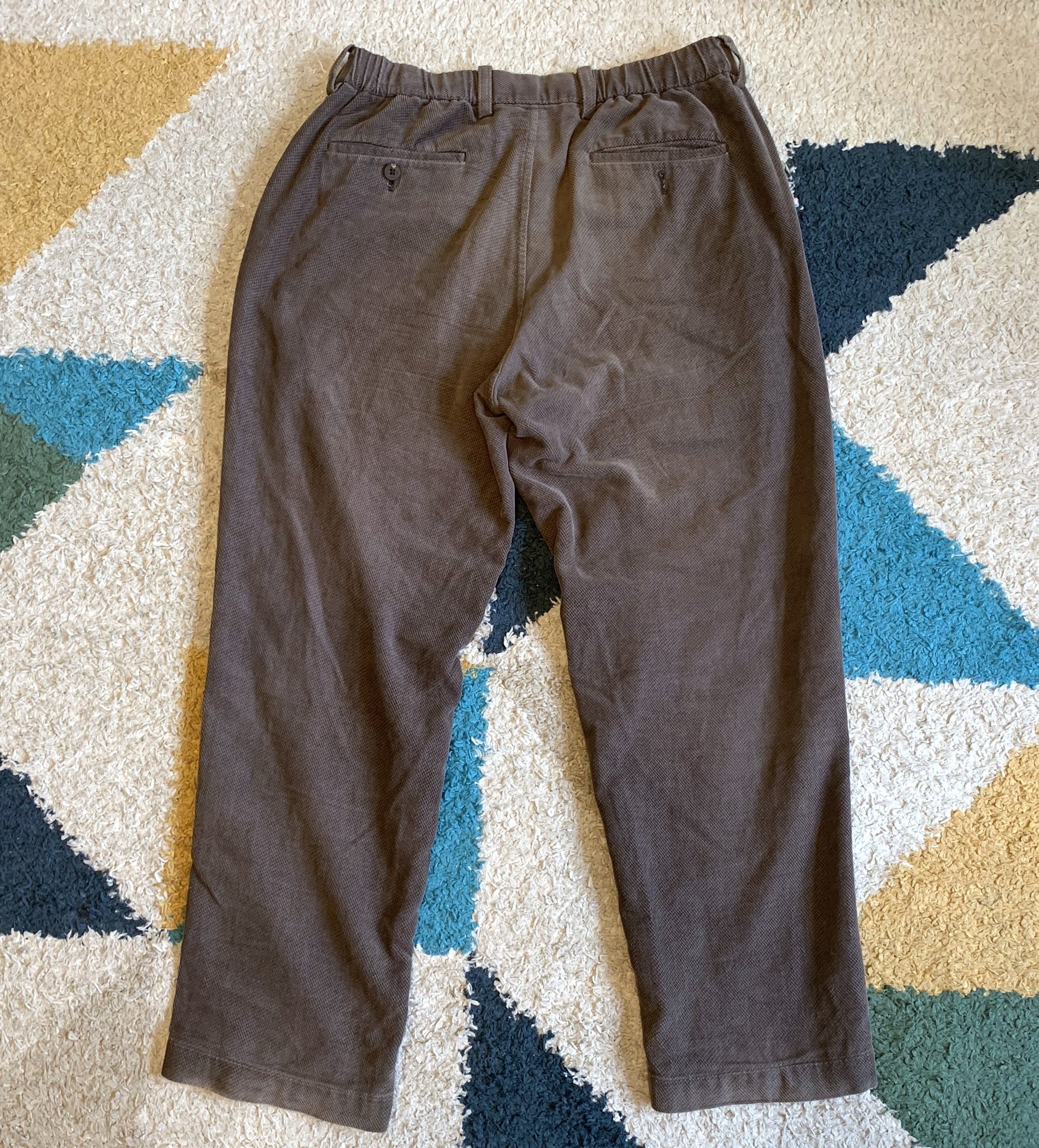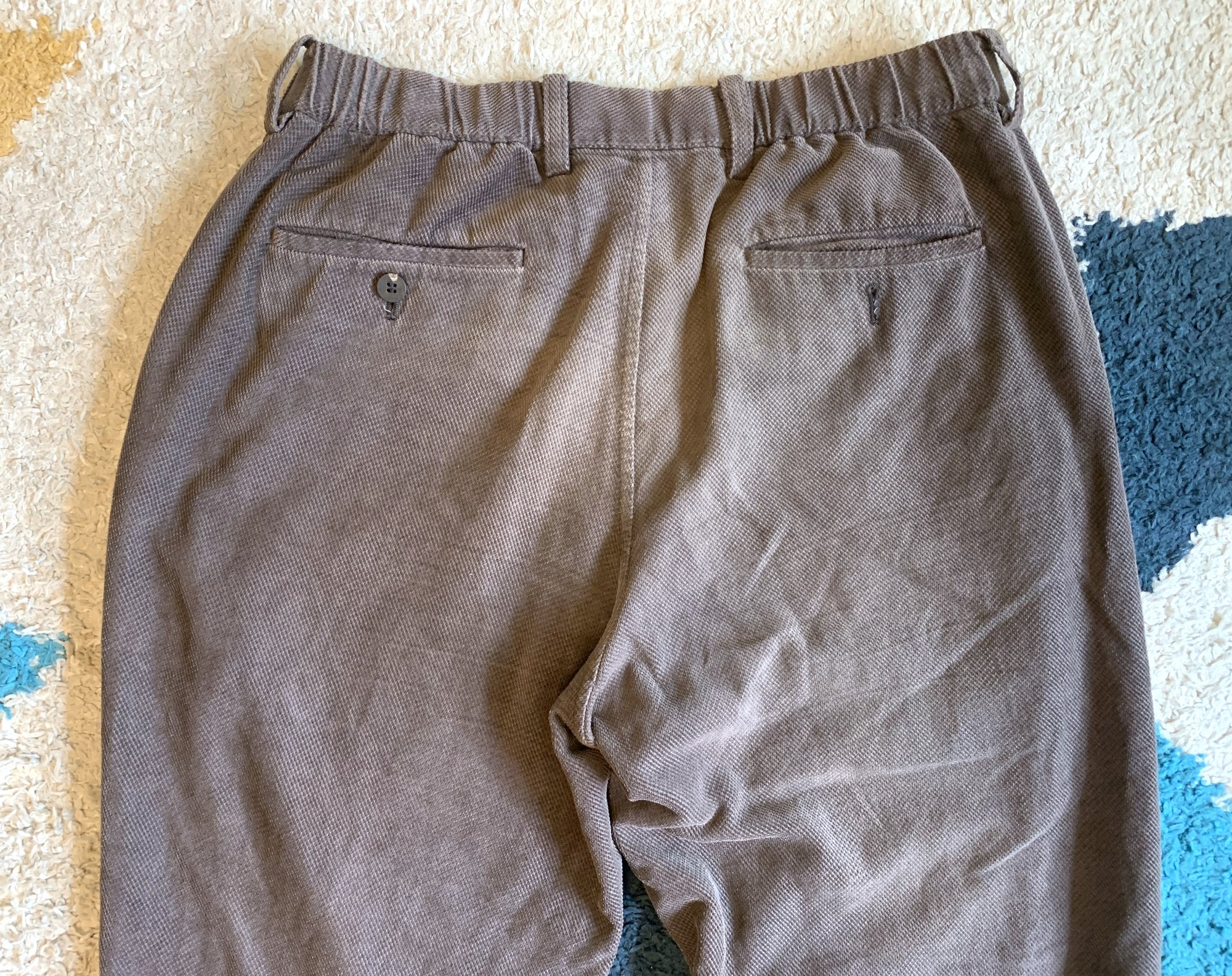Up for sale here is a pair of pants from Issey Miyake. The Miyake label is a contemporary of Yohji Yamamoto and Comme Des Garcons, one of the original Japanese avant-garde labels that really popularized the Japanese textile industry abroad in the 70s and 80s. The label is of course still going strong. Miyake is highly conceptual and is responsible for the development of a variety of new textiles and incorporating a number of technical innovations into their pieces.