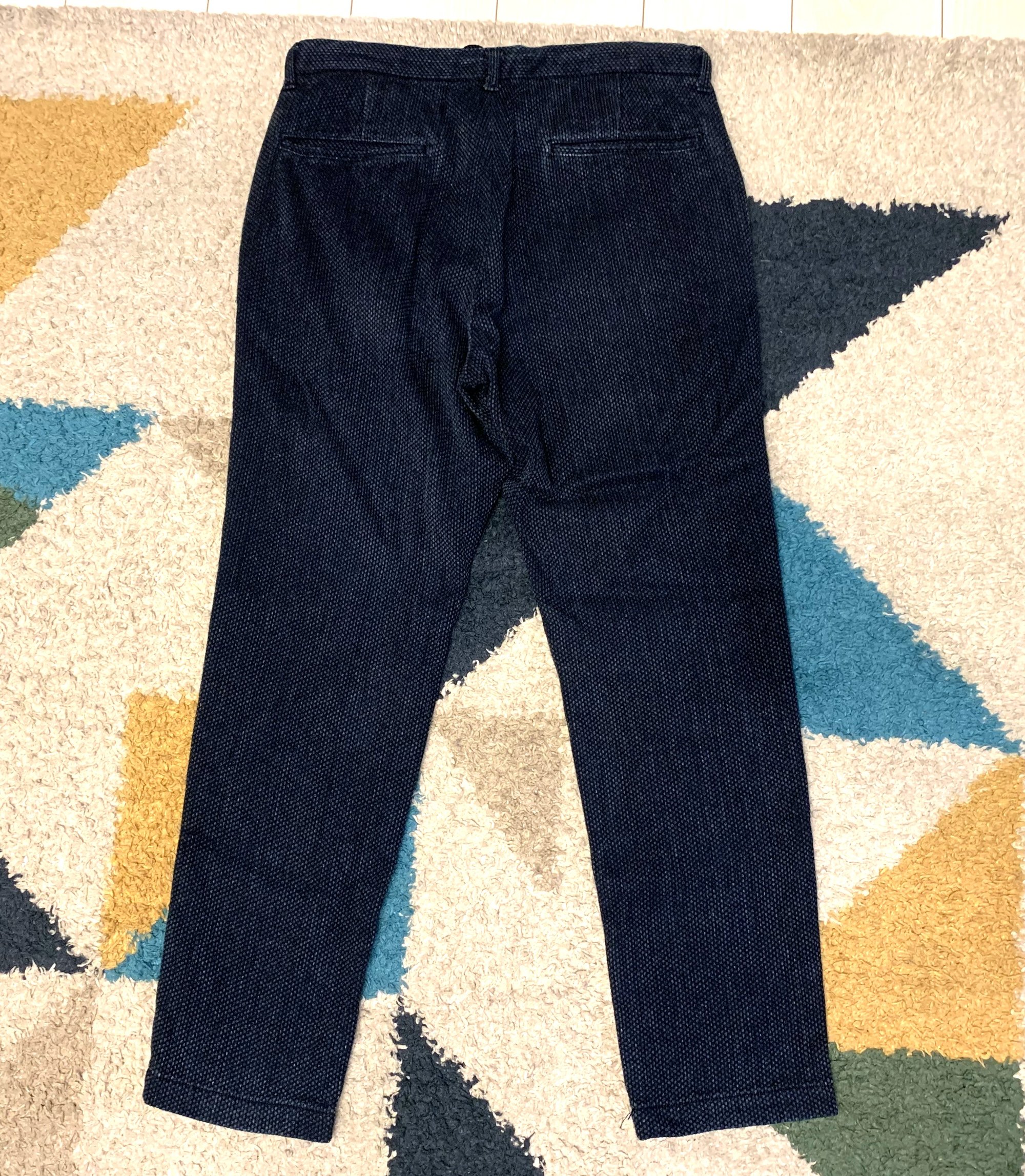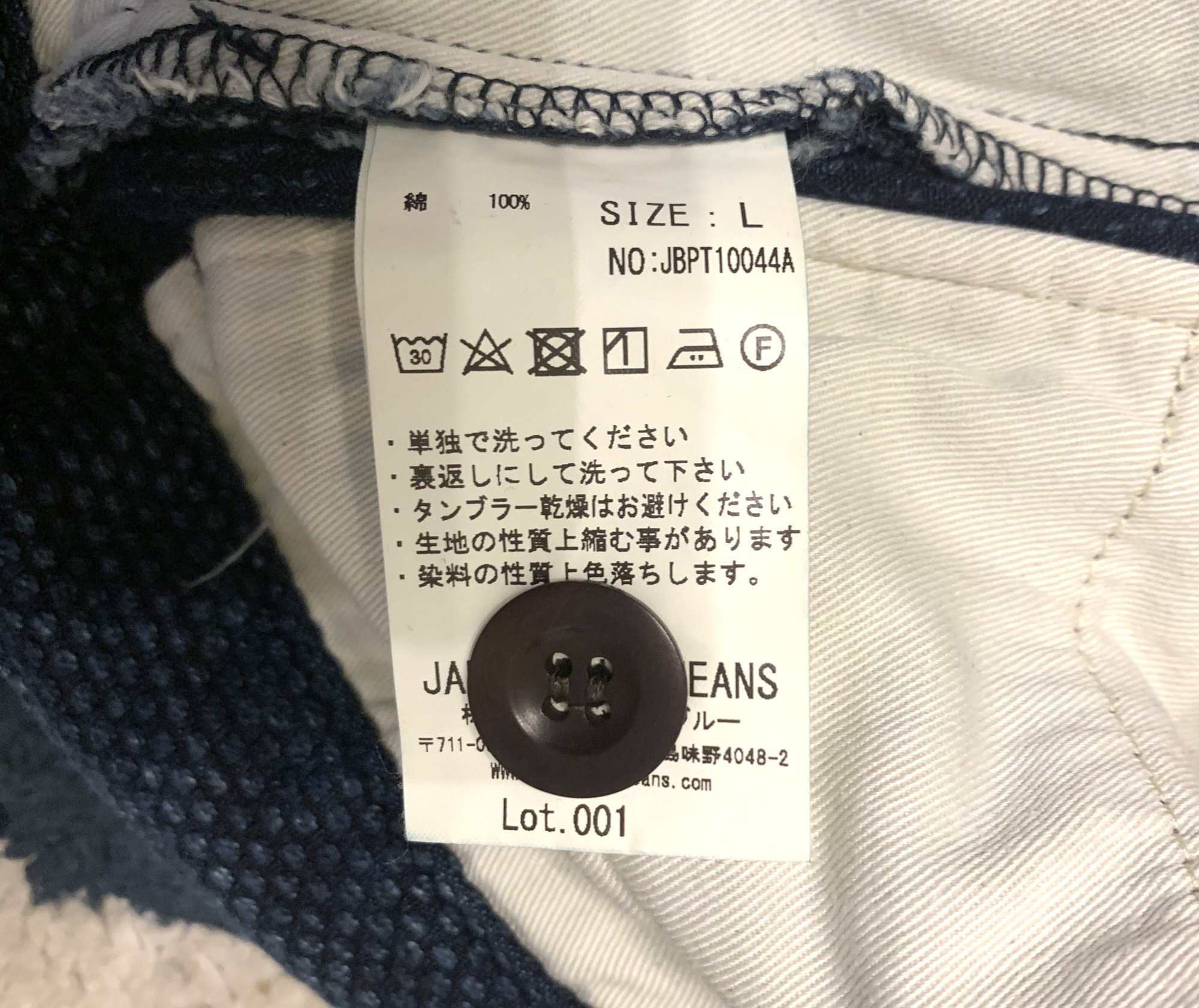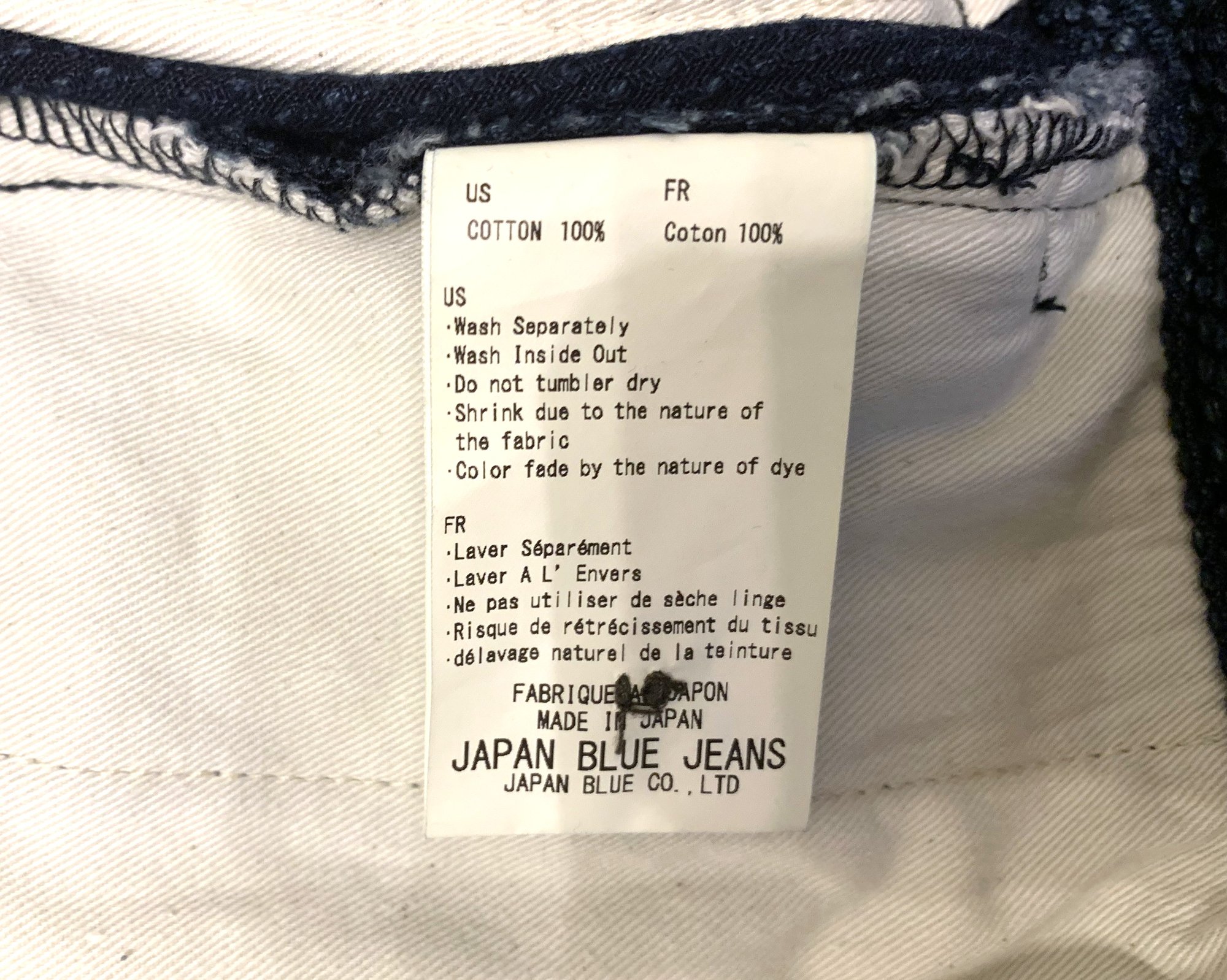 For sale here is a pair of pants from the Japan Blue Jeans label. Japan Blue is one of the lines manufactured by Rampuya, the same company that does the Momotaro label. Both labels are very strongly jeans and indigo oriented, producing exclusively in the Kojima area of Japan, although the Momotaro label is probably more widely known and releases a fuller range. Japan Blue focuses pretty strongly on jeans and denim jackets, but the same high quality production standards are still very much there, as are the really detailed and unique fabrics.