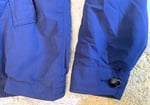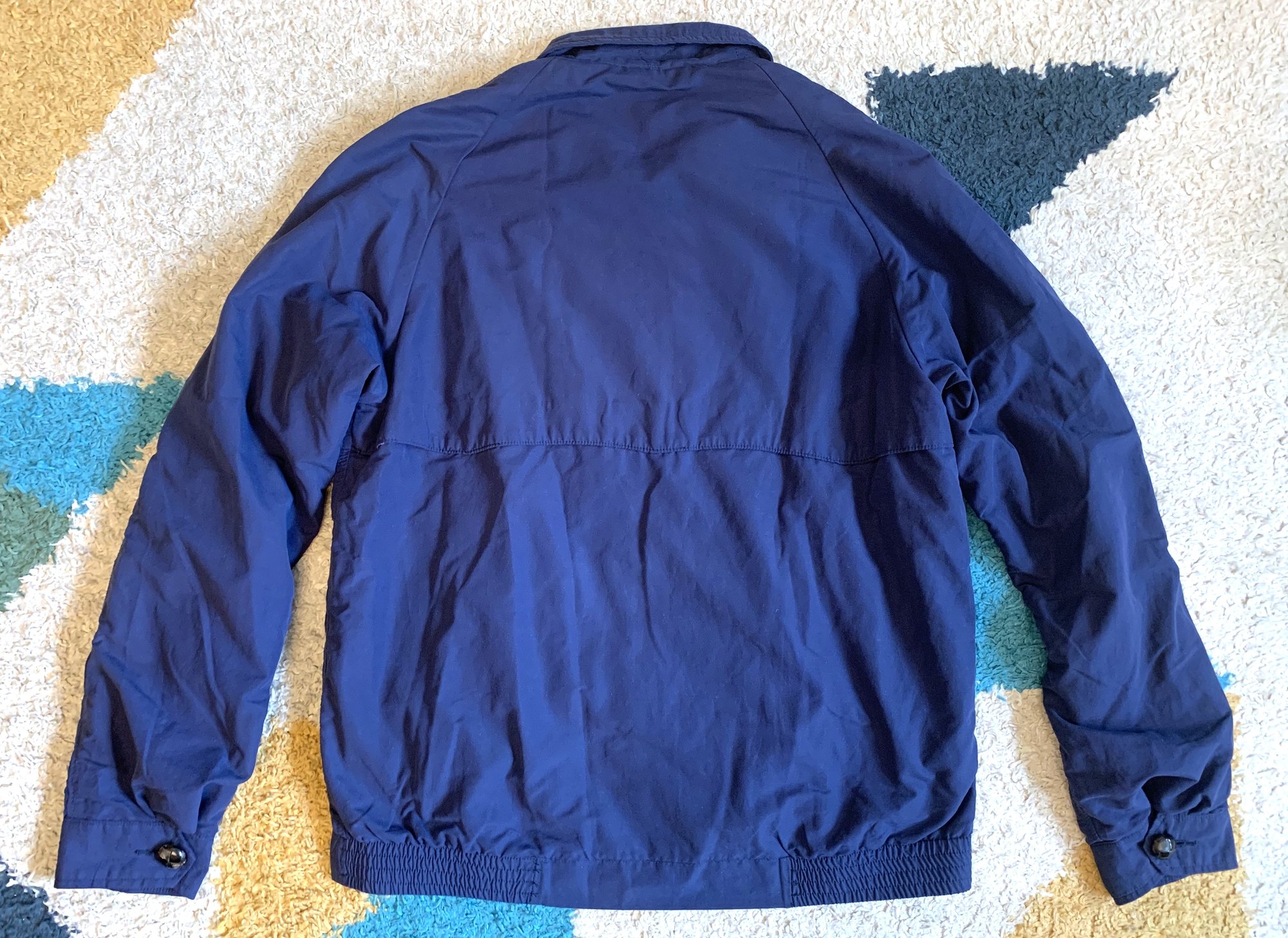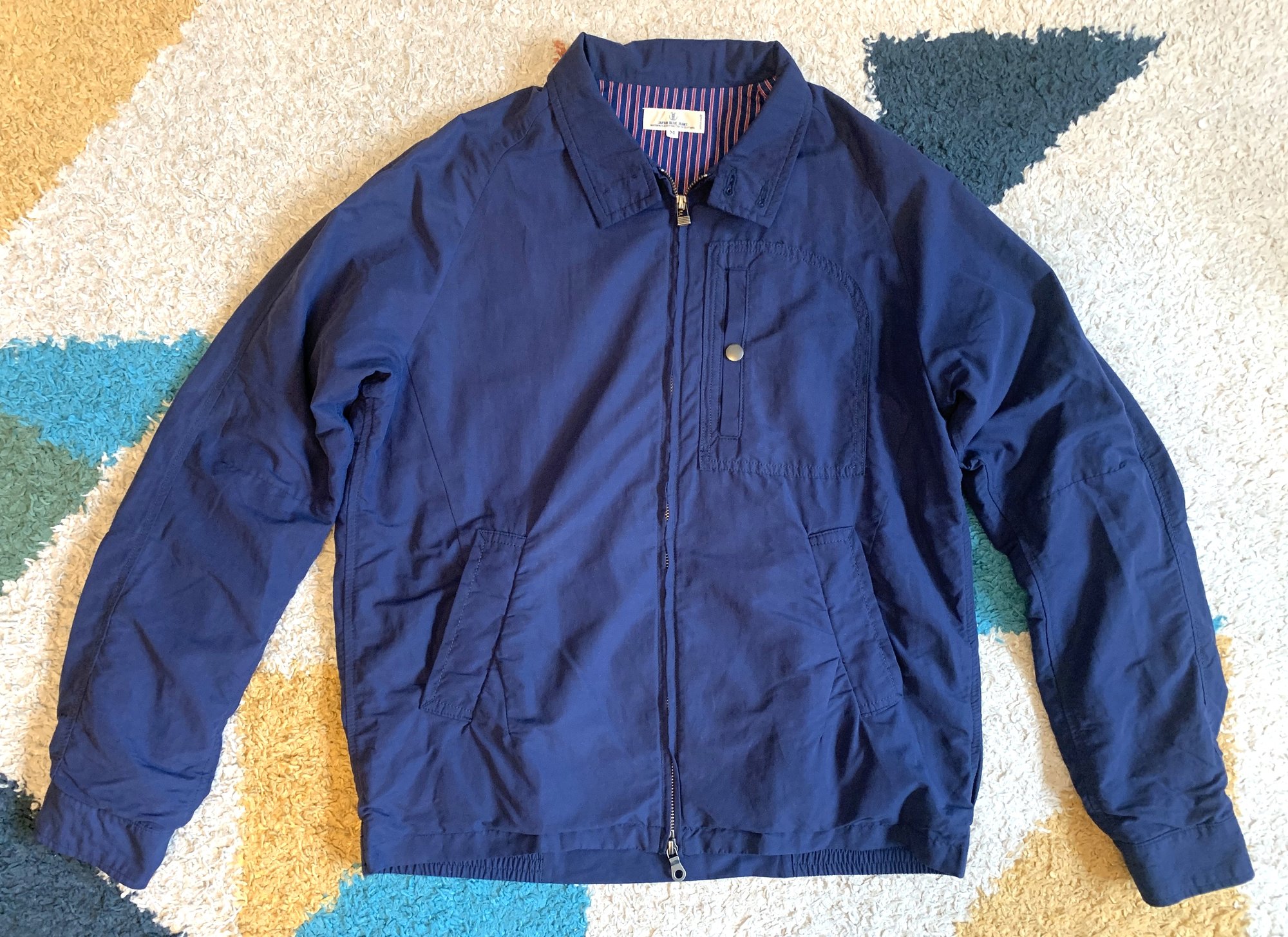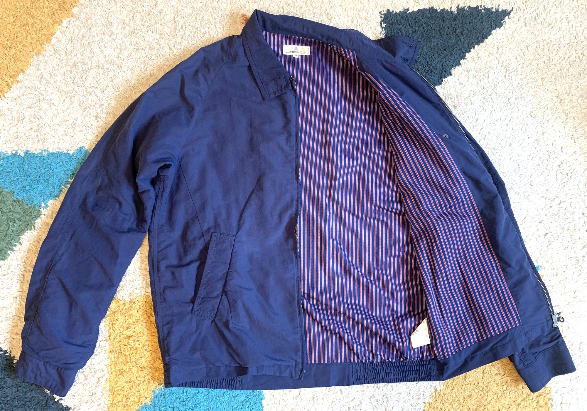 This is a pretty interesting take on the classic Harrington jacket from Japan Blue. Silhouette follows the Harrington pretty closely but there are some unique details incorporated. For one, fabric here is a 52% cotton, 48% nylon blend. The cotton/nylon makes the exterior something like a windbreaker, giving it more resilience and weather protection compared to a more typical cotton jacket. The jacket is also fully lined in a striped cotton fabric. Between the exterior and the lining I would consider this a medium weight jacket, good for fall-winter-spring wear depending on the weather. Collar can be worn fully buttoned up or folded down, and there is a large double zip down the front. Buttons are all vintage style woven leather. Shoulders are raglan and rear includes an elasticated waistband to ensure a good fit.