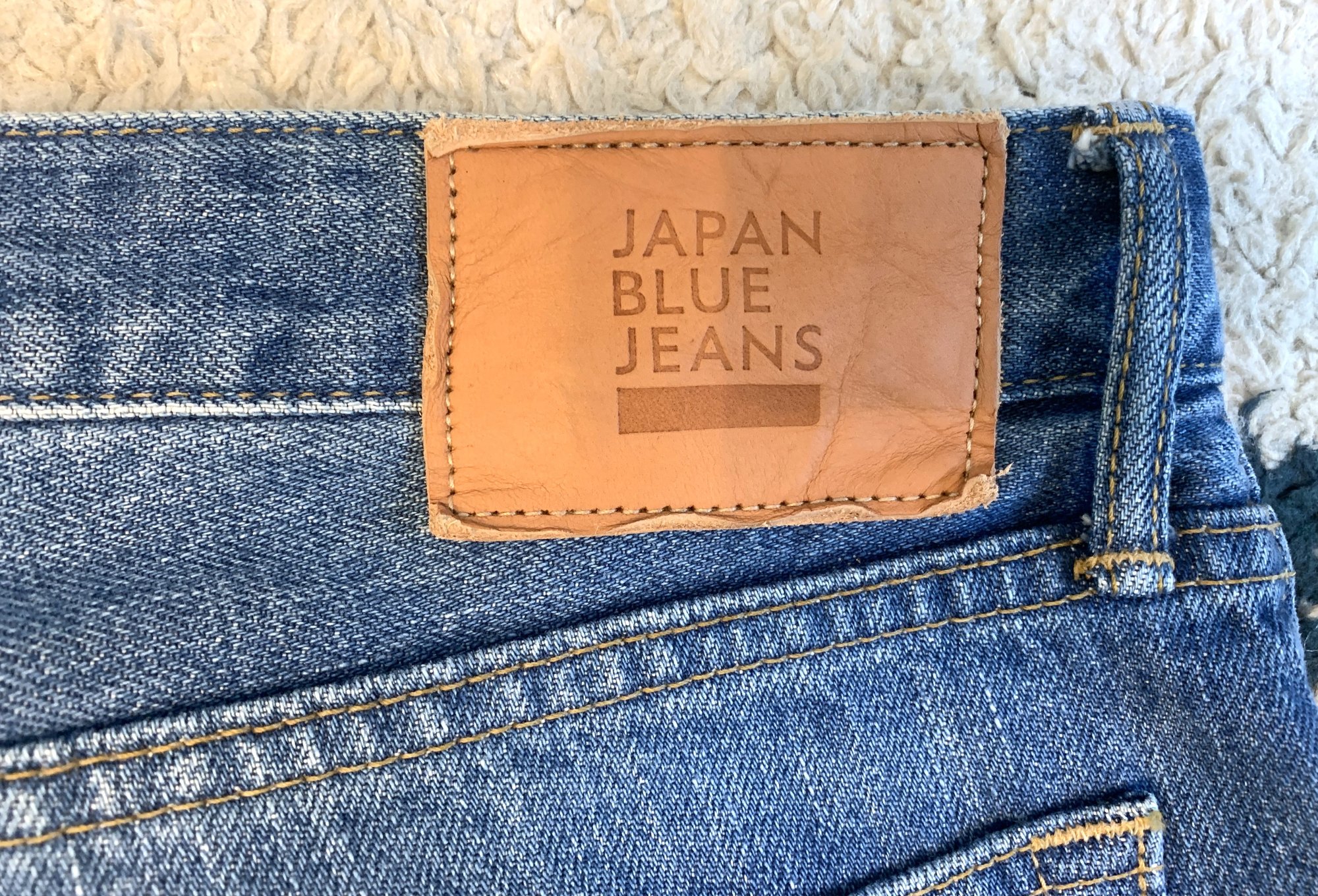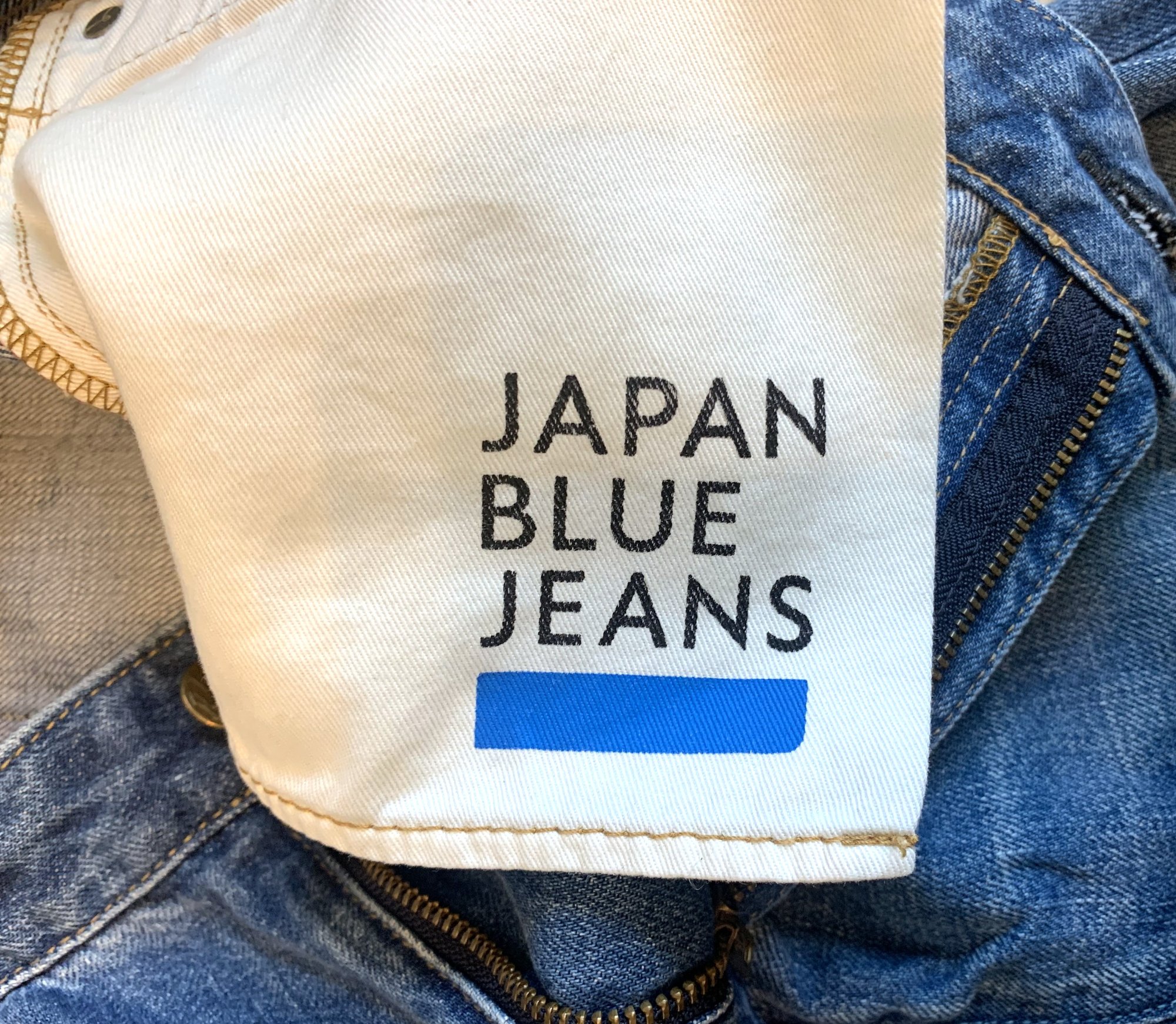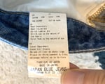 For sale here is a pair of pants from the Japan Blue jeans label. Japan Blue is one of the lines manufactured by Rampuya, the same company that does the Momotaro label. Both labels are very strongly jeans and indigo oriented, producing exclusively in the Kojima area of Japan, although the Momotaro label is probably more widely known and releases a fuller range. Japan Blue focuses mostly on jeans and denim jackets, but the same high quality production standards are still very much there, as are the really detailed and unique fabrics.