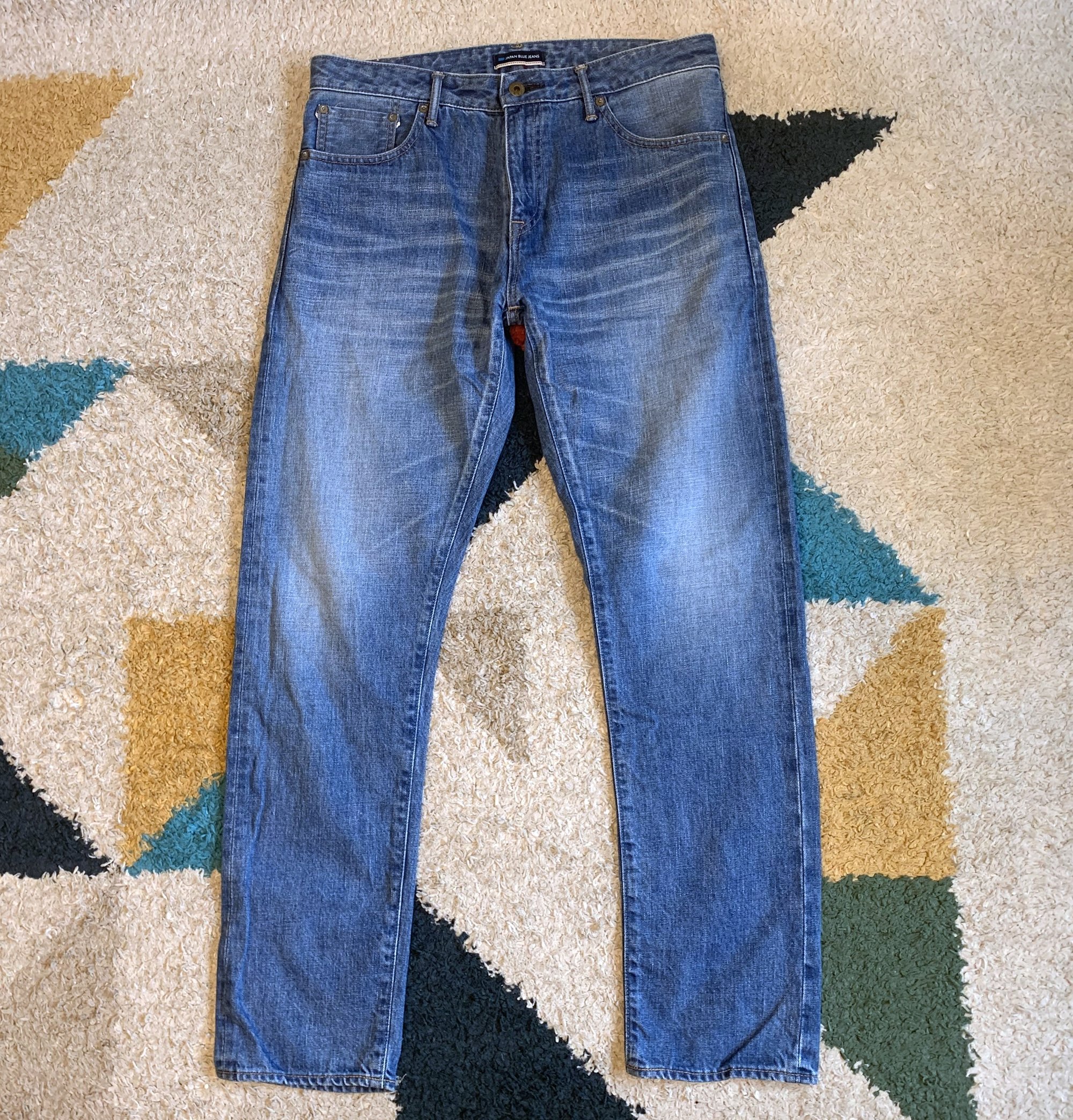 Size is labeled a 33 and fits true. I measure the waist 33” / 85cm, inseam at 30” / 78cm, rise at 10.5” / 27cm and opening at the bottom of the leg at 7” / 16cm. The pants come in lightly used, very good shape with no holes, tears, stains or fading of the indigo beyond its original wash. Made in Japan.