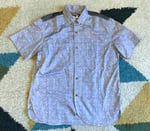 Size is labeled a large and fits somewhat relaxed. I measure the chest at 23” / 58cm, shoulders at 19” / 48cm, and length at 30” / 76cm from the base of the neck. The shirt comes in lightly used, excellent shape with no holes, tears or stains. Made in Japan.