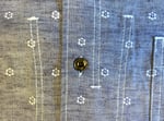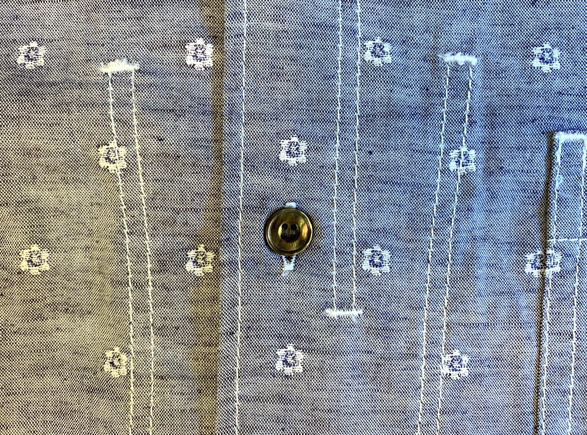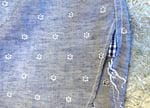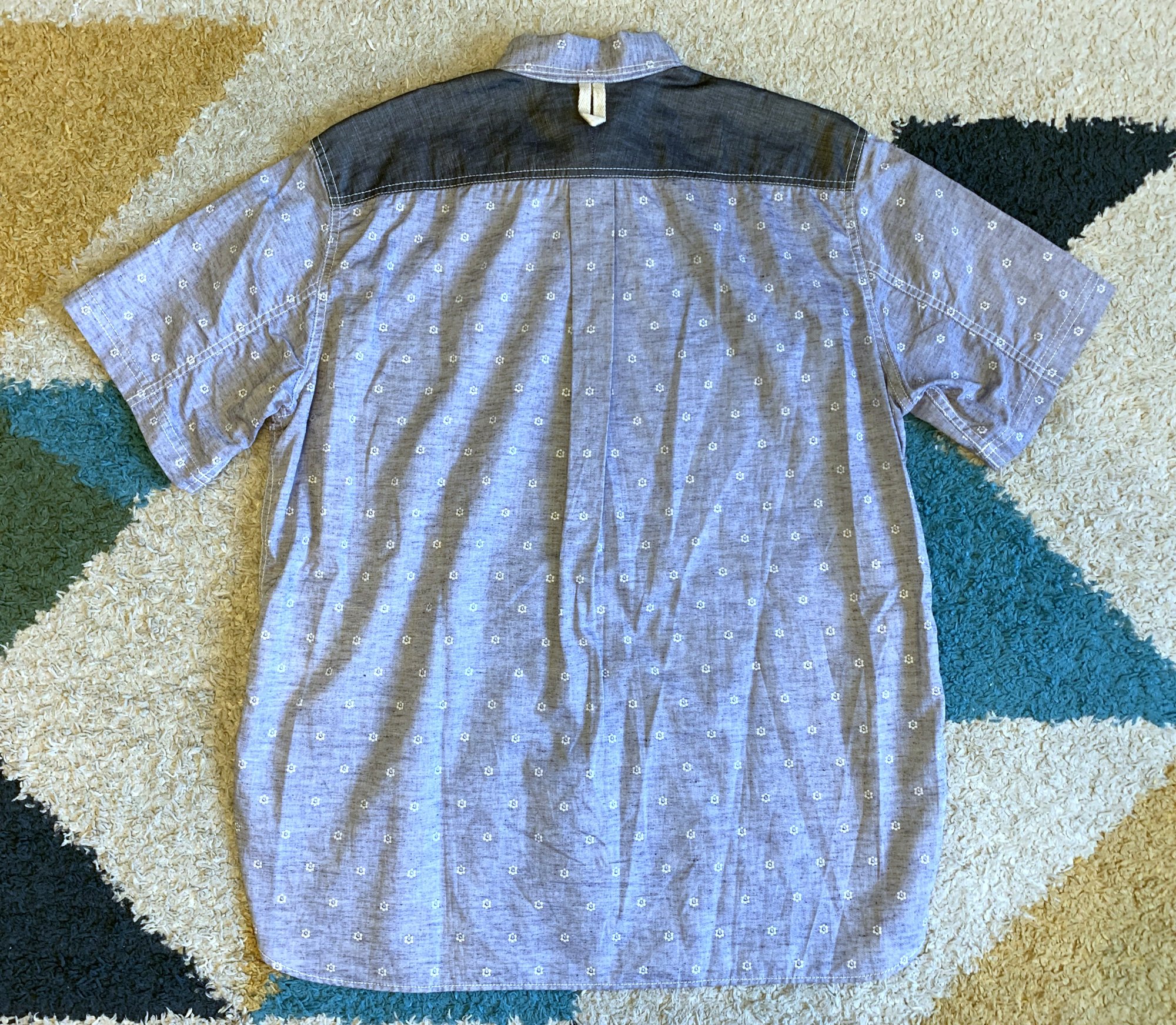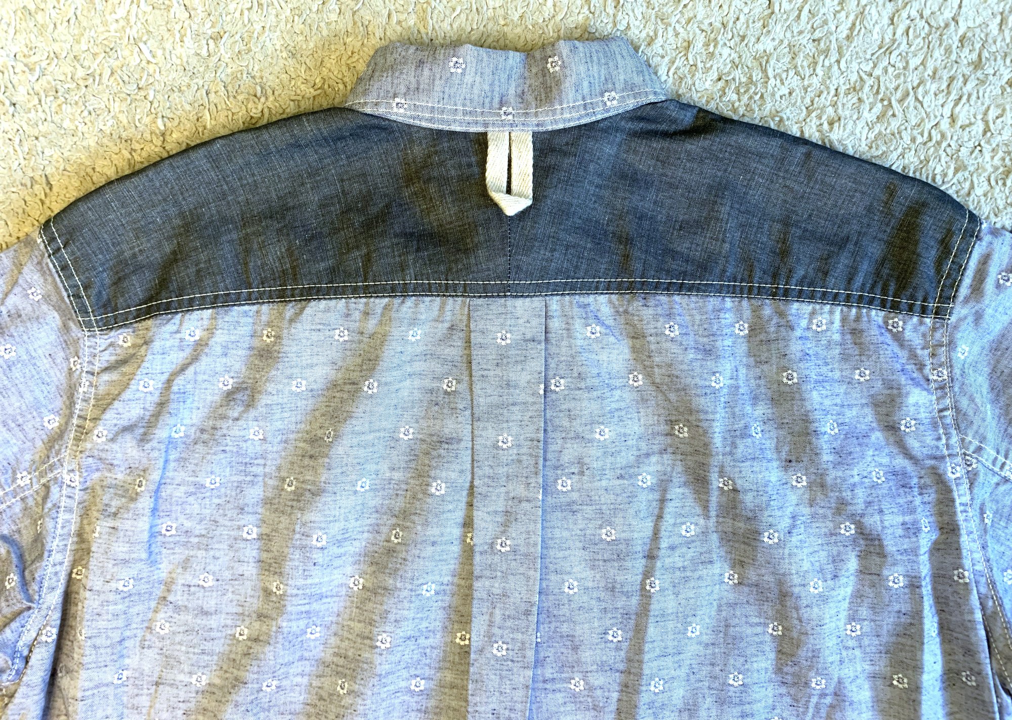 The main material here is an indigo dyed chambray fabric, coming in a 75% cotton / 25% linen blend, with an embroidered flower motif throughout. This is already a high quality fabric and has been given the patchwork treatment. Silhouette is based on the classic short sleeve work shirt but has been tweaked a fair amount. The button placket, for example, opens up toward the bottom and has some interesting white stitching on both sides. That stitching incorporates some interior reinforcements in a different fabric, only visible when it is not being worn. Rear shoulders have a different, solid indigo chambray fabric along with a white canvas pull, while the side gussets use a third plaid fabric.