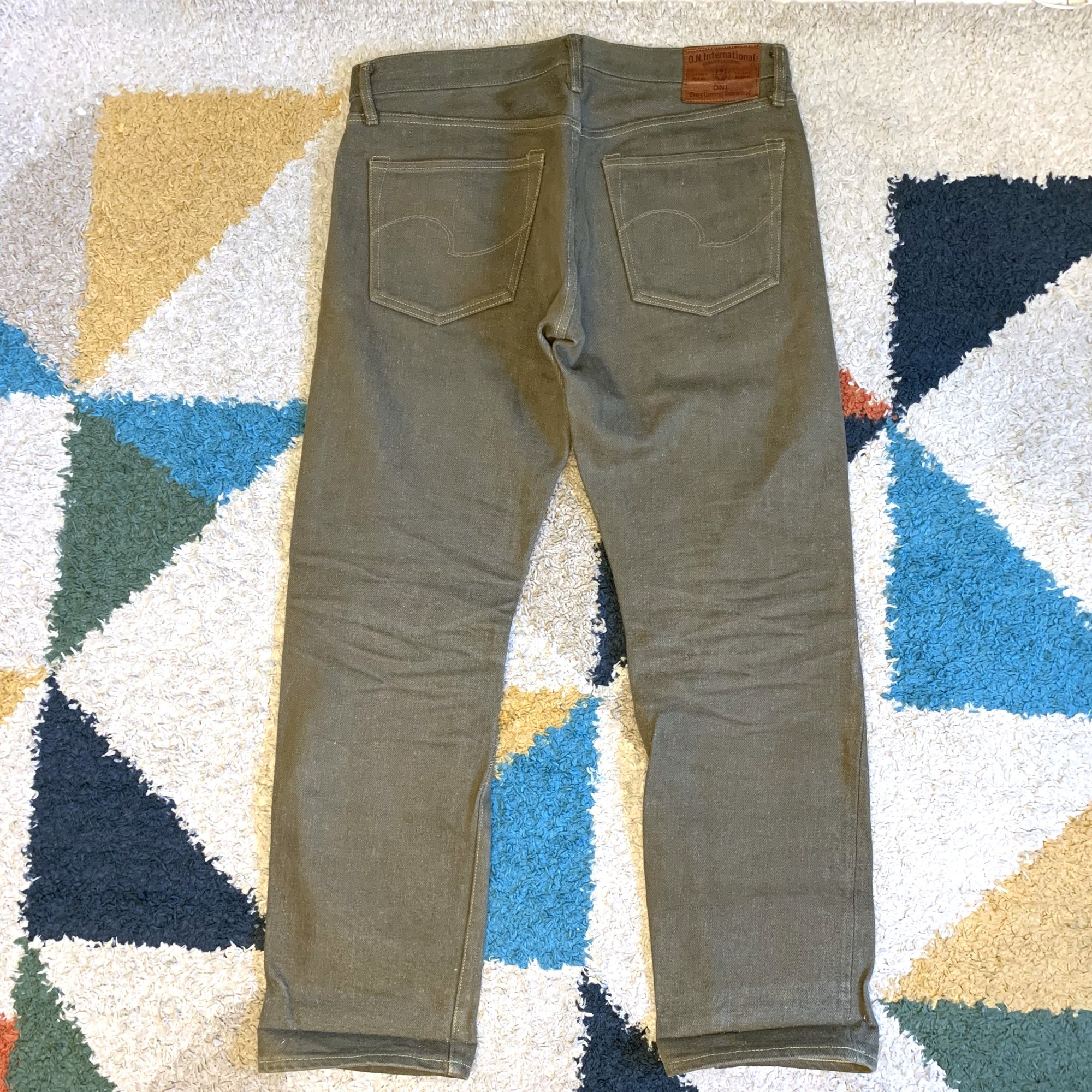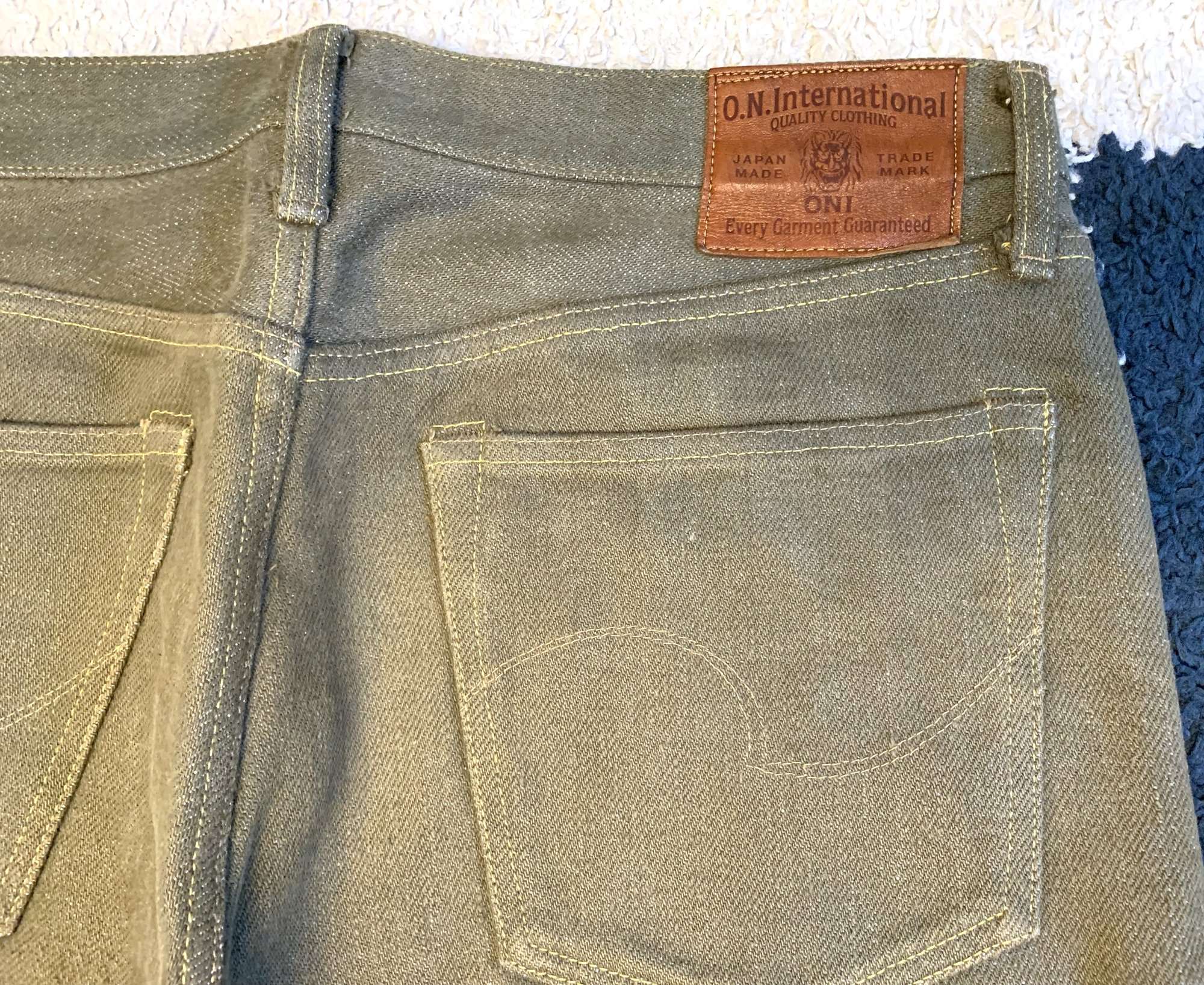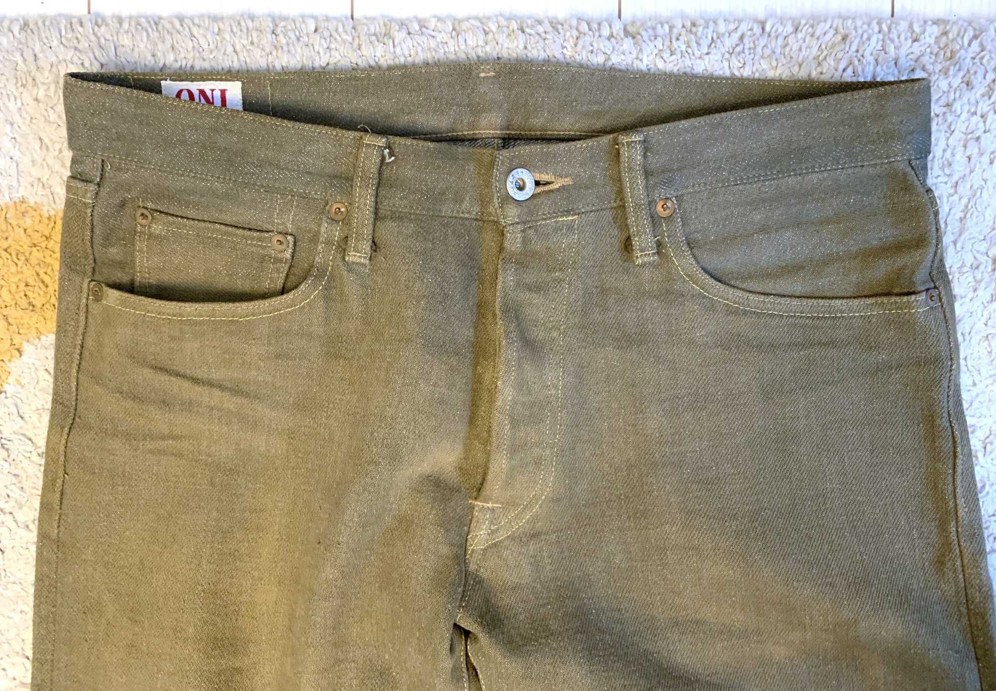 This is Oni’s 527 model “secret denim”, done in this case in a green dye rather than their typical indigo blue. Oni’s secret denim is a pretty heavy 20oz highly slubby piece of denim. While the weight is heavy it is a low gauge denim, giving the material a pleasantly uneven feel and a whole lot of character. The low gauge also makes it more breathable and comfortable. The denim is good for year-round wear, although may be best avoided during the middle of the summer. Secret denim is a proprietary fabric totally unique to the Oni label. You won’t find this kind of denim anywhere else.