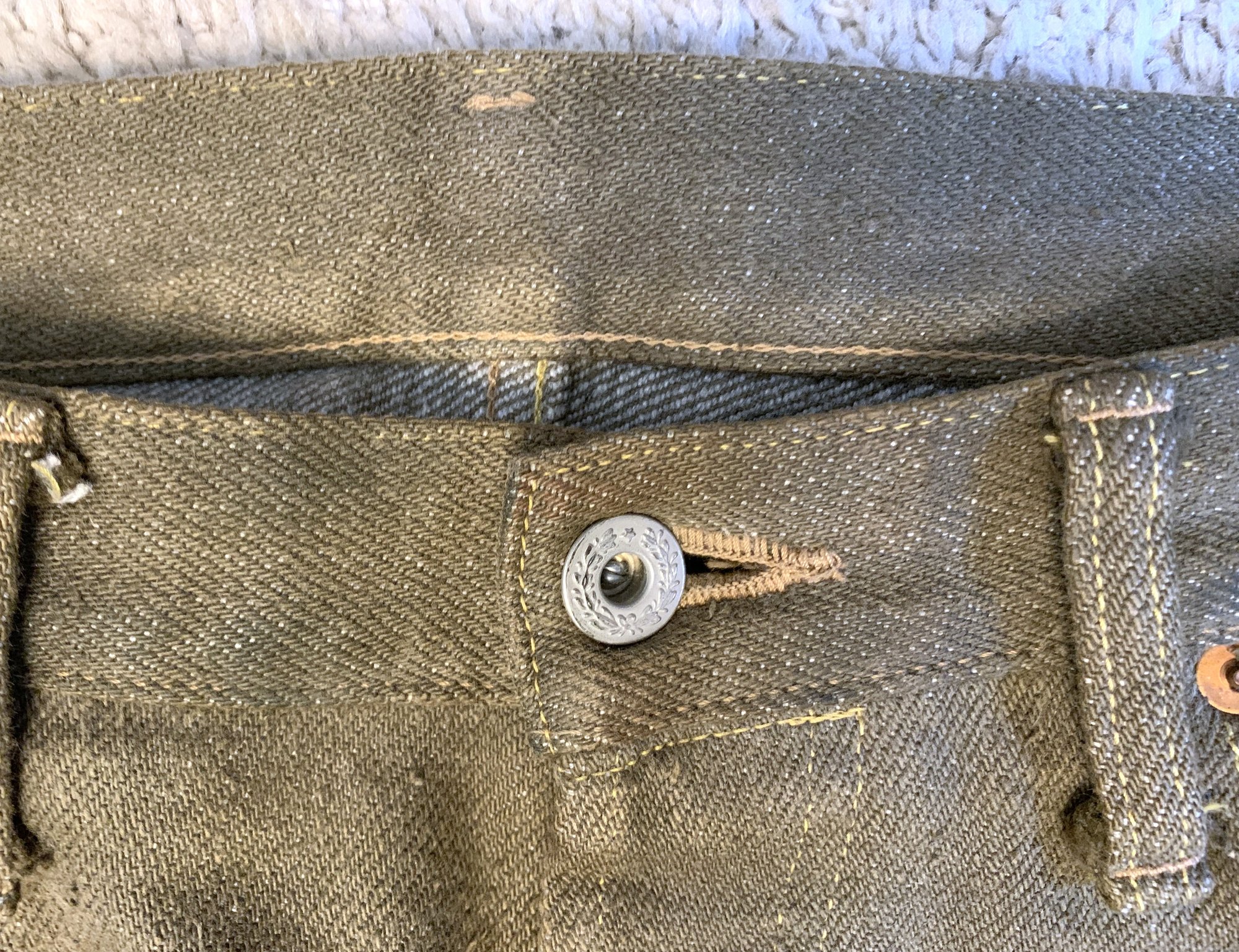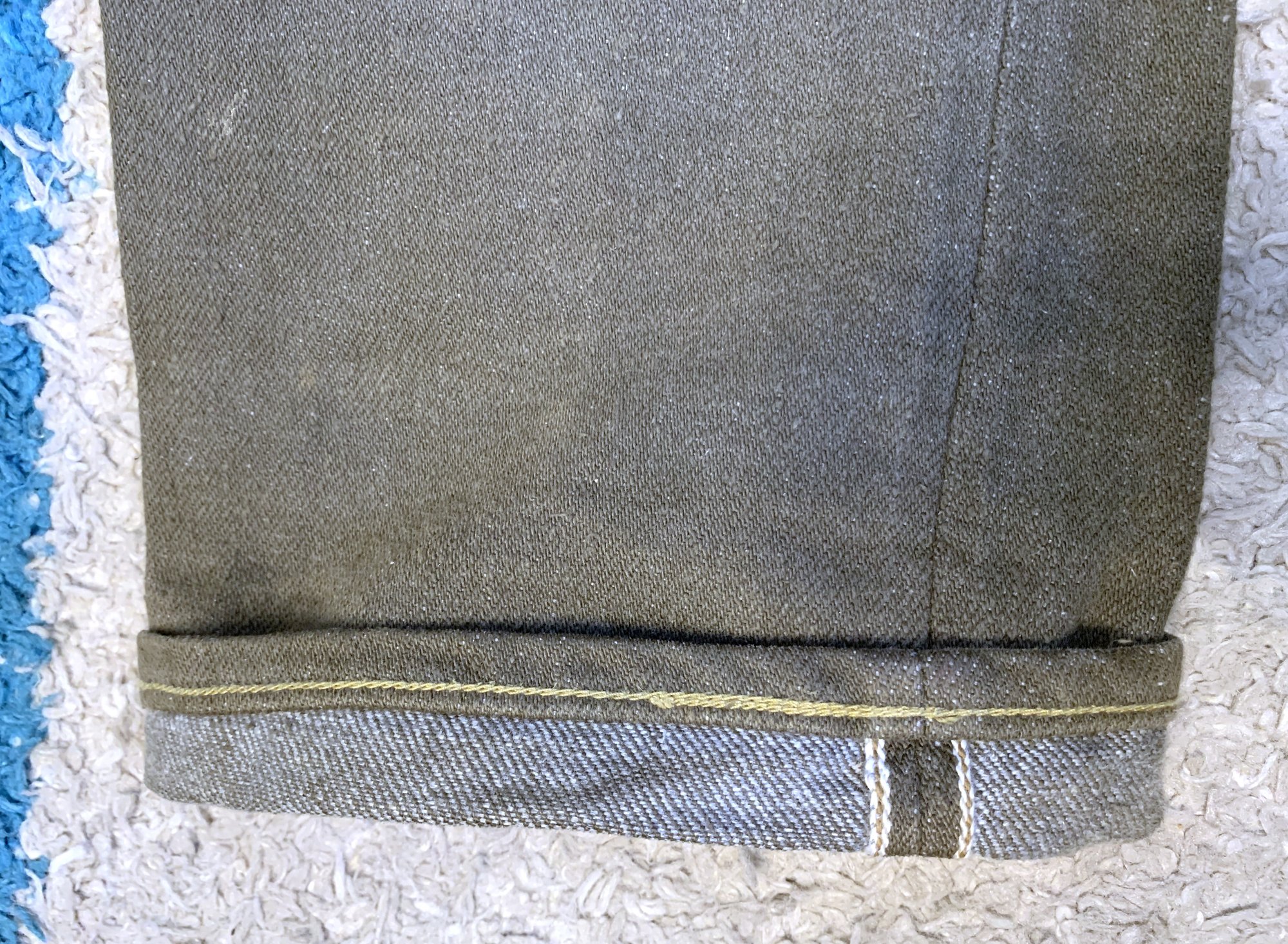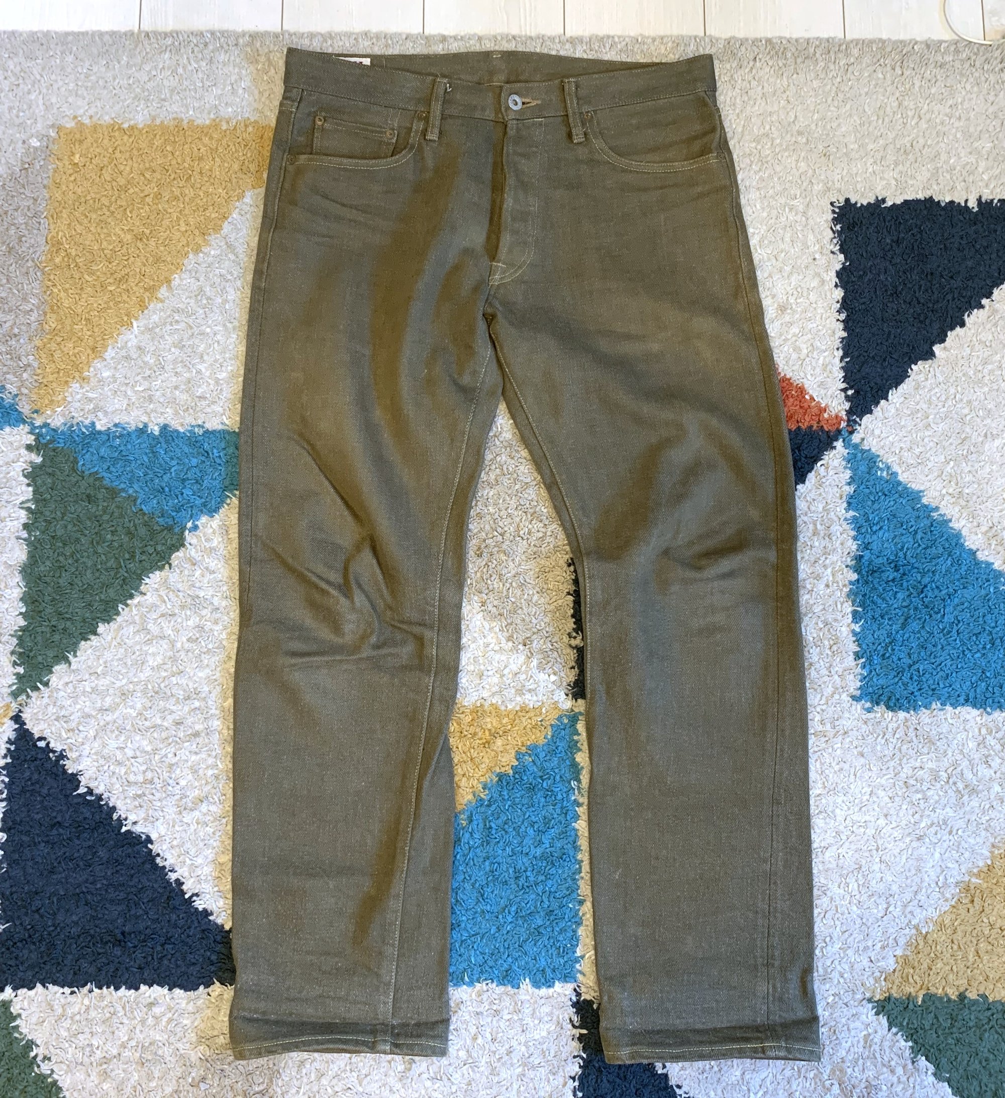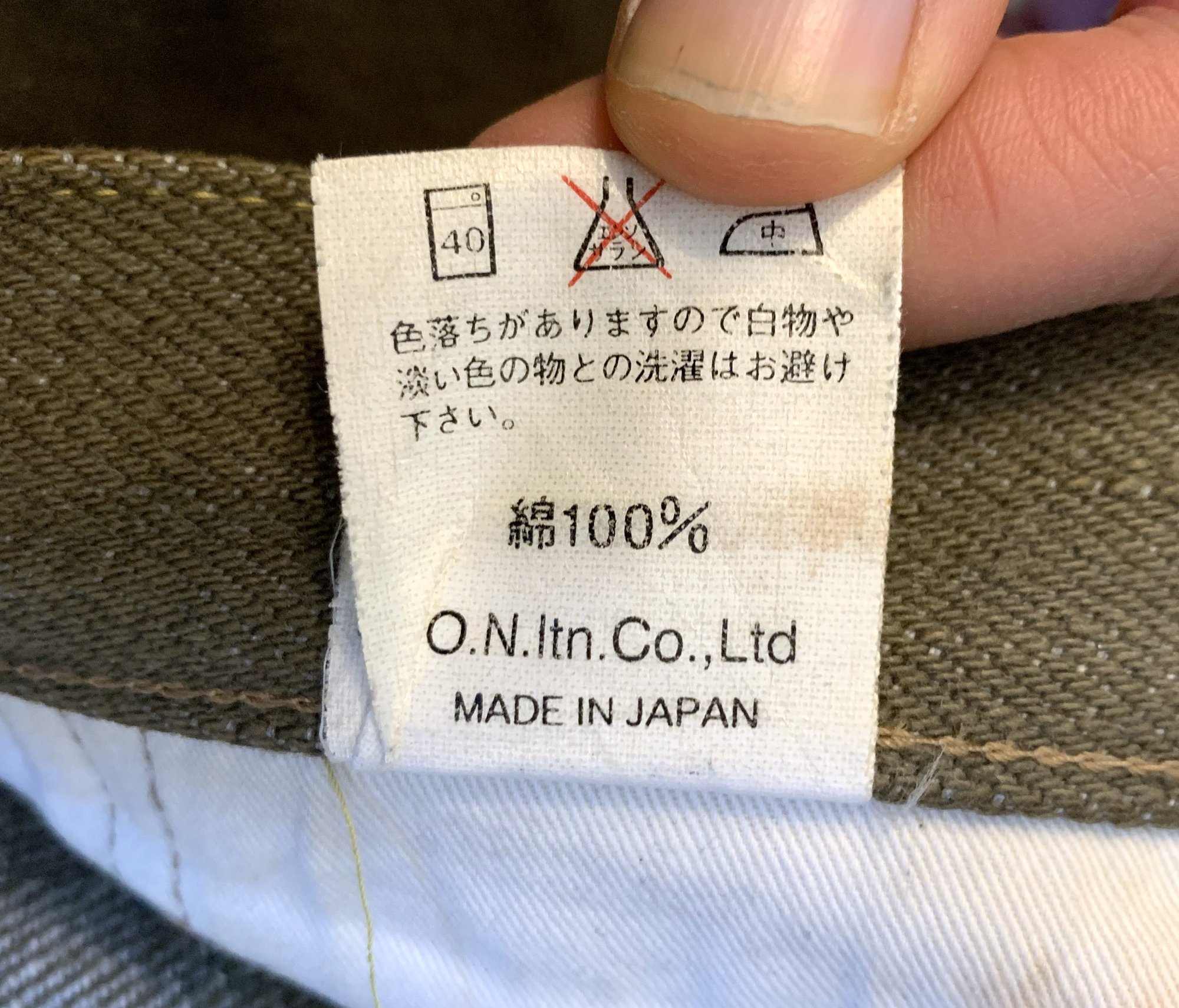 This is Oni’s 527 model “secret denim”, done in this case in a green dye rather than their typical indigo blue. Oni’s secret denim is a pretty heavy 20oz highly slubby piece of denim. While the weight is heavy it is a low gauge denim, giving the material a pleasantly uneven feel and a whole lot of character. The low gauge also makes it more breathable and comfortable. The denim is good for year-round wear, although may be best avoided during the middle of the summer. Secret denim is a proprietary fabric totally unique to the Oni label. You won’t find this kind of denim anywhere else.