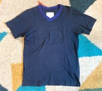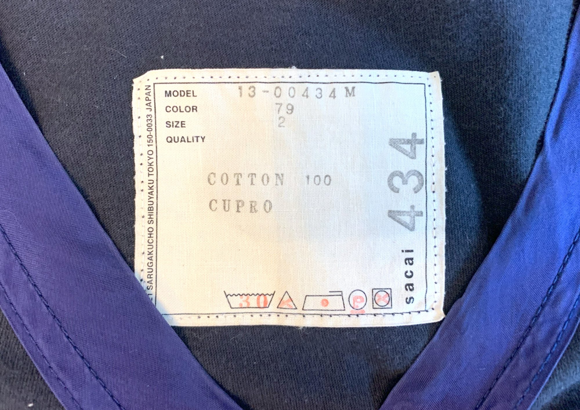 What we have here is Sacai’s pretty unique take on the classic tee. Abe seems to really enjoy doing different variations of these tees, as Sacai releases different iterations each season. It’s similar to what Yohji Yamamoto does, with his endless variations of the classic black blazer (and black tees for that matter). In this case we have a very high quality, light weight knit cotton fabric done in a dark navy blue. Being Sacai, there is a bit more going on here than originally meets the eye. For one, the neck line is done in a lighter weight cupro fabric. More interesting is the sleeve construction. This is not a standard sleeve silhouette, where if you notice on the detailed pics the underarm seam curves around, where there is no actual armpit seam.