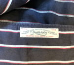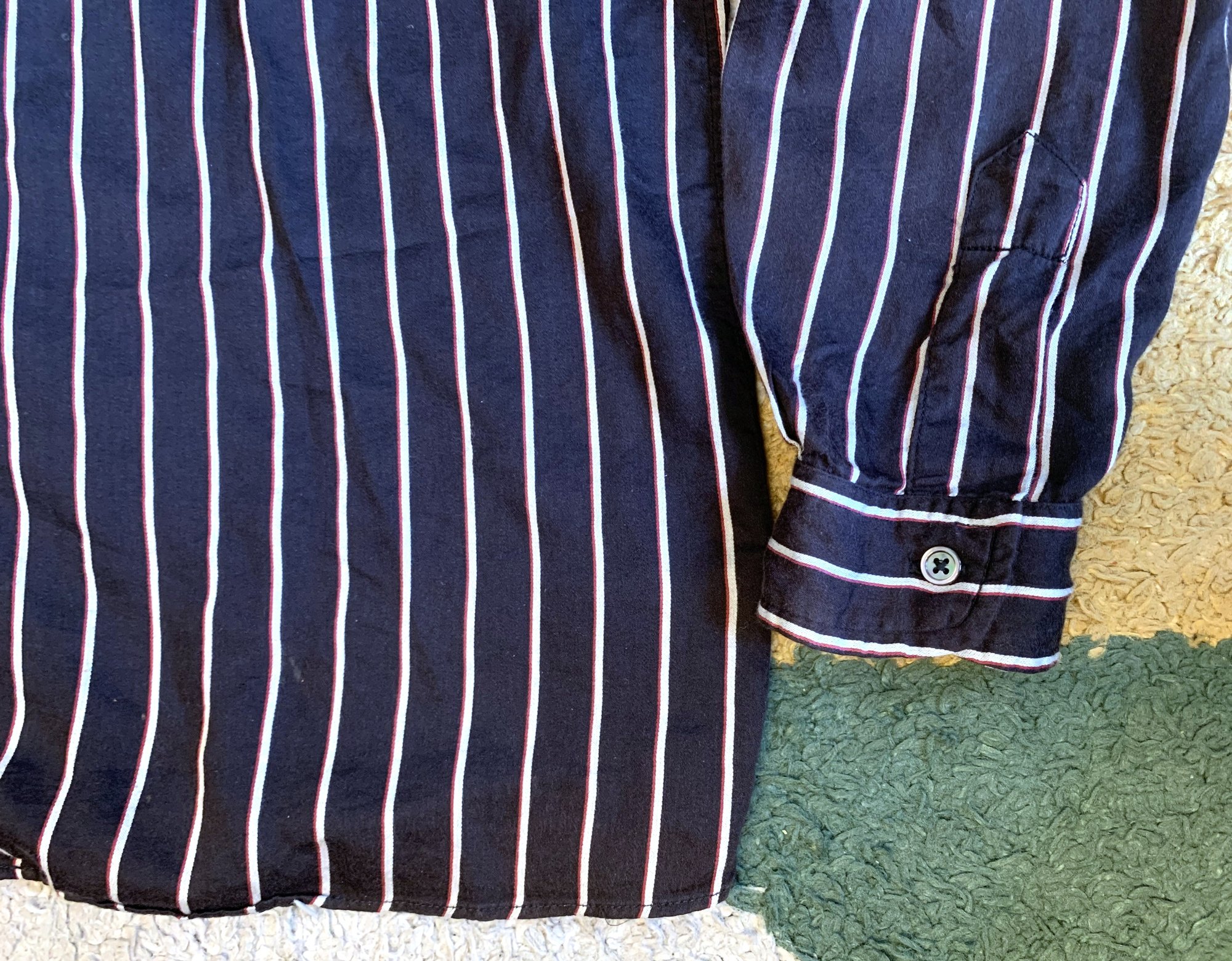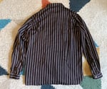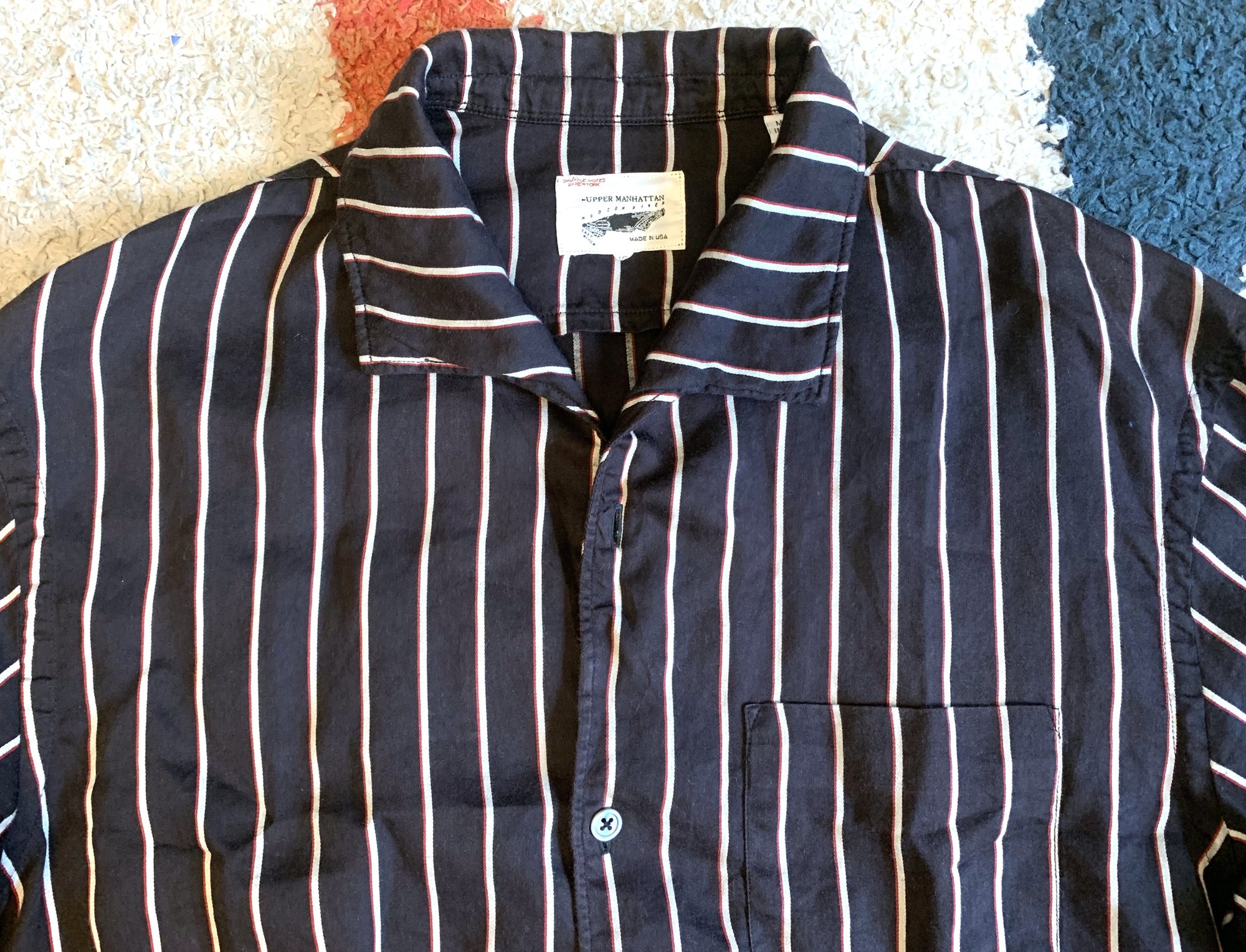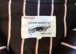 Shirt is a very well made 62% cotton, 38% Tencel (rayon) fabric blend in black with red and white stripes. The Tencel gives the shirt a very soft hand a pleasantly uneven feel. I would expect that this is Shuttle Notes’ original fabric, put together in the US, most likely at one of the factories that produces Engineered Garments and other Nepenthes pieces. Fit is relaxed, with a flat hem and open collar detail.