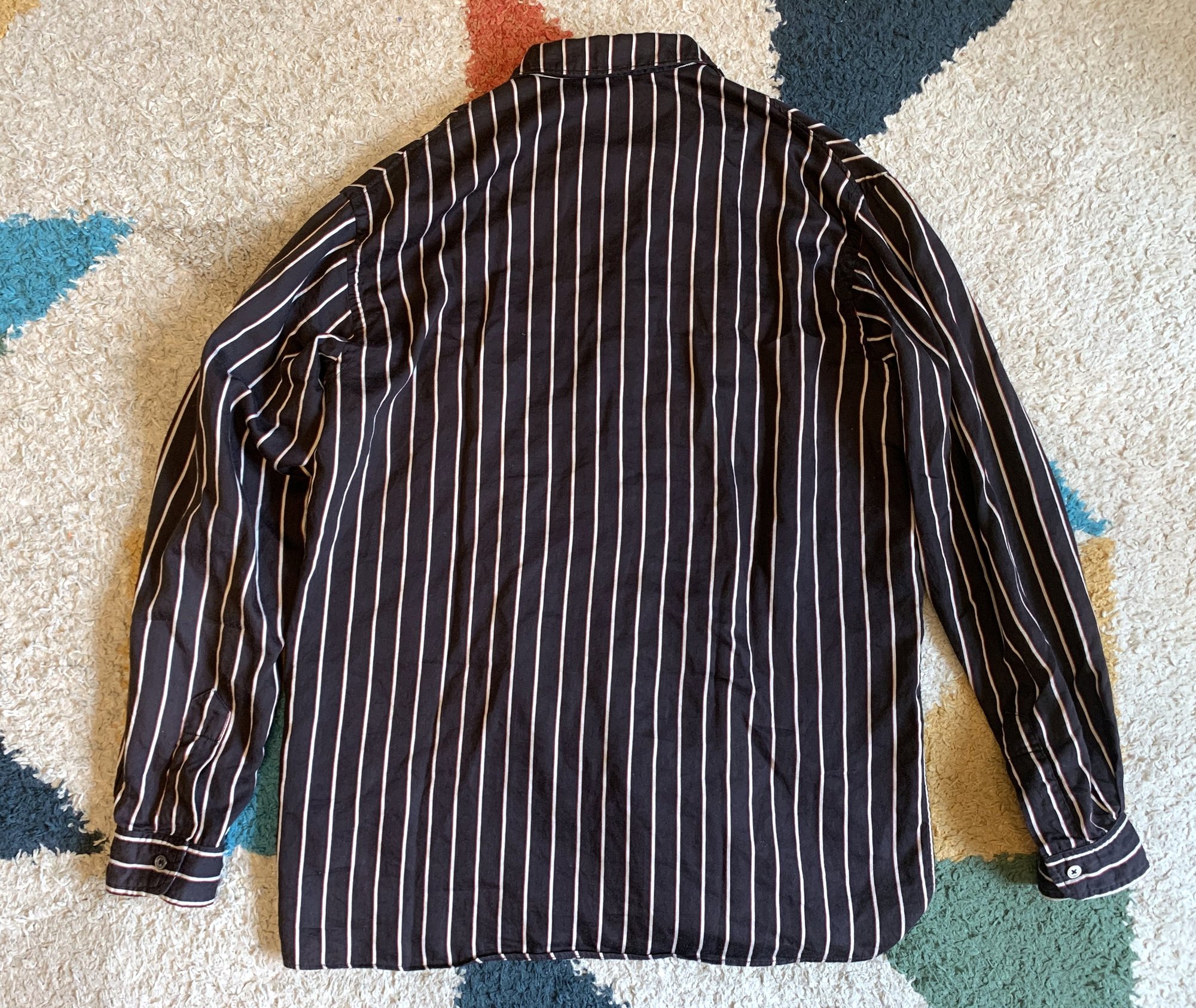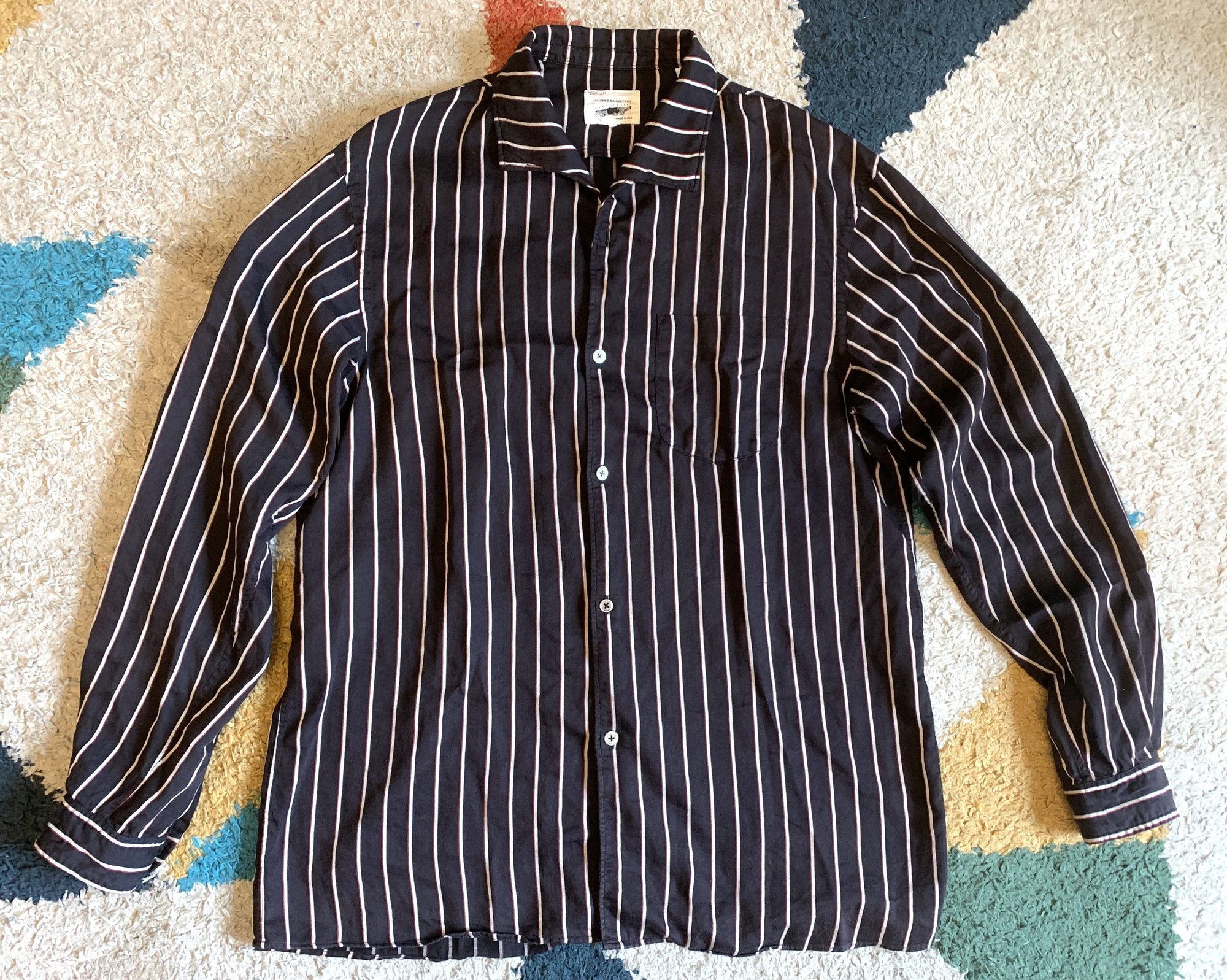 Size is labeled a 15 / medium and fits relaxed. I measure the chest at 21.5” / 55cm, shoulders at 18” / 47cm, length at 29” / 74cm, and sleeves at 23.5” / 59cm from the shoulder. The shirt comes in lightly worn, very good shape. The only issue to note is that the top button is actually missing. It can be replaced or you can switch out one of the other buttons if you would like. Otherwise no holes, tears or stains. Made in USA.