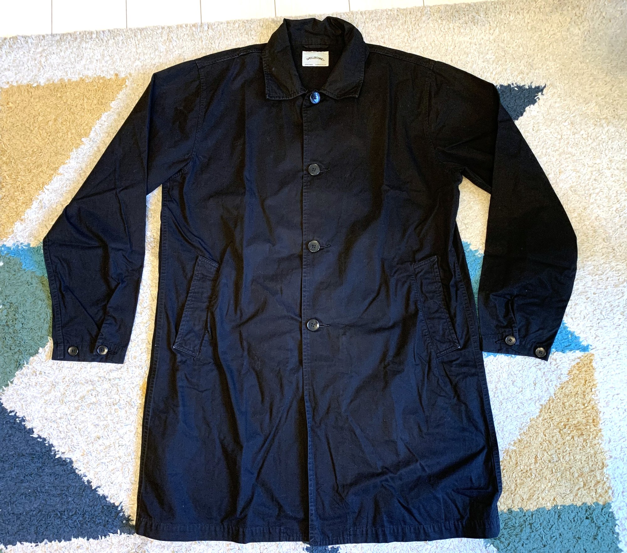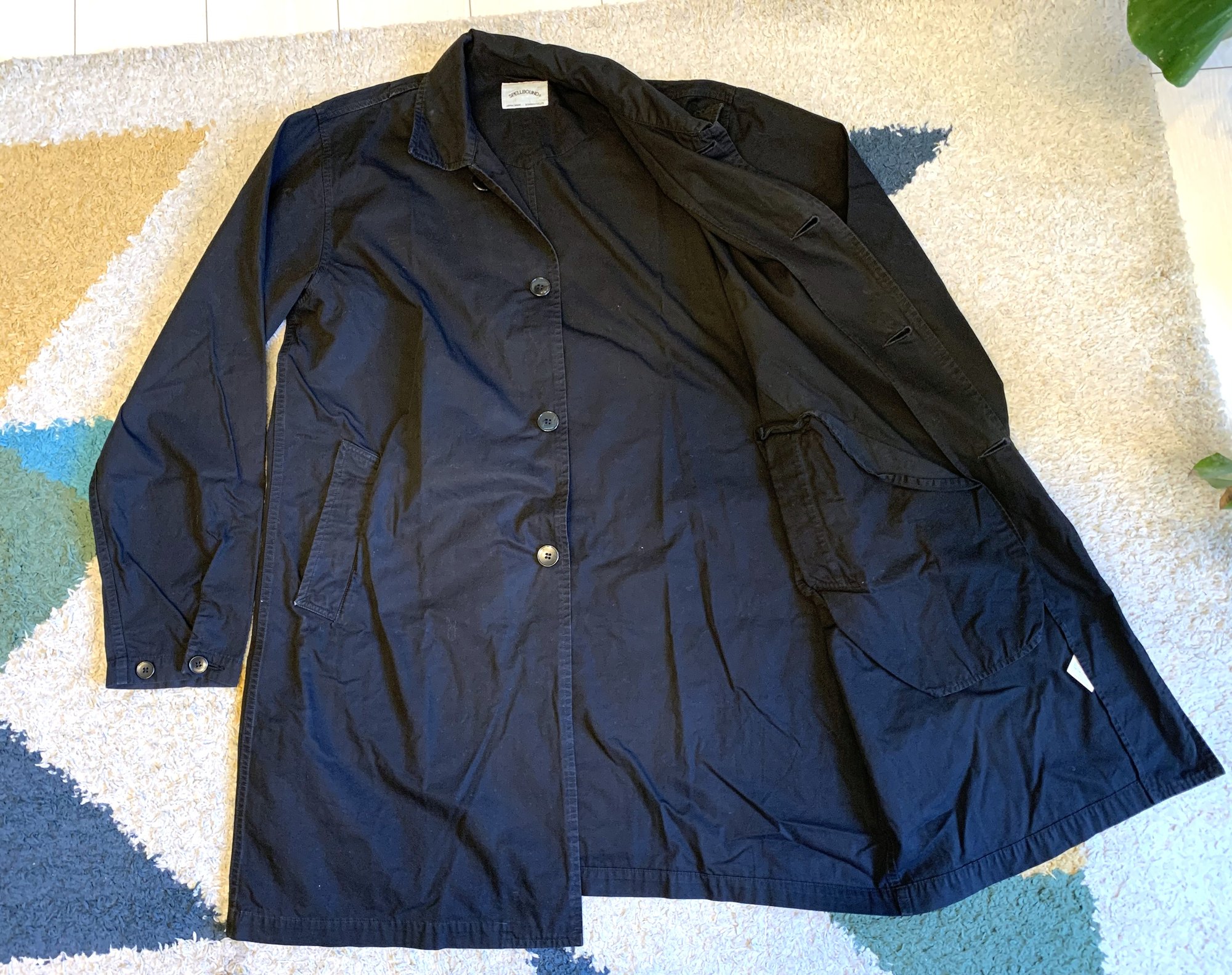 Size is labeled a 2, normally a medium but with a relaxed fit as noted. I measure the chest at 23” / 58cm, shoulders at 18” / 47cm, length at 36” / 92cm from the base of the neck, and sleeves at 25” / 63cm from the shoulder. The jacket comes in lightly used, very good shape with no holes, tears, stains, tears or signs of wear. Made in Japan.