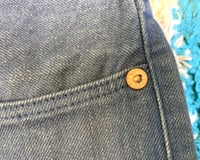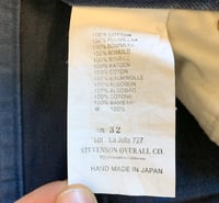 Size is labeled a 32. I measure the waist at 33”, inseam at 28”, rise at 10” and opening at the bottom of the leg at 8”. The pants come in lightly used, very good shape with no holes, tears or stains and only minimal fading of the indigo. Made in Japan.