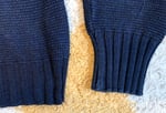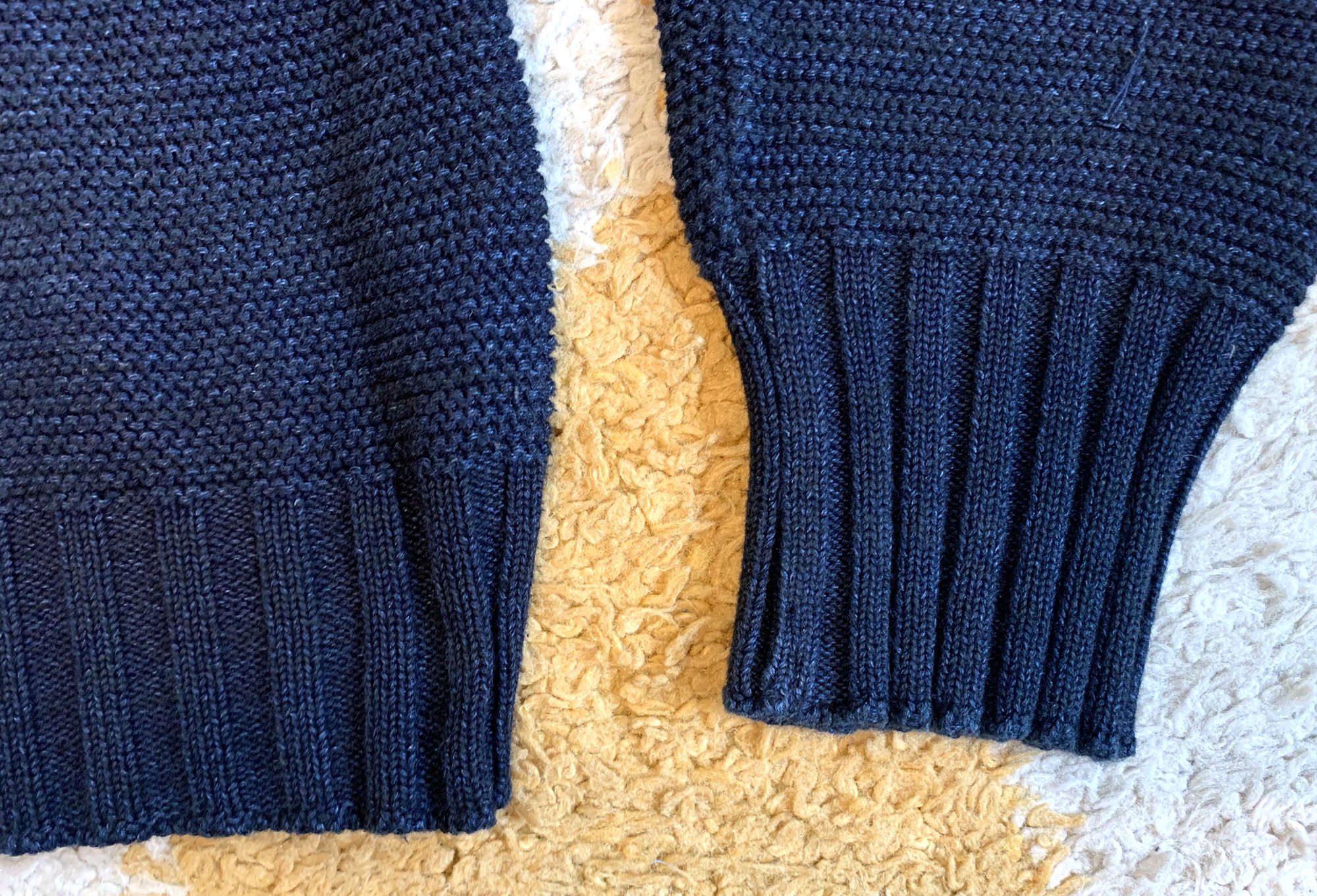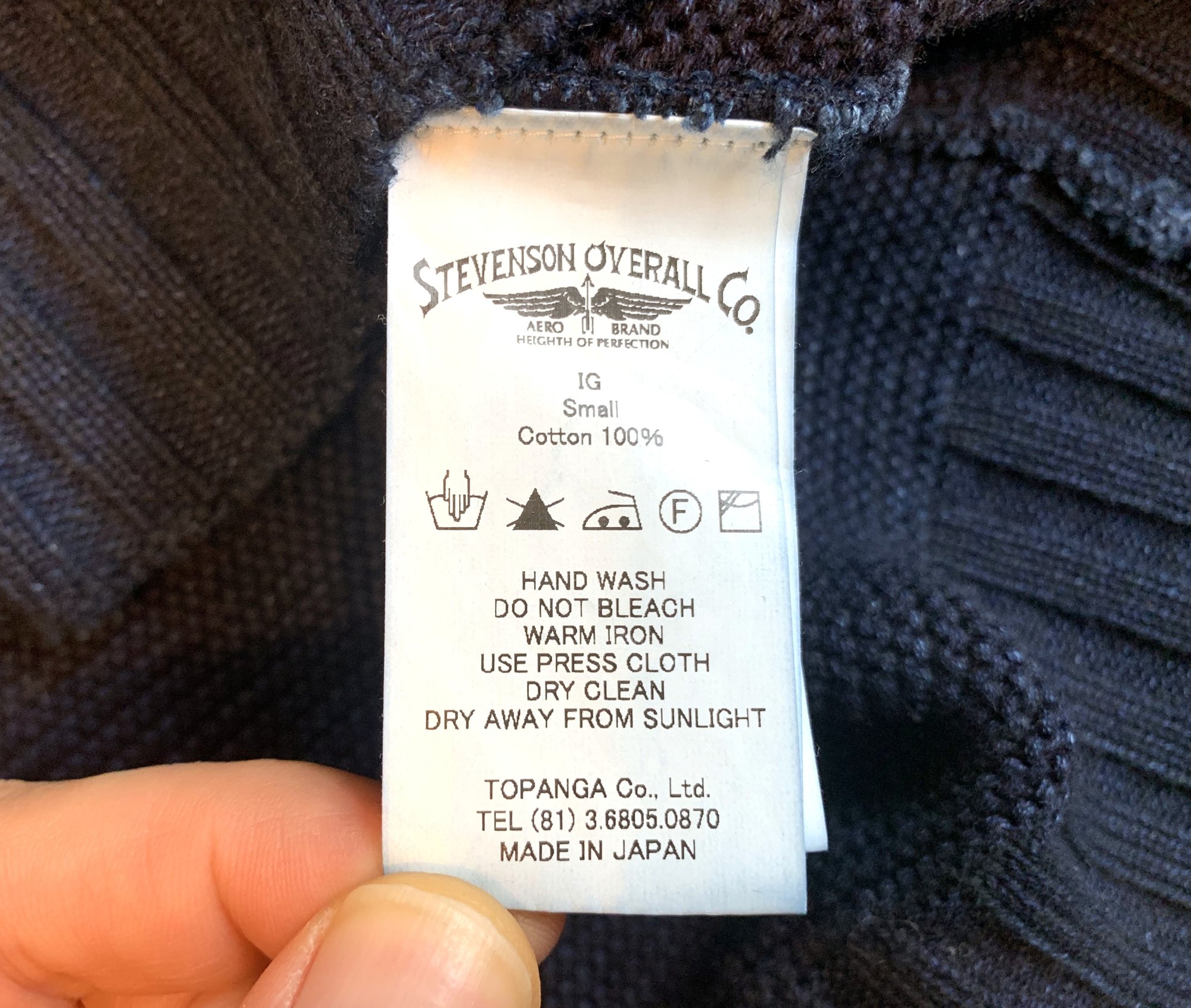 Up for sale here is an indigo dyed sweater from Stevenson Overall Co. is another one of those Japanese “American causal” labels. They make a number of nods to old-time clothes, taking elements from early functional clothing (including workwear, military and outdoor clothing) and mixing them with their own unique take. It’s a similar approach to what Mister Freedom does, although for Stevenson Overall it strikes me as more workwear-oriented, rather than the more military-inspired flavor Mister Freedom often has. Either way, as you can probably expect, these are produced to exacting specifications with excellent quality and attention to detail.