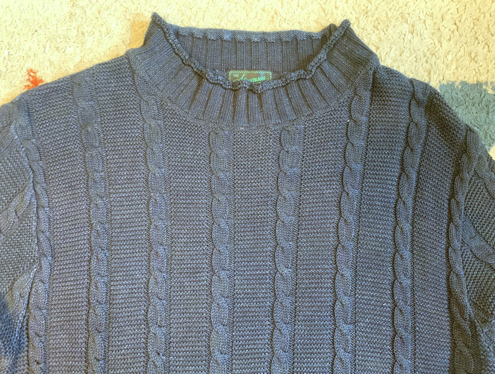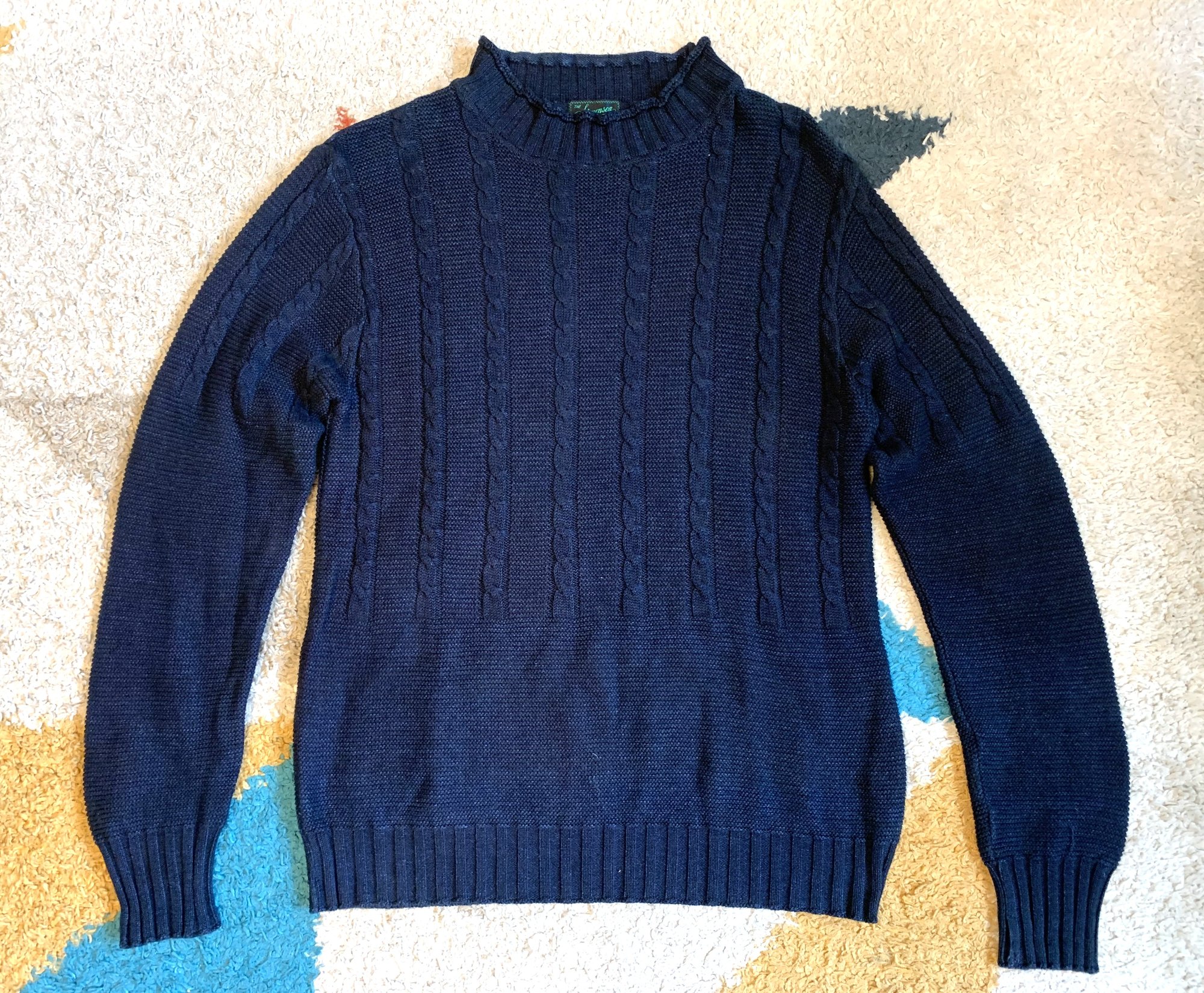 Size is labeled a small and fits a bit loose, between a small and a medium in my opinion. There is a bit of stretch to the fabric but unstretched I measure the chest at 20” / 50cm, shoulders at 17” / 45cm, length at 25” / 65cm and sleeves at 25” / 64cm from the shoulder. The sweater comes in lightly used, very good shape with no holes, tears or stains. Made in Japan.