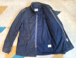 So what we have here is a pretty unique take on the classic military M65 field jacket. Studio d’Artisan have a long history of doing the classics, and you can get some really excellent straightforward jeans and jackets from them, but they also do some really unique interpretations of the classics, which are arguably more interesting. In this case the silhouette follows the original pretty closely, but adds some interesting details. For one, the material is a navy blue cotton, definitely not the standard military-issued green colorway, but also something that sets it apart from the crowd. Perhaps more interestingly, the fabric has been paraffin coated to make it highly water resistant. This gives the jacket some useful practical applications, working well in rain or shine.
