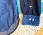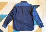 Size is labeled a medium and fits true. I measure the chest at 21” / 53cm, shoulders at 18” / 46cm, length at 26.5” / 67cm in front and 28” / 71cm in back, both from the base of the neck, and sleeves at 24” / 61cm from the shoulder. The shirt comes lightly used, very good shape with no holes, tears, stains or obvious fading of the indigo. Made in Japan.